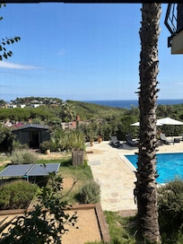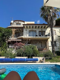 A beautiful mexicano-californian style house with 2 fully equipped independent spaces spread over 3 floors + pool level. Main floor totally renovated in 2025 (+air con). Large pool (10x5m) Large terrace for lunches and dinners. Plancha + bbq. Table Tennis. Pétanque. View over the sea and Torre Valentina hill. 1km from beaches. Quiet neighbourhood.