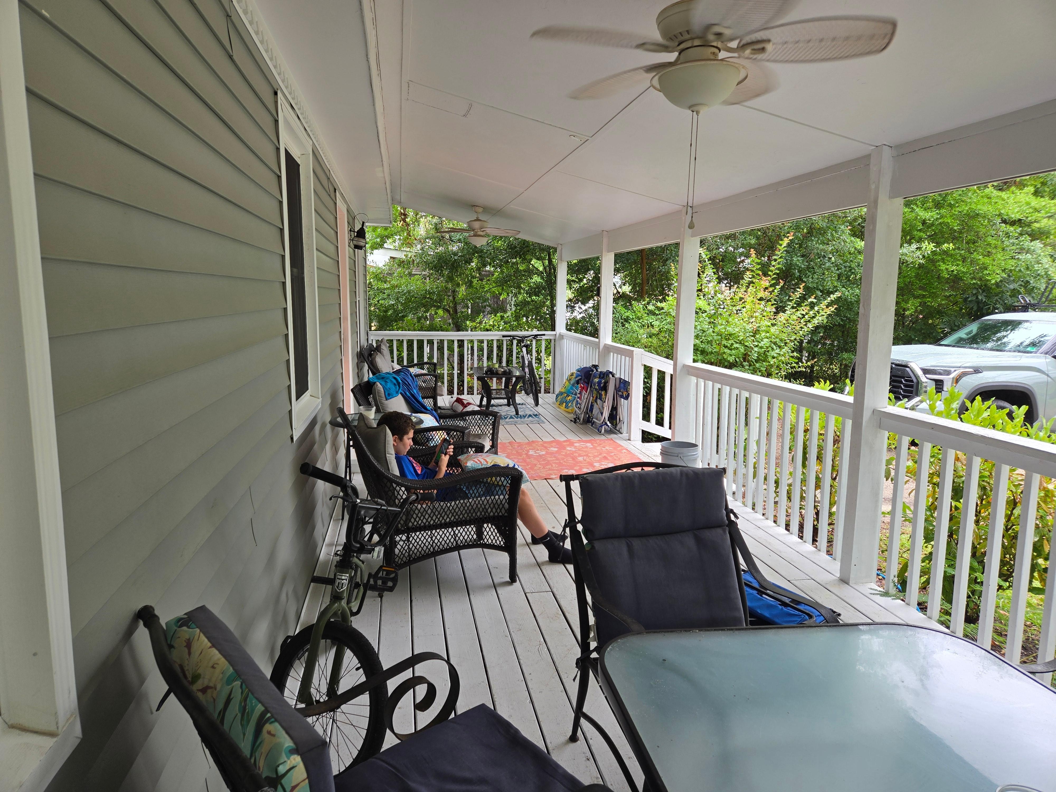 The front porch is perfect for sipping your morning coffee or sharing a meal together. There are two ceiling fans to keep cool in the shade.