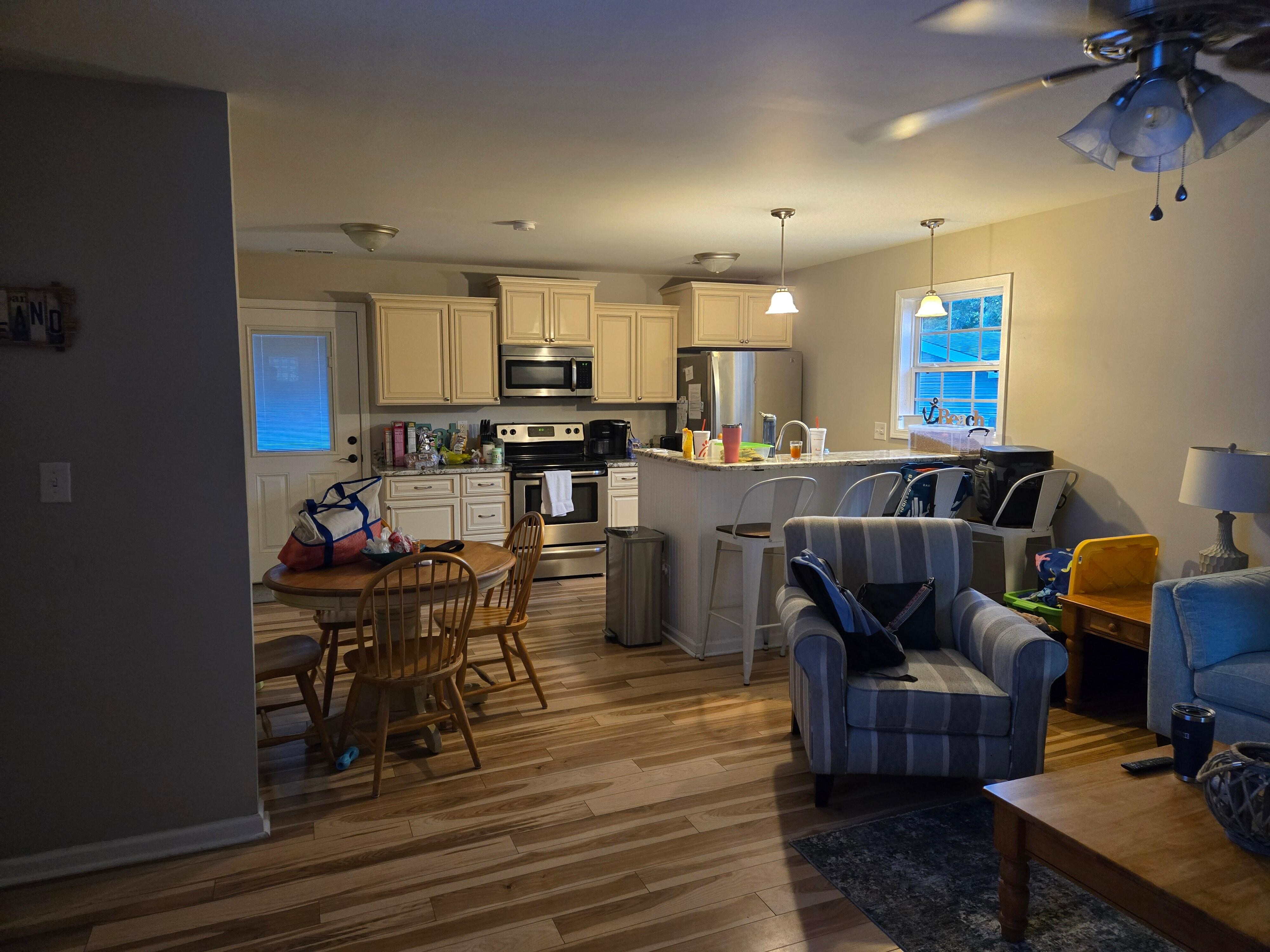 Upon entering the house you’ll be greeted with an open living/dining area with a smart TV so that you can access any streaming service. WiFi is available throughout the house. The kitchen has room for up to 8 with a table and barstools, granite countertops, and a fully equipped kitchen (Keurig, blender, pots and pans, crockpot, and even sippy cups). Both the master and queen bedrooms have smart tvs with access to login to your favorite streaming services. The master bathroom has a large shower and the hall bathroom has a bathtub/shower combo.