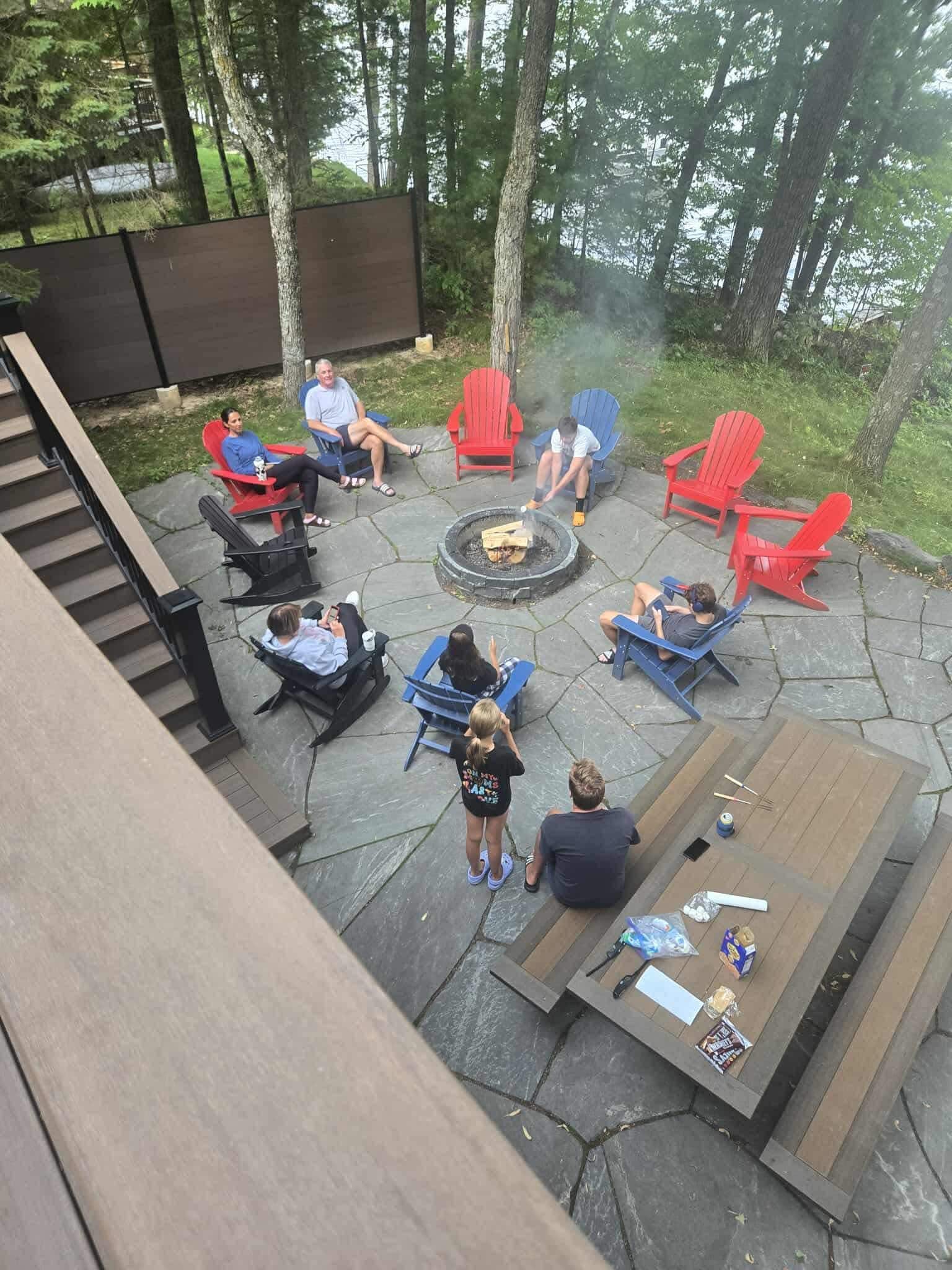 There is a wood burning fireplace upstairs, a gas fireplace downstairs and a fire pit outside. There is also a 4-person sauna in the basement.