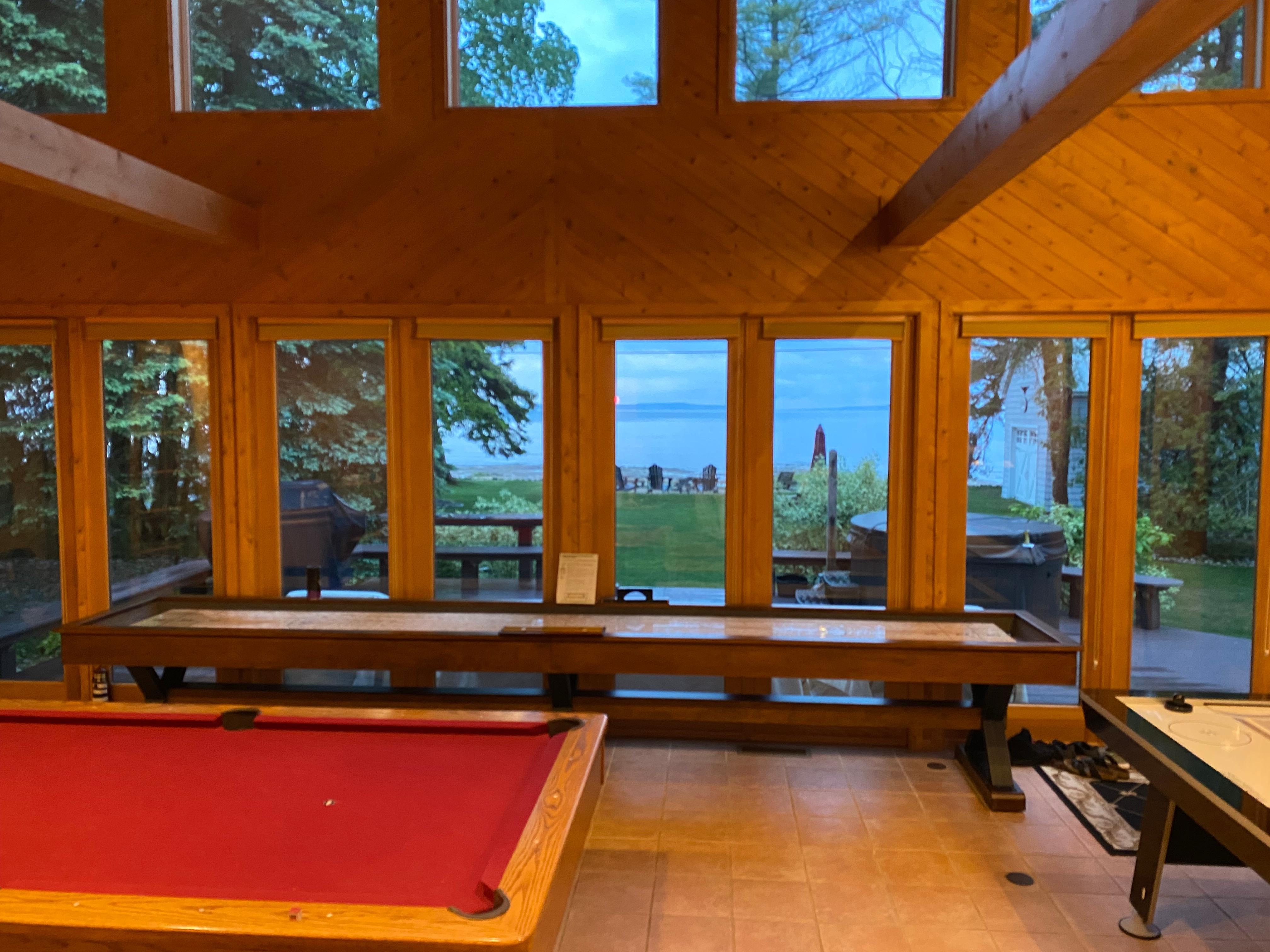 This beautiful property is located on Lake Huron with a 100' sandy beach just 3.5 miles south of Mackinaw City. Over 3000 sq ft with a spectacular great room looking across the straits at Mackinaw Island equipped a 16' Playcraft Shuffleboard table, 8' Olhausen Pool table, air hockey, foosball, and arcade game table! Gas fireplace and a smart tv with fully stocked kitchen. Hot tub on the deck! Barrel Sauna! Enjoy bike riding (6 cruiser bikes included!) on the state maintained bike trail across the street and even take them to the island for free (bike licenses included). Like the water? A tandem kayak/ 2 single kayaks/ 2 paddleboards also included! Enjoy the nights with family and friends around the fire pit (eight camp chairs/ four Adirondack chairs and fire wood included)!