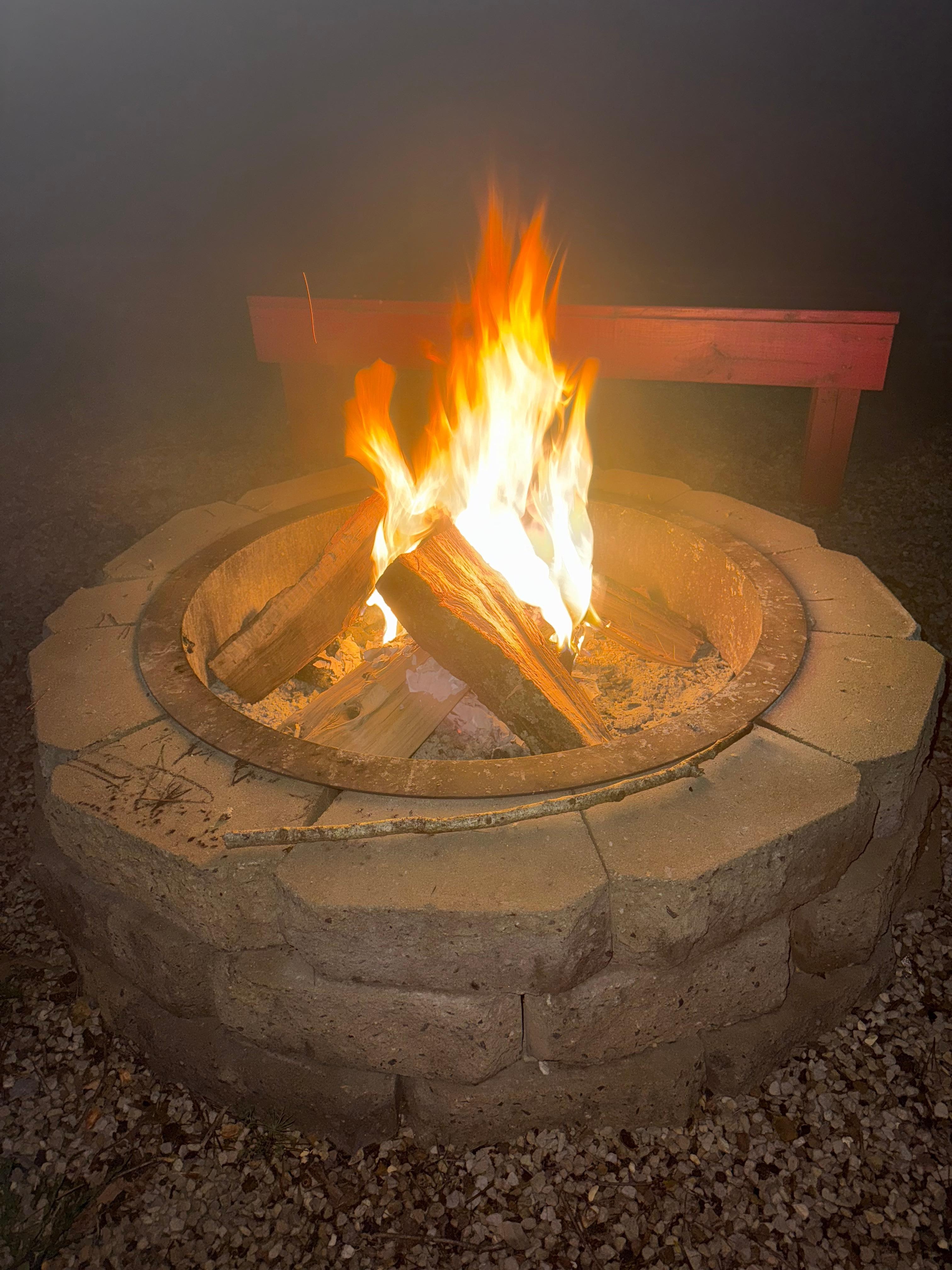 • Outside: fire pit, picnic table, charcoal grill, log swing, and cornhole game