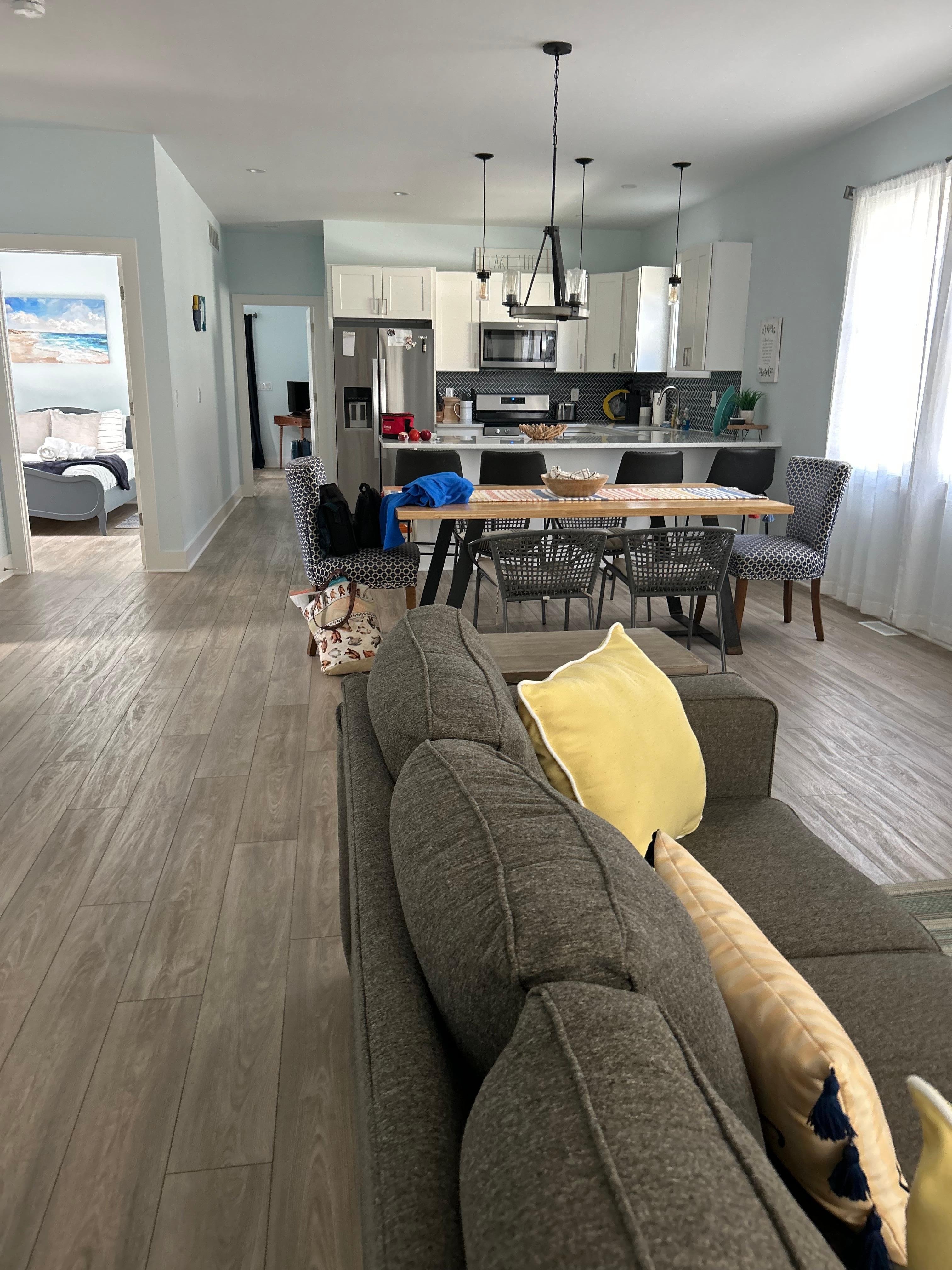 This cottage has an open layout with all bedrooms and baths on one-level. The Master Bedroom is en-suite with a King Bed and walk-in shower, and opens into a large screened porch. The other two bedrooms have Queen Beds and share a bathroom with a bathtub/shower combo. Kitchen, Dining, and Living Room are all open concept, with lots of seating options. There is also a back patio with grill and fire pit, as well as open yard space, so plenty of options to enjoy the outdoors!