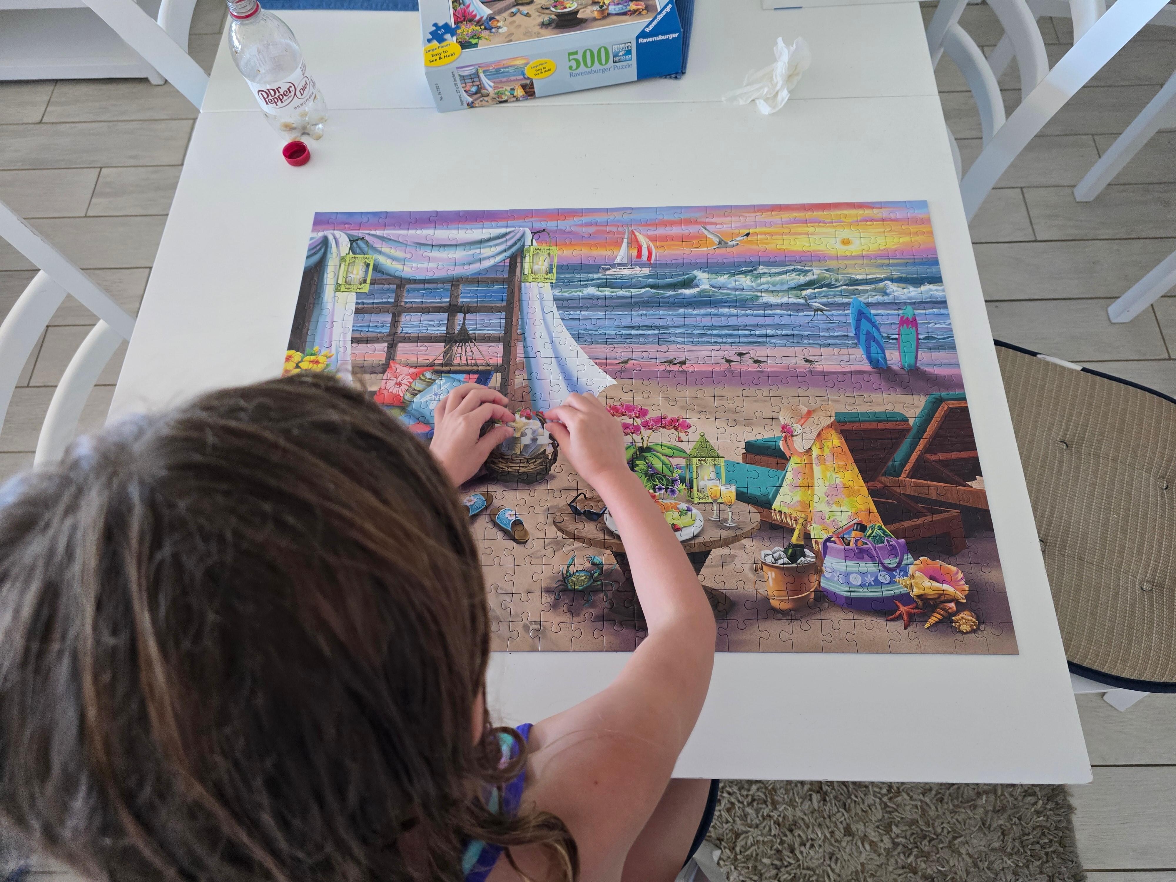The living room features a 77" HDTV with a full-motion mount, perfect for enjoying a movie from the extensive DVD collection or streaming from Netflix. PlayStation gaming, board games, and a well-stocked kitchen make staying in just as enjoyable as a day on the beach.