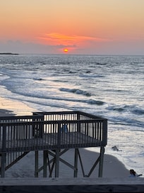 Imagine staying in a vacation cottage right on the beach- then this is your place! This duplex cottage located at the very northern tip of Topsail Island , offers breathtaking ocean and sunrise views and easy steps to the sandy beach (no dune to cross). It is recently remodeled and has four bedrooms and four full baths. The spacious master suite resides on the top floor and has unbeatable sunrise, sound, and ocean views. It has a king bed, private bath, Jaquez, and a sitting area with a sleeper sofa. The other three bedrooms are located as you enter on the second floor. The two ocean-side bedrooms each have a queen bed with deck access and an incredible view overlooking the ocean. One of the two bedrooms has its own bath with combo shower/tub, the other bedroom shares a full bath with the bedroom to your left which has a bunk bed. The third floor is made for entertaining. The living room has ample and comfortable seating facing a large flat-screen TV, perfect for watching a game with the whole family. The dining area table room enough to seat six, with two at the kitchen bar. An open kitchen has room enough for several cooks. On the back side of the house are spacious balconies with beautiful and stunning ocean views. Ocean Vibes is the ideal retreat for families looking for a slice of home while away at the beach. Lots of windows and room to spread out. Enjoy this home in a quiet and friendly beachfront neighborhood with amazing sunrise and ocean views. Book your reservation in Ocean Vibes II today, we expect it to fill up quickly.