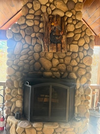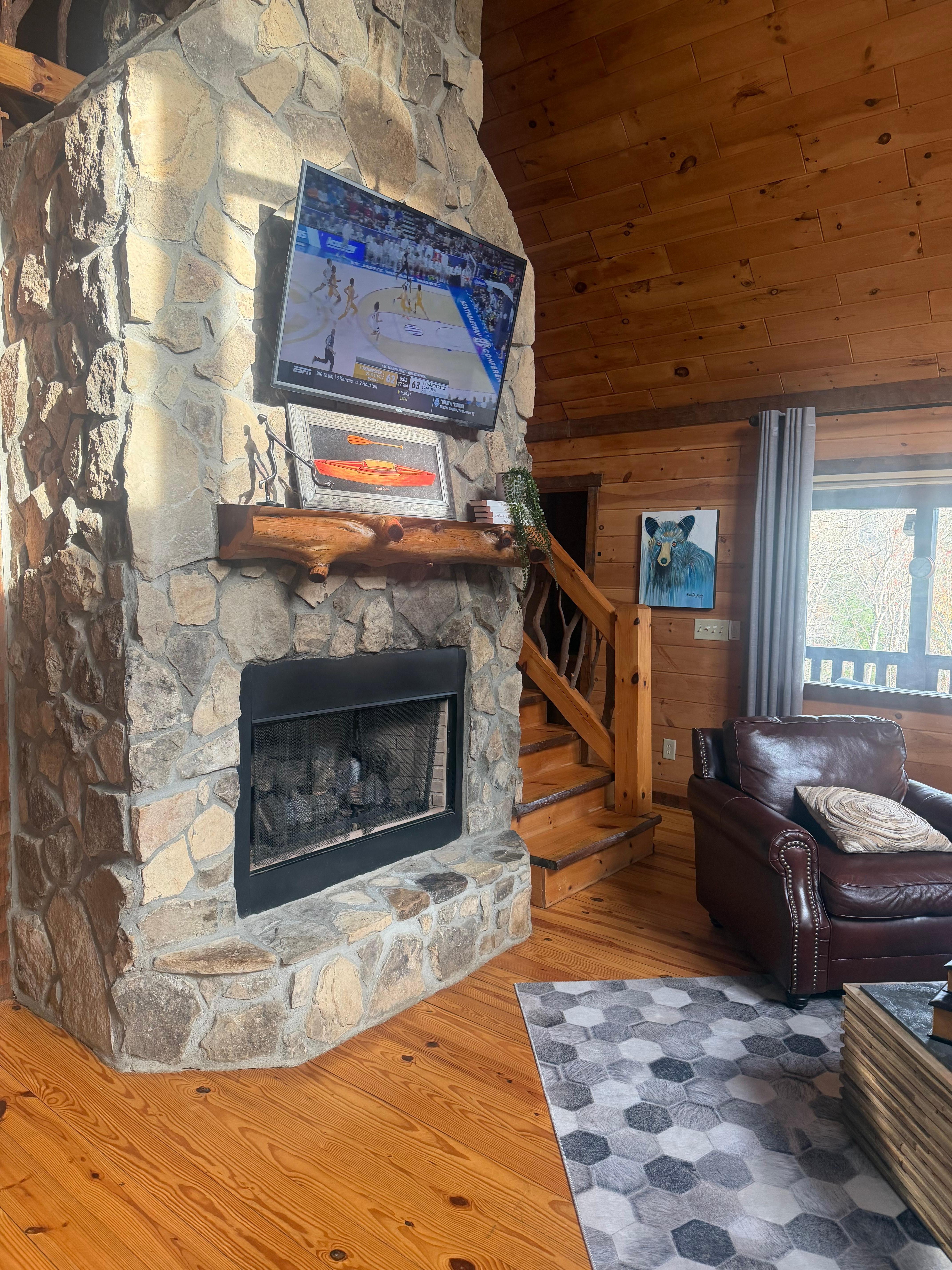 Step onto the wrap-around porch and feel instantly at ease with the Riverstone wood-burning fireplace, cozy outdoor seating, and a dining table for six. Grill up a feast on the gas grill, then unwind in the hot tub on the partially screened deck. Inside, you'll find a warm and inviting living area featuring a unique gas log fireplace, Smart TV, and plush leather seating. The open kitchen, complete with bar seating and a breakfast table, is ideal for casual meals and entertaining. The main level also boasts a charming bedroom with deck access, a luxurious full bath with a tile shower, log slab copper vanity, and TV. A convenient half bath near the French doors rounds out this level.