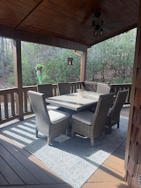 Head down to the game room, where you’ll be greeted by another gas log fireplace, a pool table, and a fireplace-mounted TV. Enjoy snacks at the pub table or challenge friends and family to a game of poker or billiards at the beautiful wet bar. This level also includes a third bedroom with a king-size bed, TV, and a full bath with a standard tub/shower combo and single vanity sink. Step outside to the ample deck on this level, offering serene woodland views and a perfect spot for quiet reflection.