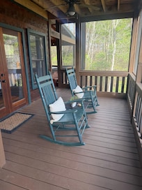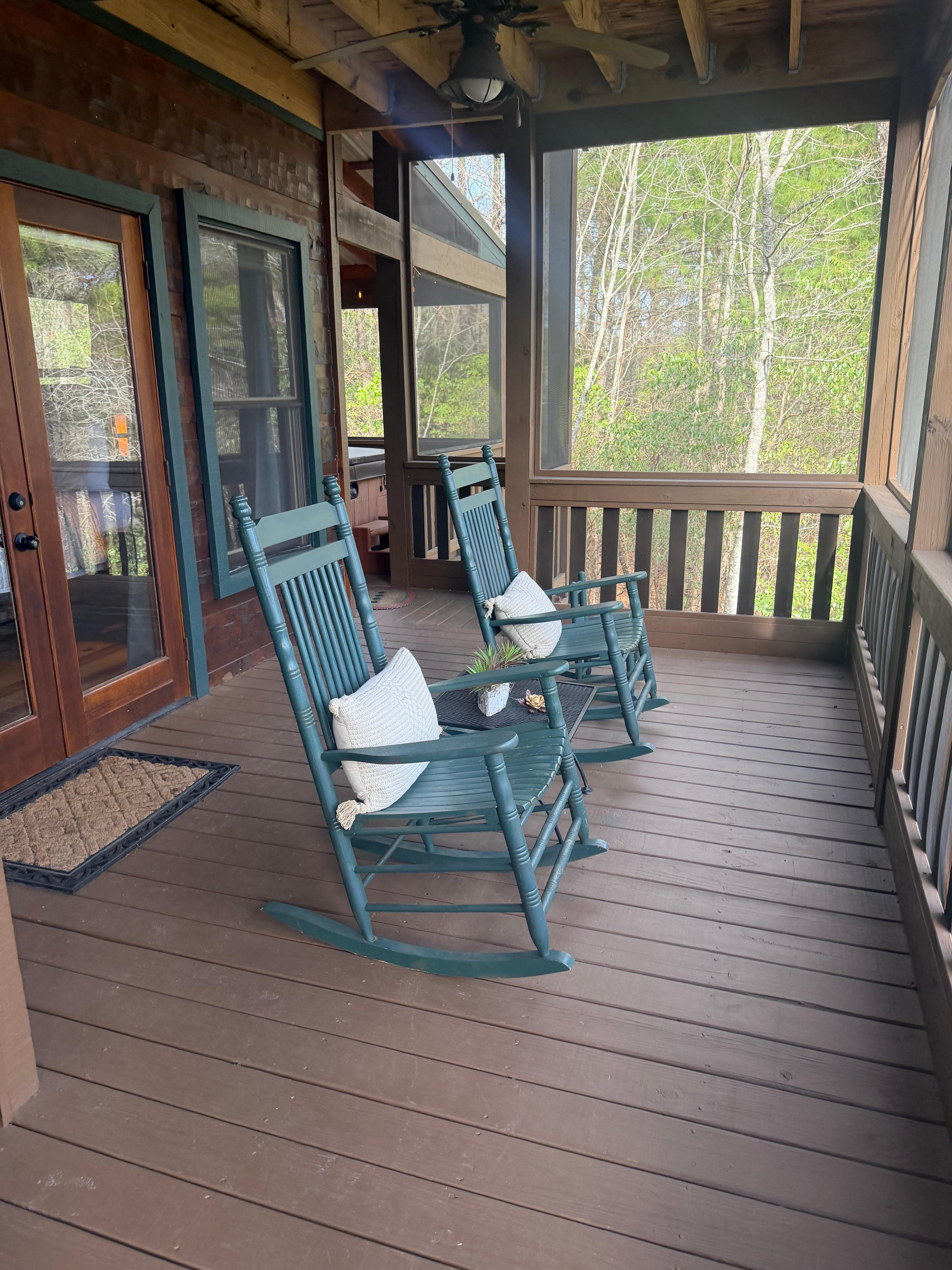 Ascend the stairs to discover a cozy reading/work nook and the exquisite master bedroom. This serene sanctuary features a king-size bed, TV, and a private balcony where you can sip your morning coffee or evening wine while soaking in the breathtaking views. The master bath offers a relaxing soaking tub, tile shower, and a log slab and copper vanity sink. The private screened-in balcony provides the perfect setting for intimate conversations and peaceful moments.