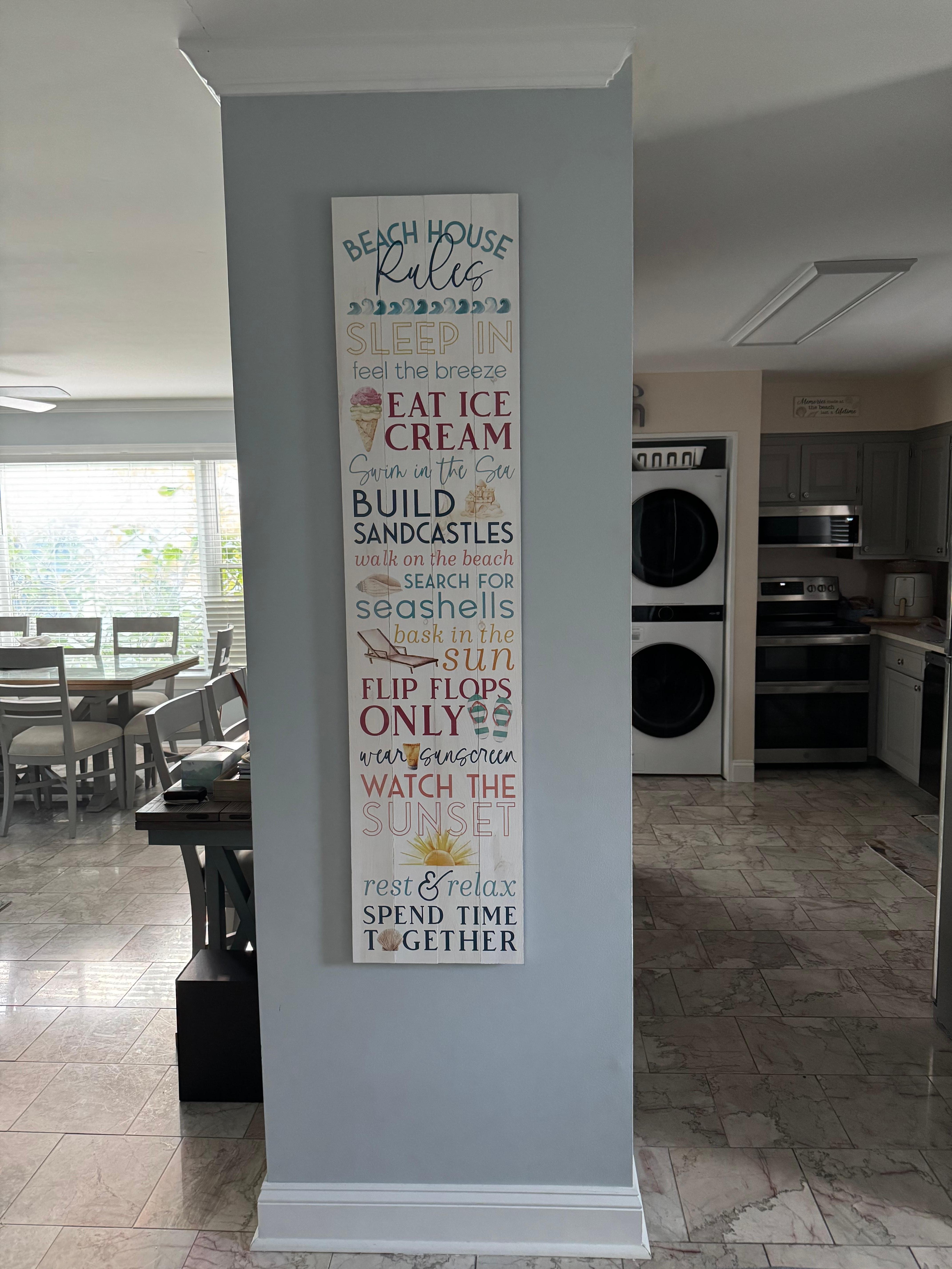 One-Level Waterfront with 3 bedrooms and 2 full bathrooms, and 1,680 sq. ft. of finished living area. There is room for two vehicles to park off-street in the driveway. On-street overnight parking between 3am-6am is available by town parking permit only. If you have a need to park more than two vehicles, please send us a message to discuss this process before booking. This home is situated in a quiet neighborhood directly off of Coastal Highway, a close walk to the beach. North-facing air-conditioned/heated sunroom that opens up to an outdoor deck and lawn rear yard area with canal frontage and natural shade under the tree canopy, with a hammock. This home has imported Italian marble floors and luxury vinyl plank flooring throughout. All three bedrooms, living room, and sunroom are equipped with TVs that are either SmartTVs or RokuTVs, which will support your streaming subscriptions during your stay. Also, the "Roku Channel" and "Crackle" offer many free TV shows and movies. You will also find board games underneath the living room TV. The master ensuite bedroom has a king-size bed, along with a new custom tile shower in the master bath. Bedroom 2 has a king-size bed, and bedroom 3 has a corner bunk system with a Queen-size bed on the bottom and two Twin-XL top bunks that are perpendicular to each other, along with a Twin-size pull-out trundle underneath the Queen. The living room is equipped with a queen-size sleeper sofa.