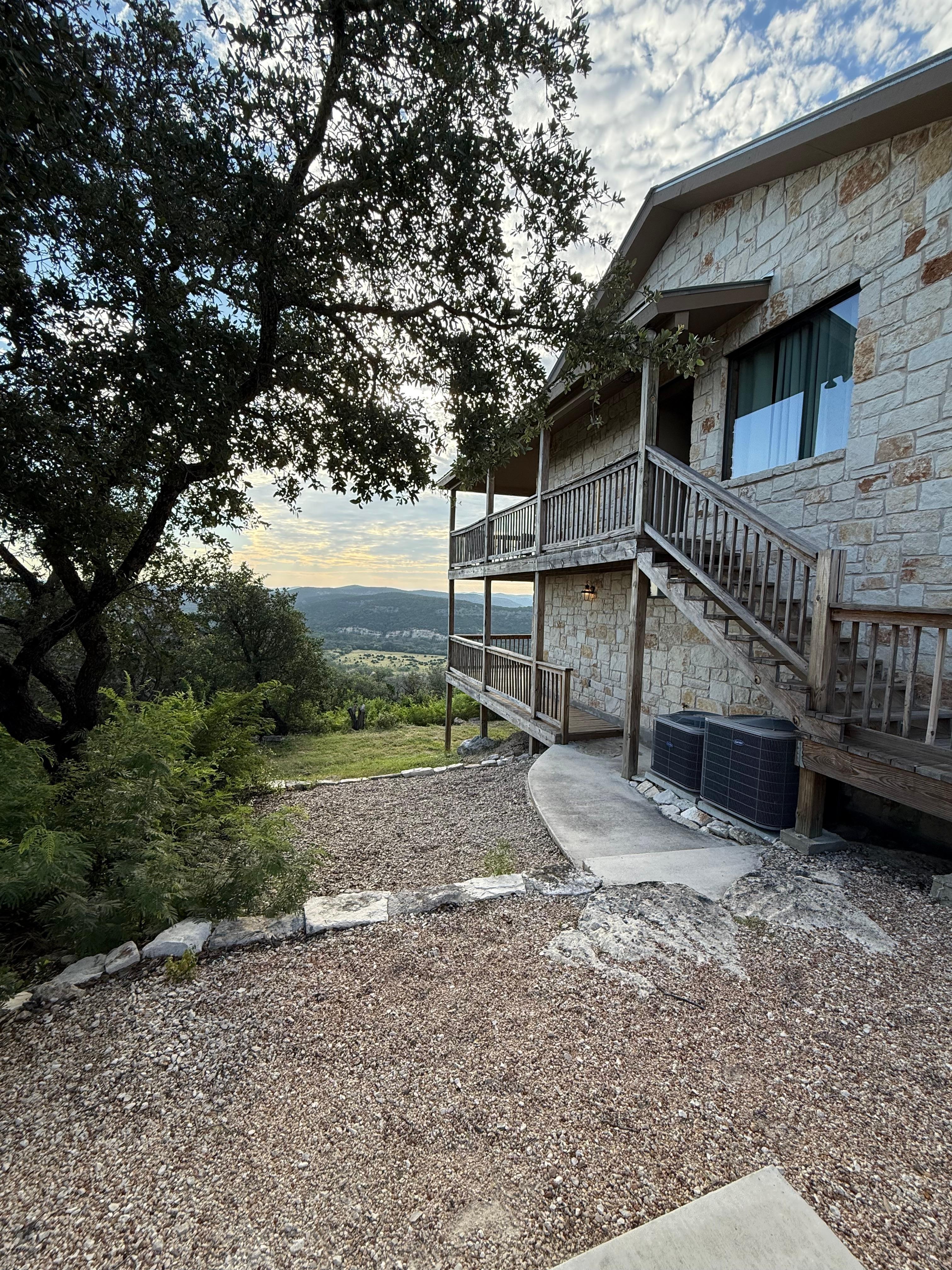 HAWKS RIDGE is a beautiful, hill country home with the spectacular views to enjoy day and night. You will feel like you can reach up and touch that Milky Way star galaxy. The design of this custom built home is great for your multi-family vacation or just a quiet get-away for a few close friends. Downstairs you have the convenience of a single car garage with easy access to the two bedrooms downstairs. There is a “Jack and Jill” bath in between the two downstairs bedrooms. There is a beautiful covered deck for your enjoyment right outside your door. Upstairs, is the open floor plan for the kitchen/living room and two more bedrooms and bathrooms. The extra large windows give you a very open feel to enjoy spectacular views from the living area and the top covered porch. The view from the top deck is panoramic to include “Old Baldy” in Garner State Park, across the Frio Canyon, and to the right you see 7 Bluffs.