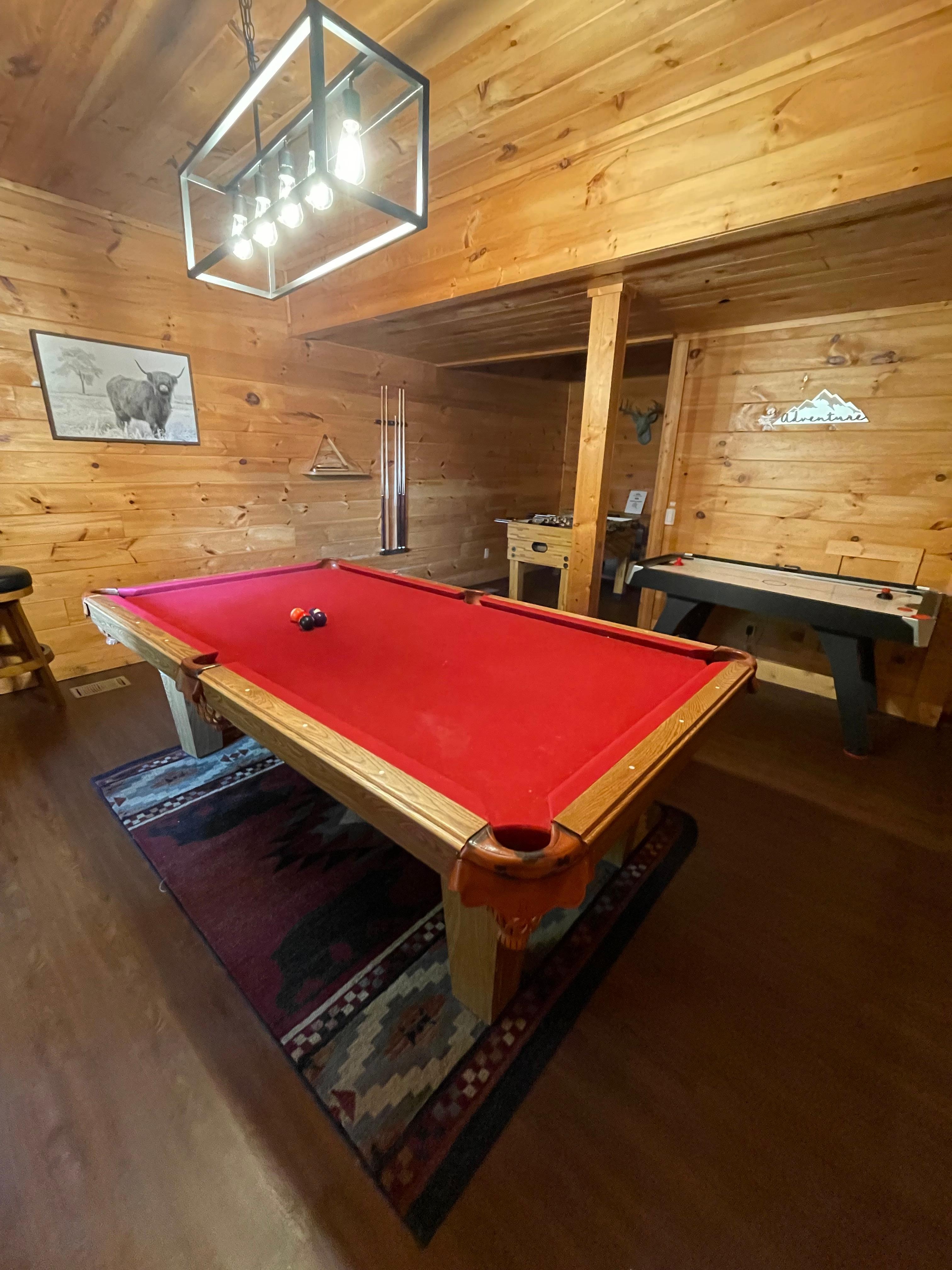 The lower leave features your own private game room and entertainment oasis! Enjoy a game of pool, air hockey, or foosball while watching your favorite shows on the big Roku TV. Challenge your friends to an epic game of Giant Jenga or set up a game of corn hole or yoga session with the provided mats. After a long day of gaming, get ready for a soak in the hot tub with incredible mountain views, or relax in the hanging egg chair overlooking the forest.