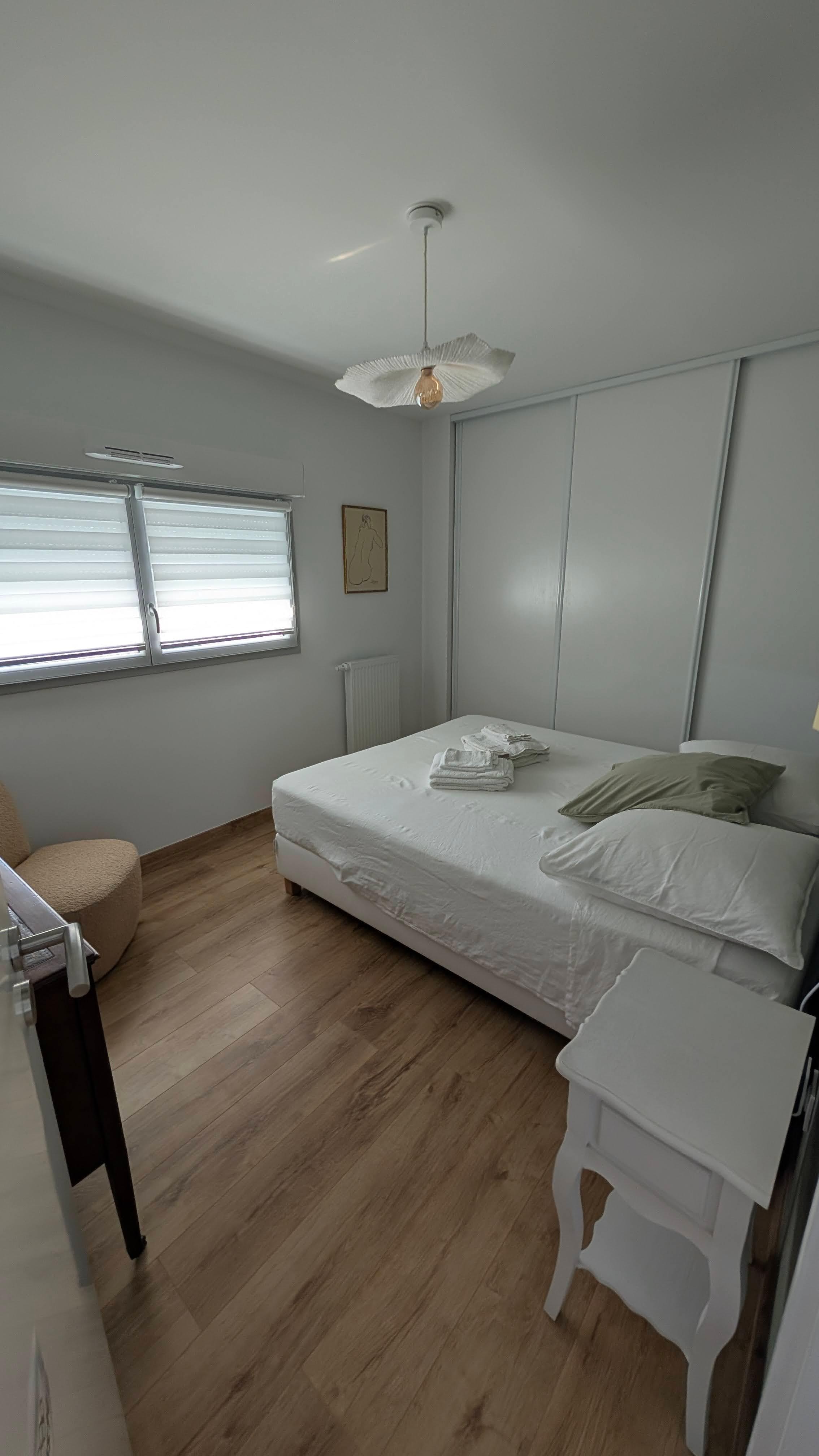 The first bedroom has a 160 x 200 cm bed, a large built-in closet with shelves and wardrobes. The second consists of two beds of 80 x 200 cm to be pushed together or not according to need and a small wardrobe. New bedding. The bathroom is equipped with a walk-in shower and two sinks.