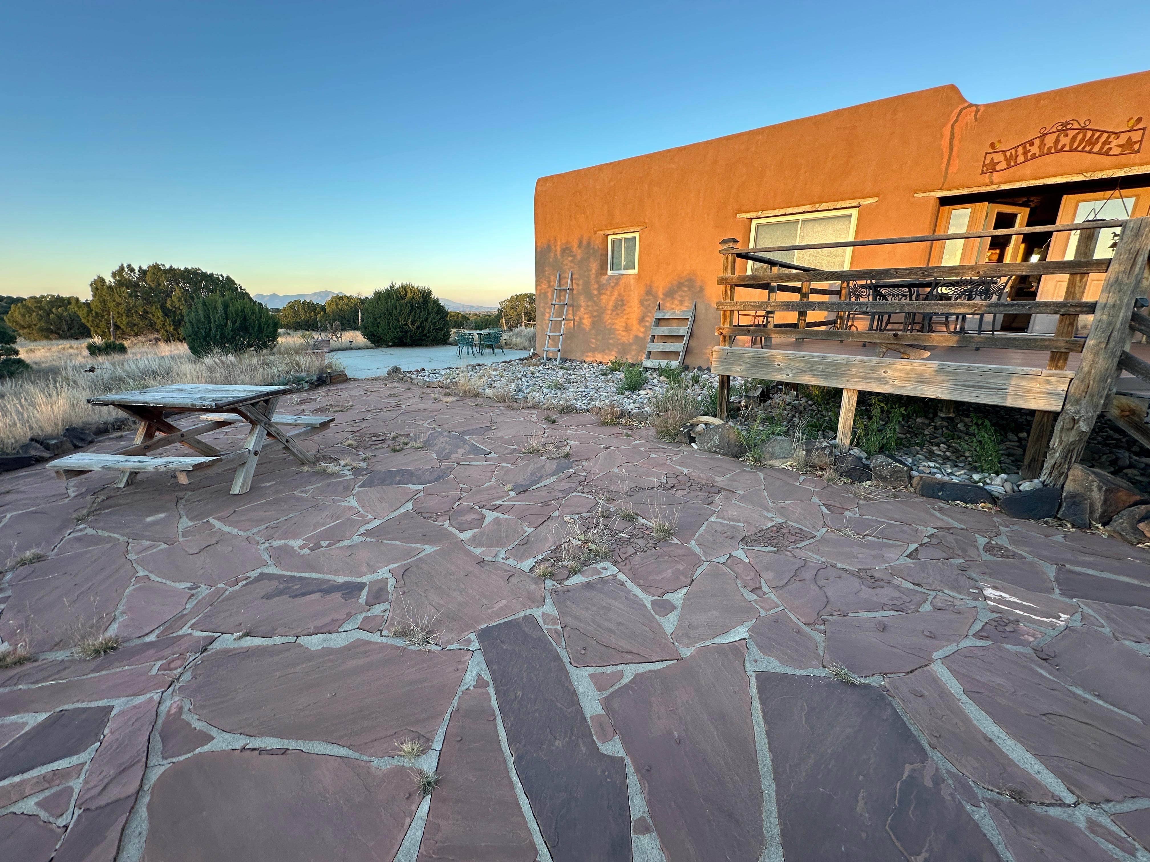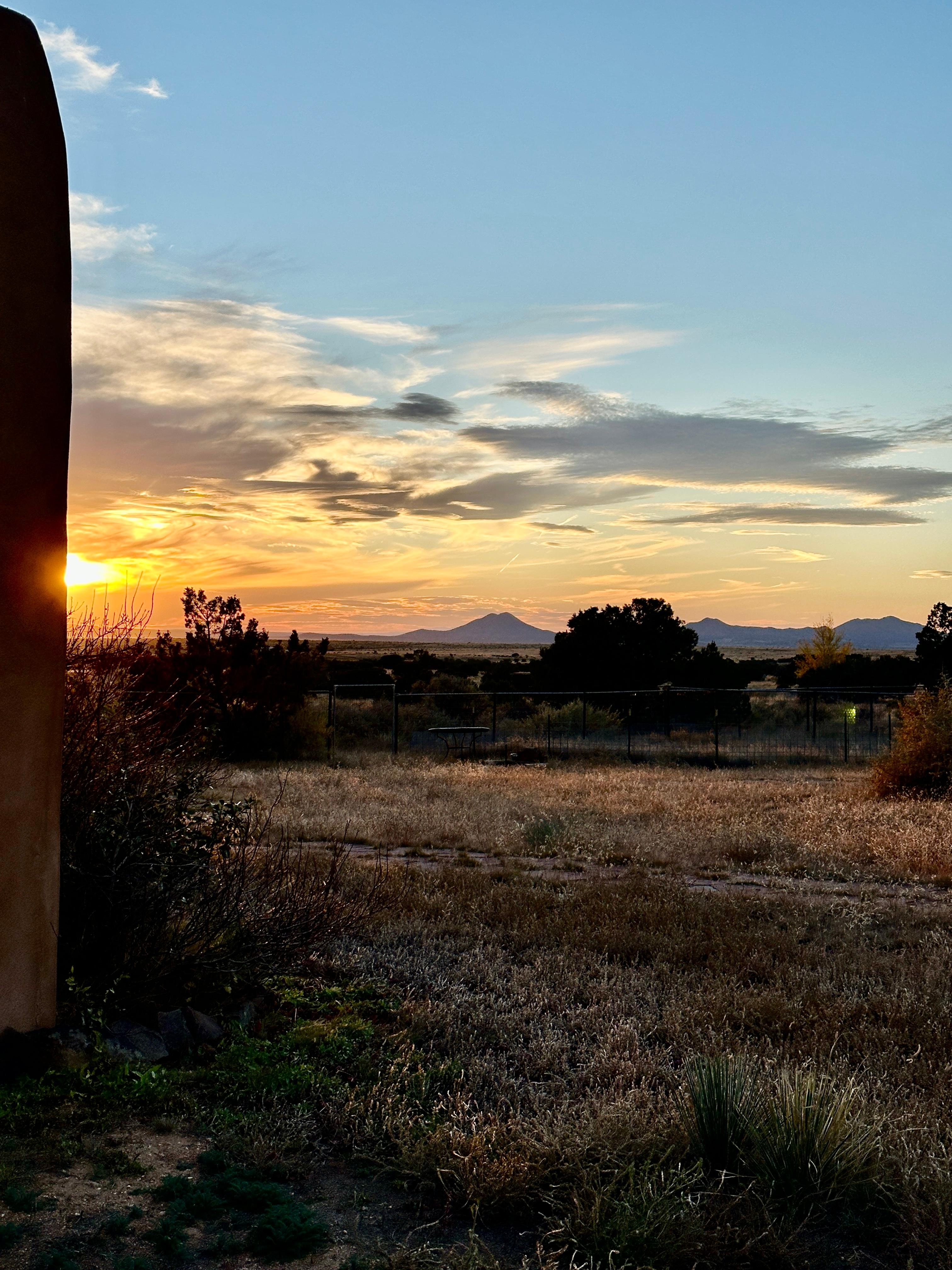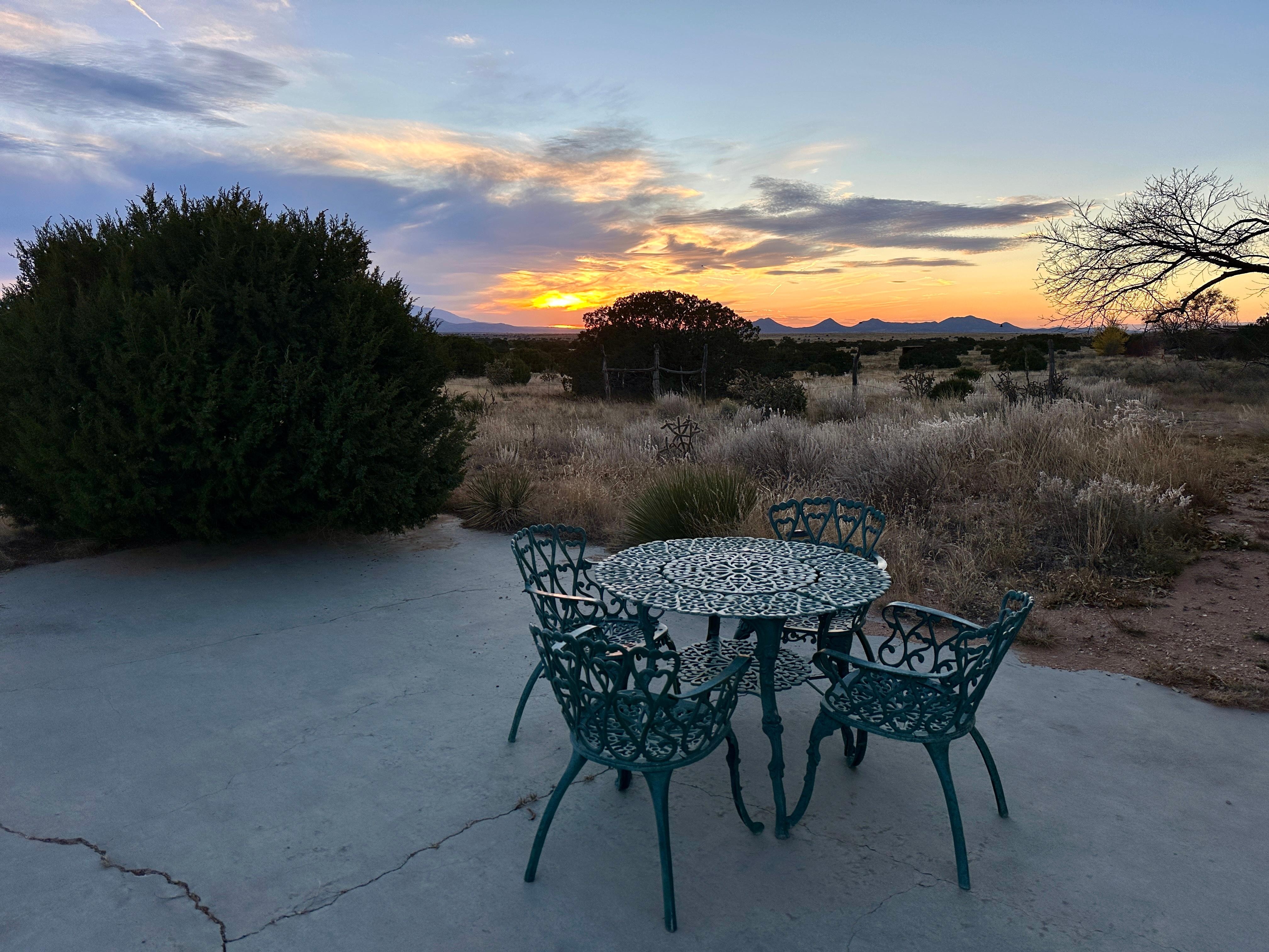 We considered staying in downtown Santa Fe, but we’re so pleased that we chose this lovely, secluded option instead. We so enjoyed the incredible furnishings (so much art and southwest flavor throughout!), the enhanced relaxation that came with being out in the country, and the balm for the spirit that we felt in this tranquil setting. We heard coyotes howl and crows caw, we enjoyed the mystery of the petroglyphs on the property, and we especially enjoyed watching the dramatic lightning storms dancing in the distance. The commute to the sights of Santa Fe is very easy, and nearby Eldorado has several conveniences if you find yourselves, like we did, wanting to languish in the soul-soothing ambiance of this sweet spot.
