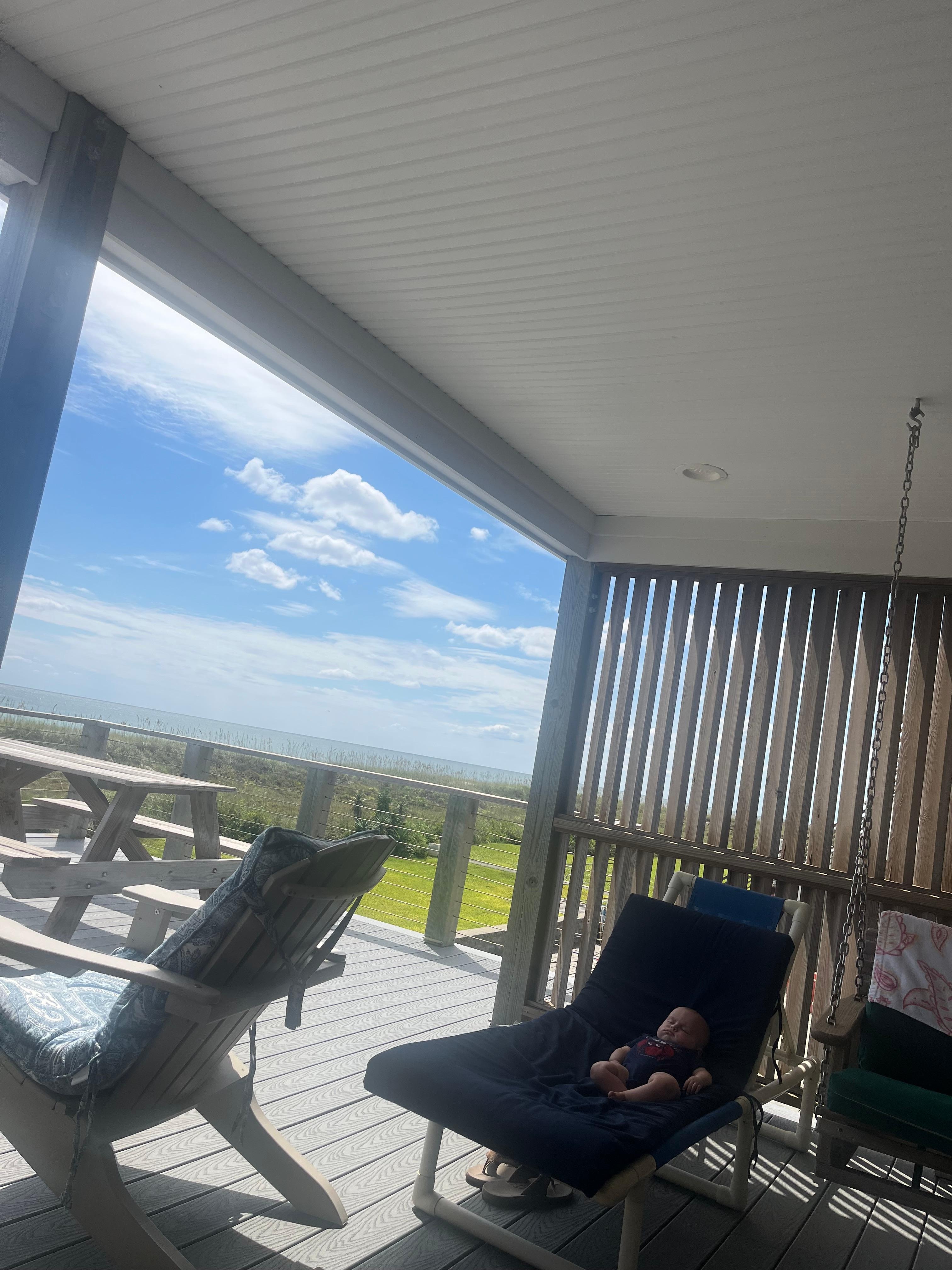 On the large oceanfront deck, you can enjoy sitting (or swinging) in the shade, or lounging in the sun. Just a few steps off the deck and you will feel the sand between your toes! In addition there is an enclosed sun porch next to the open deck with a small table that can be used for dining, games, or writing your next novel.