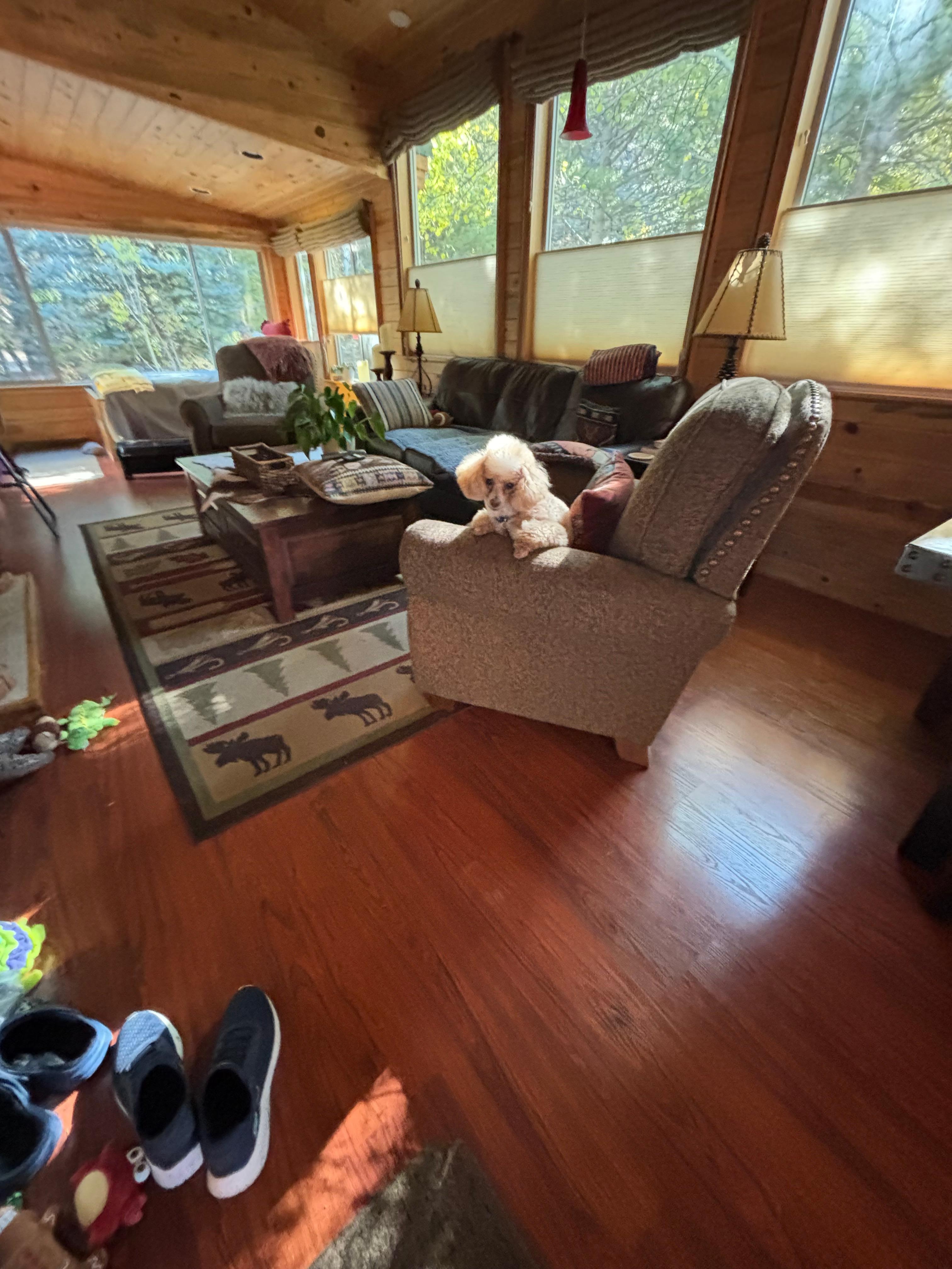 Our cabin was custom built by Amish craftsman with a unique light log exterior and Knotty pine interior that's warm and inviting. We can comfortably accommodate up to 7 guests in 1 master bedroom, sleeper sofa and trundle bed.. We also provide 400+ mbps WiFI Cloud from anywhere in our cabin. We also have 3 flat screen hi-def TV's. We have a full sized and fully furnished kitchen and appliance package that also includes a washer/dryer. We provide 2 covered parking spaces and use of our electric golf cart durning the summer months. STR permit # STR21-01568
