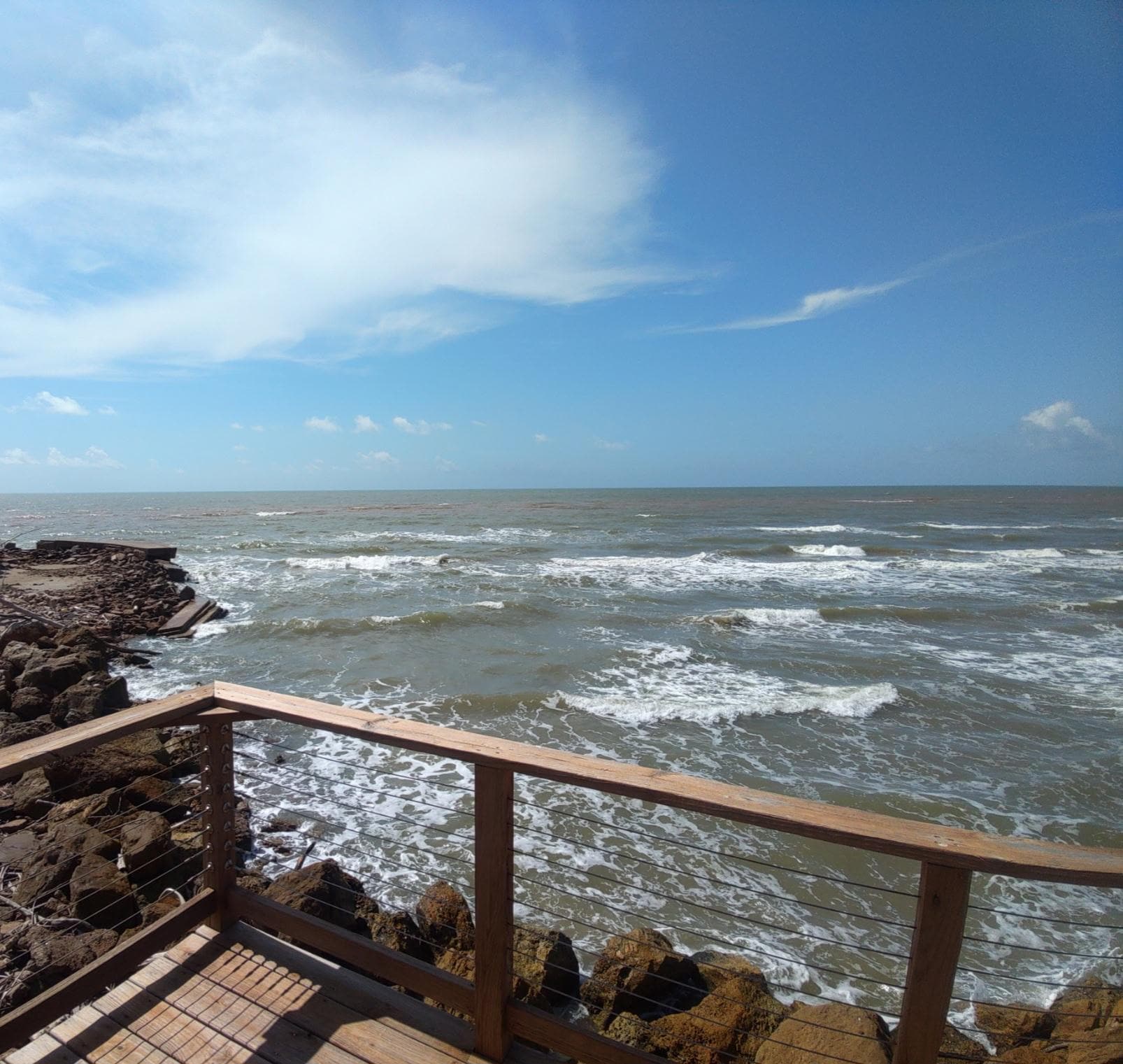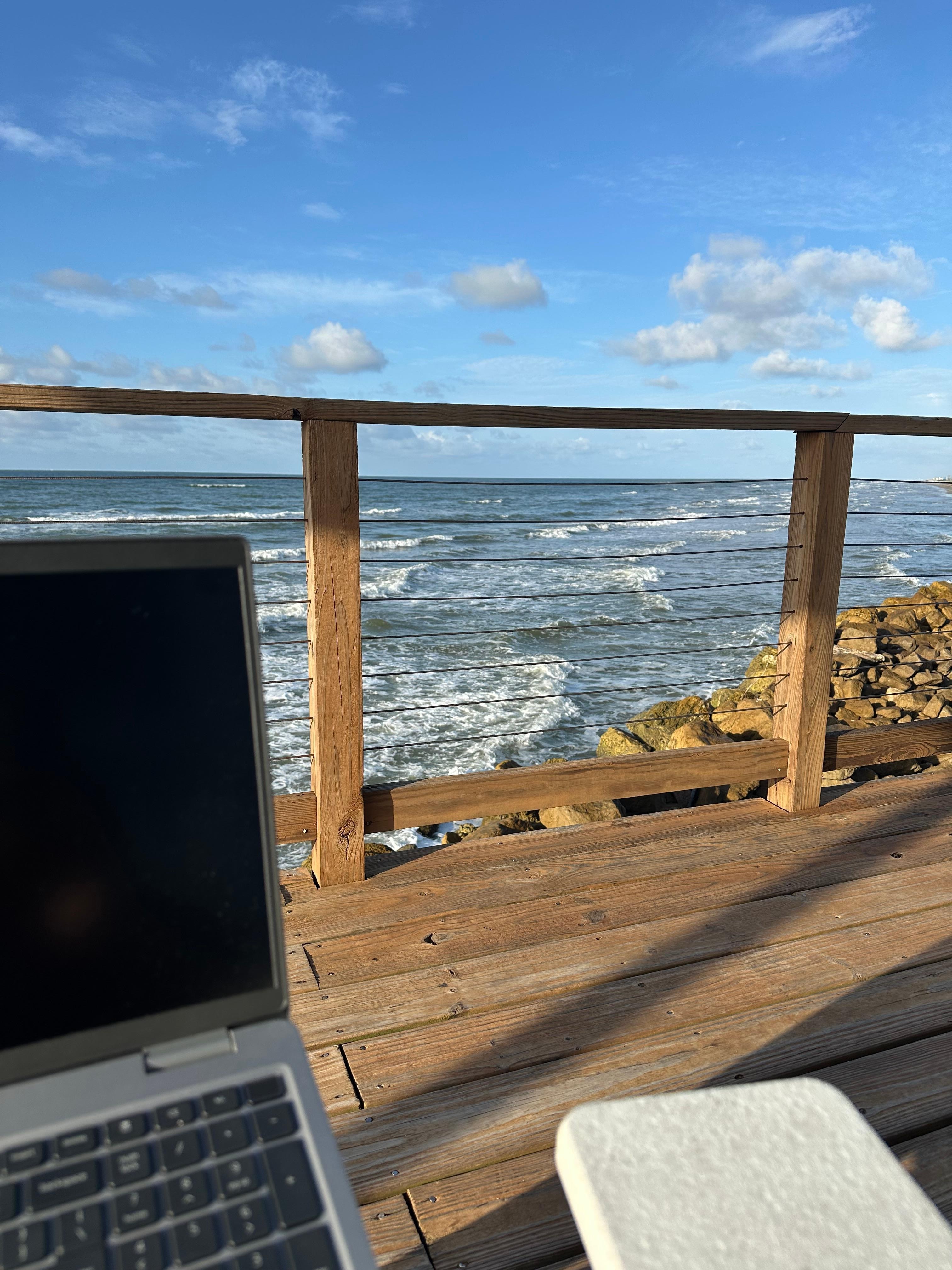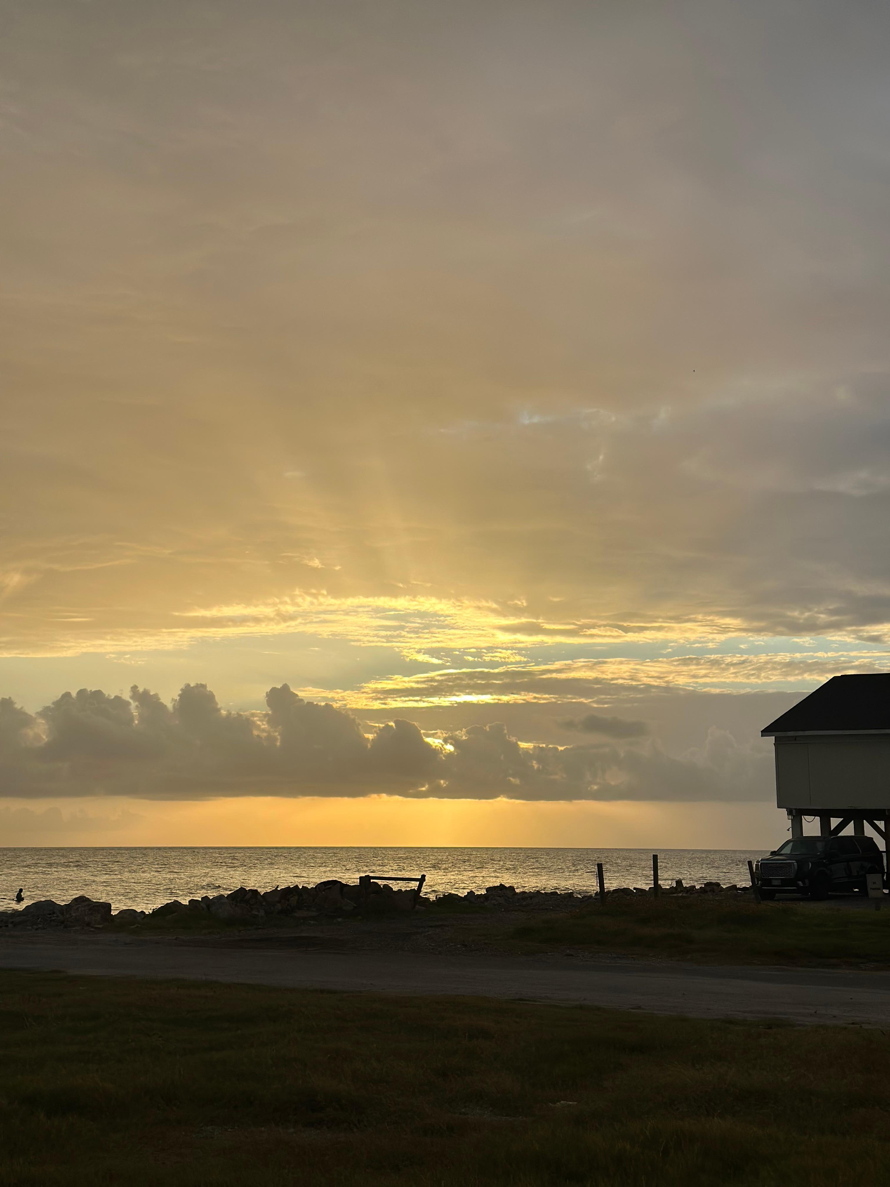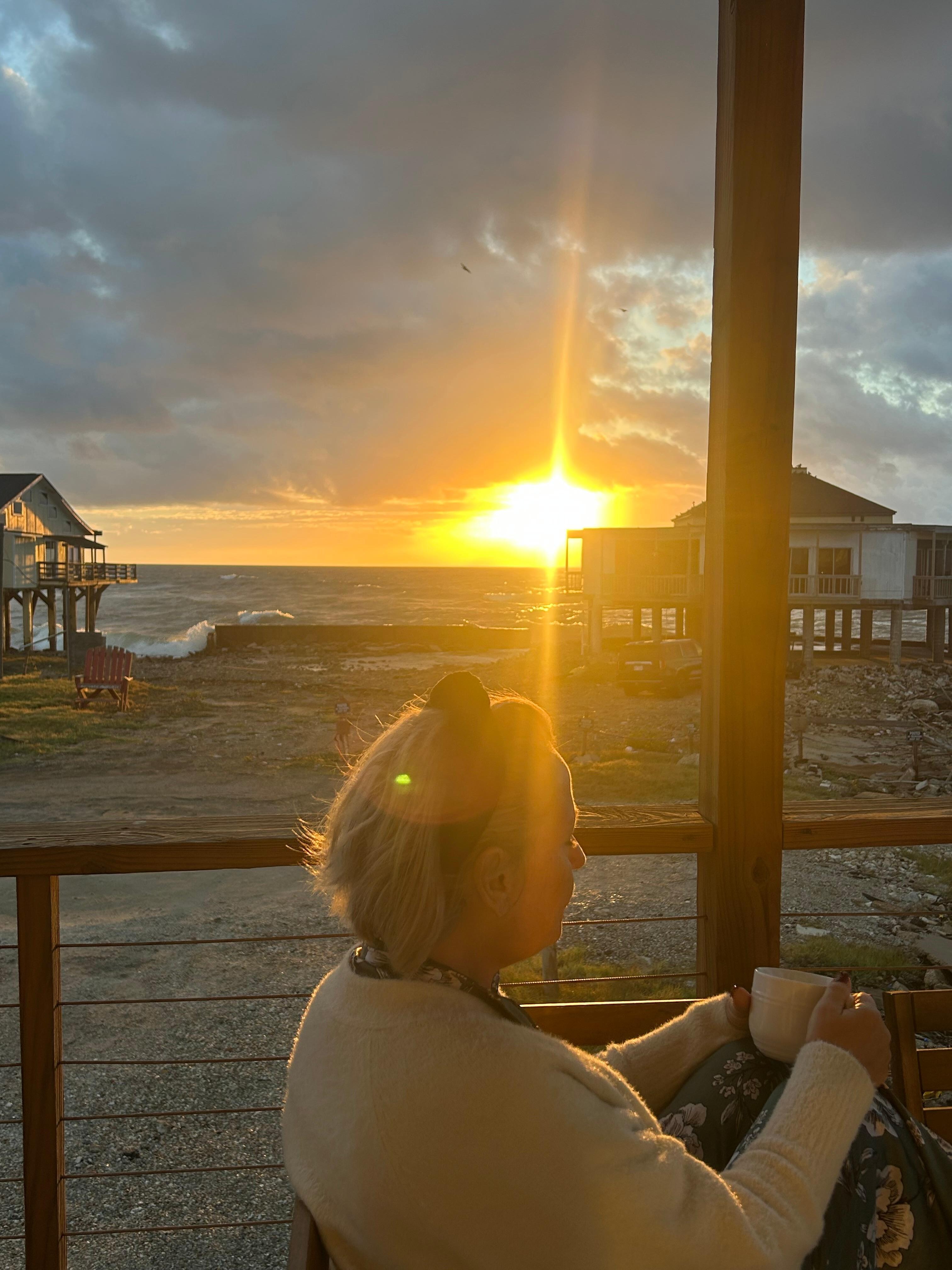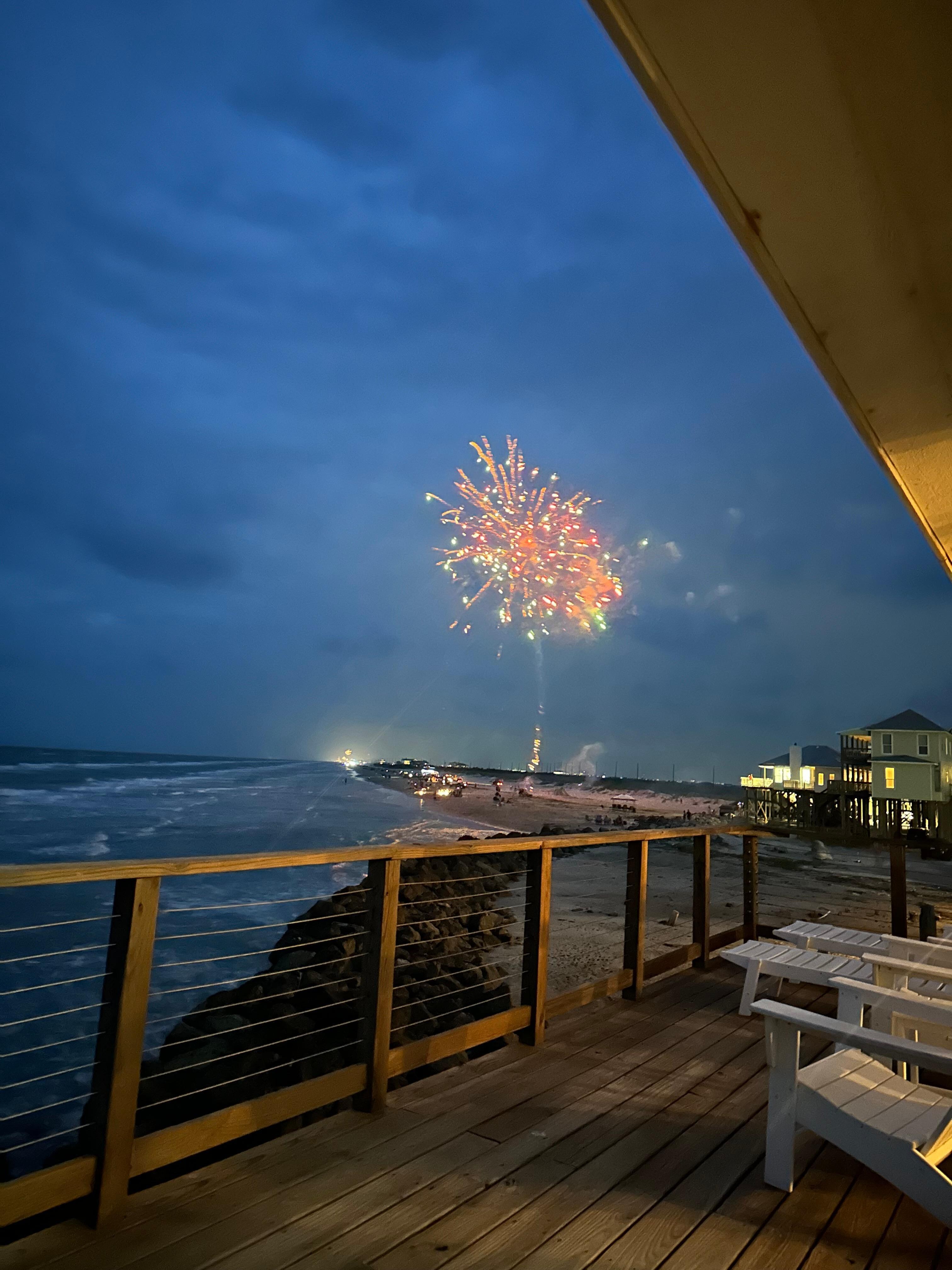 The porch areas offer a shaded dining area with a view out over San Luis Pass, a sunny (at least during the middle of the day) area with Adirondack chairs with views of the beach, and a shaded/sunny lounge area with views of both.
