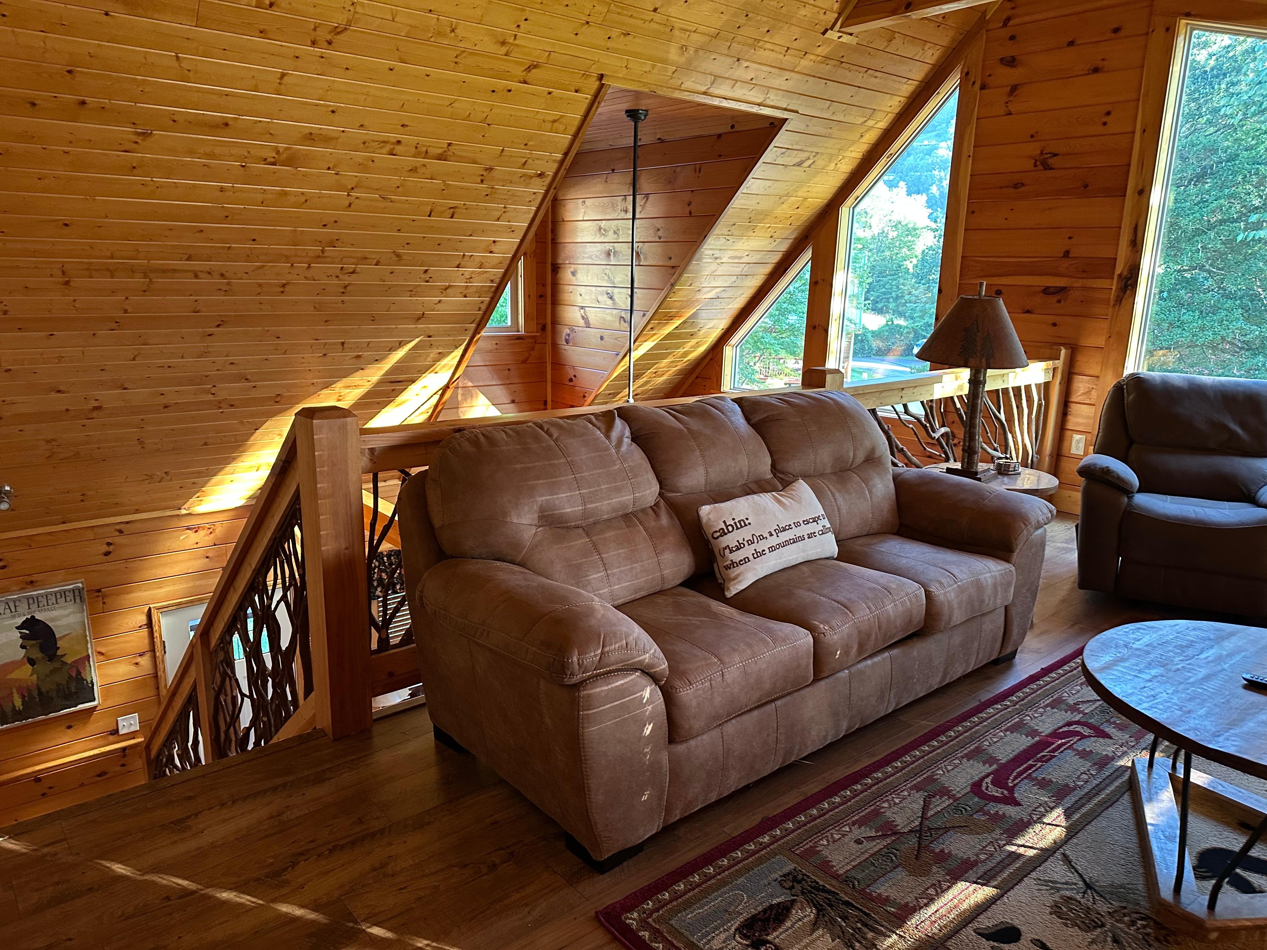 The thing I love most about staying at my cabin is that the feeling cozy comfort is all around. You never even have to leave the cabin if you just want to sit and relax. A desk table at one of the windows is the perfect spot to put my laptop when I need to do a little of my work. The back covered deck has rocking chairs to sit and rock the evening away. The early morning sunrise will take your breath away, as well as the smell of the cool morning dew.