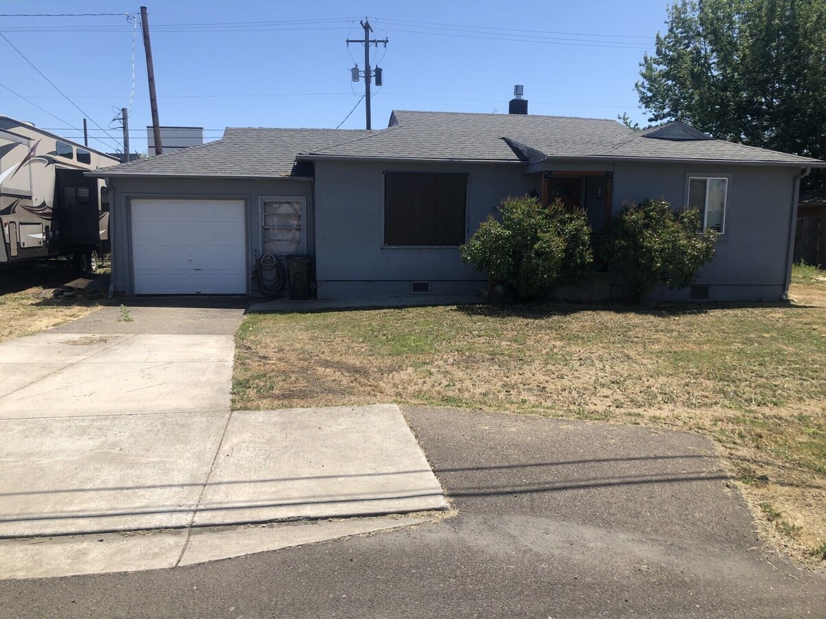 2 bedroom 1 bath house conveniently located just off I-5. Pet friendly fenced in back yard washer and dryer. Queen size beds in both bedrooms. 3 Air conditioners, 1 in each bedroom and 1 in the kitchen. 65" tv and WIFI. close to shopping and hospital. gas fire pit in the back yard, gas BBQ grill and lawn chairs.