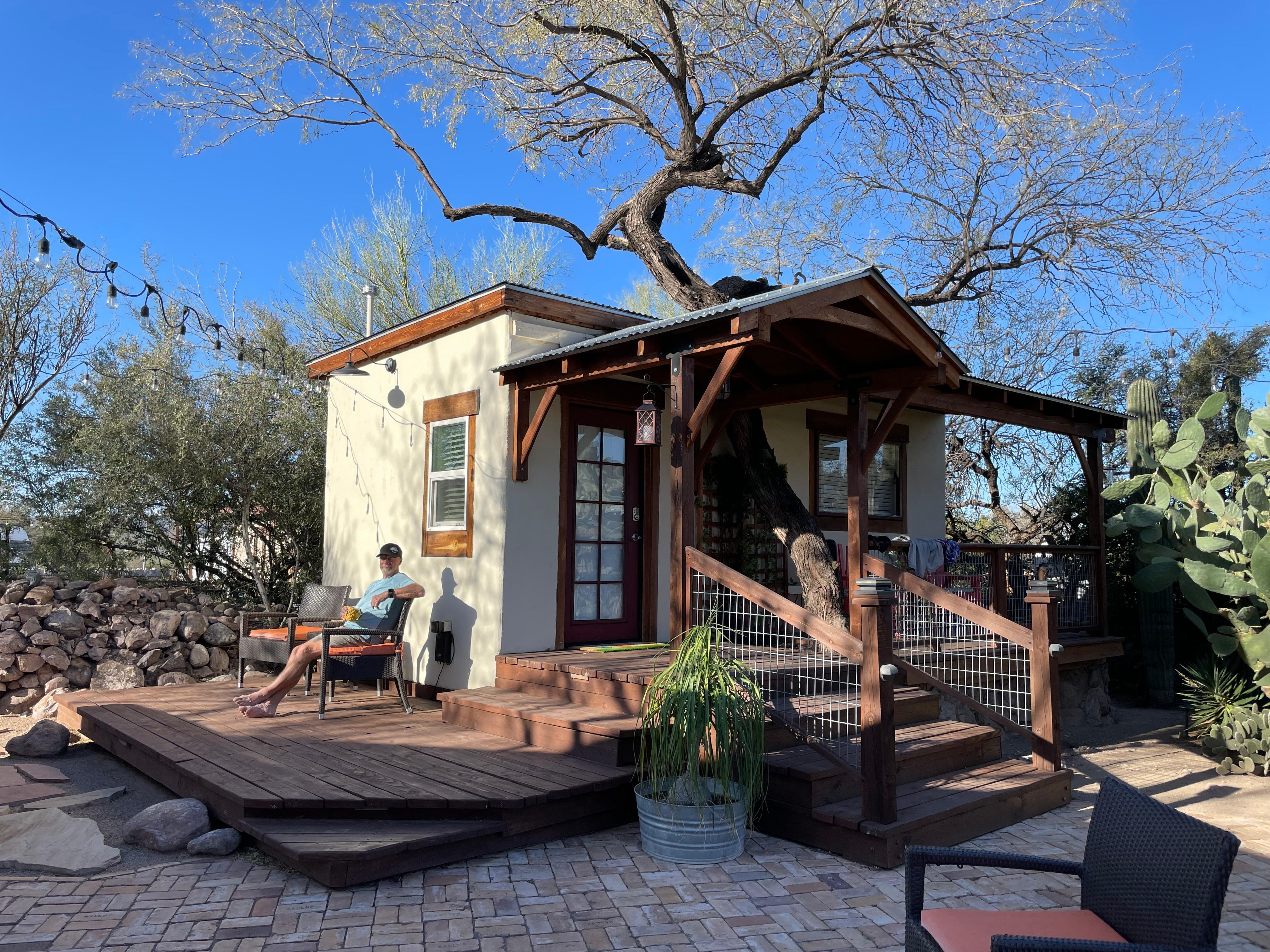 Our Tiny Home located in our back yard as our guest house is inside a private, well secured landscaped yard. Sofa / ottoman turns into FULL size bed, modern interior, great patio's with views and lots of character.