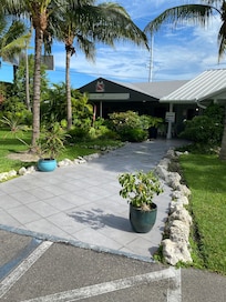 - View of lush tropical gardens;