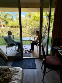 Our ground level, newly renovated, fully equipped, and centrally air-conditioned, garden view studio is located in the quiet section of the Banyan Building. It has a full semi-private lanai, and offers a full-sized and fully-stocked kitchen. We have upgraded with new kitchen and bath cabinets, granite countertops, carpeting, wallpaper, walk-in glass-block shower, new flooring, and modernized ceiling. We installed a new top-of-the-line $3,500 WYNN HOTEL LUXURY CAL KING Bed which our renters rave about. This non-smoking condo can comfortably sleep four guests (including a separate queen sized sofa bed) and has a digital safe for valuables. In addition, we have a brand new 55" SonyTV. The resort also has two swimming pools with jacuzzis and waterfalls.