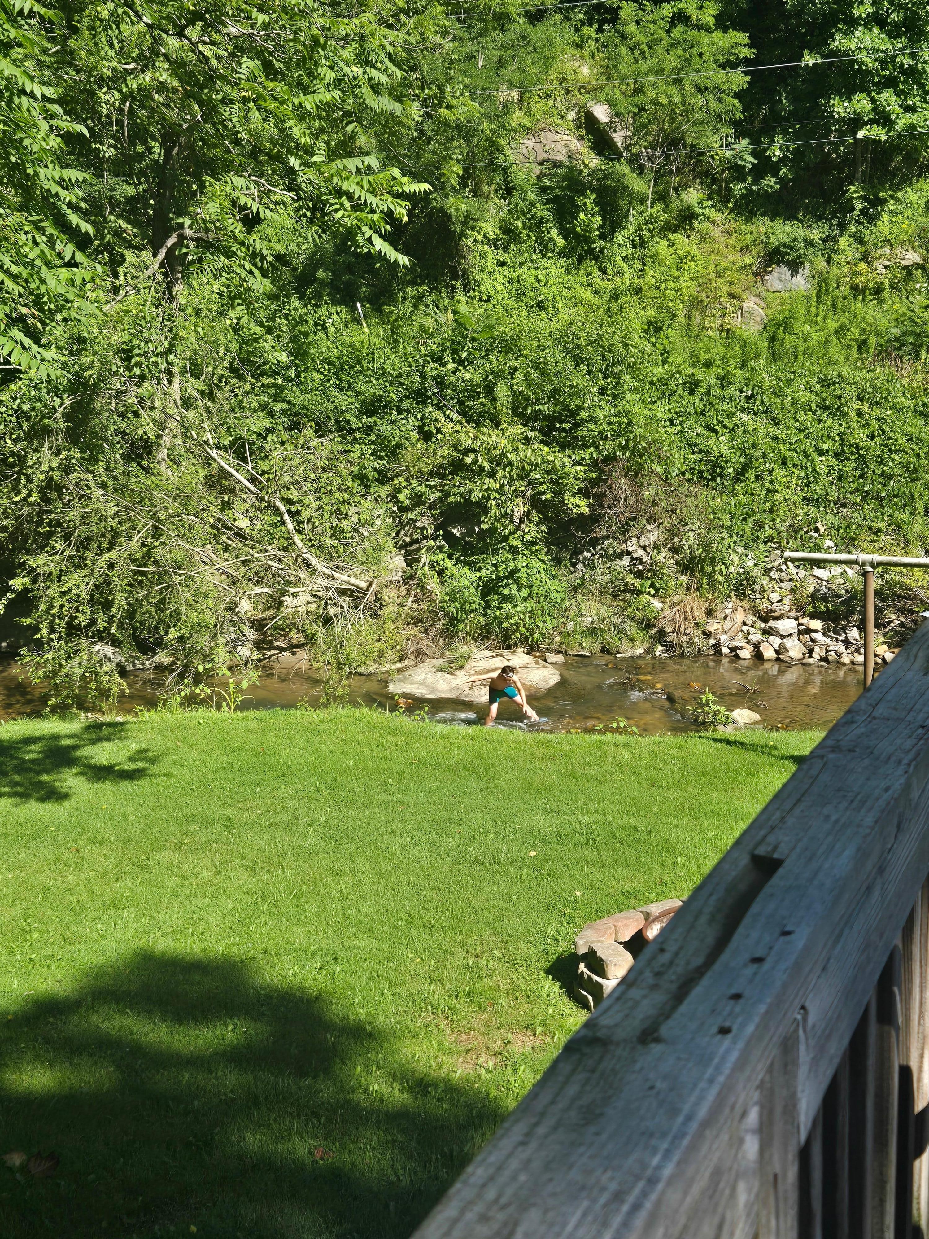 You have found the place for that great quite getaway. Sit on the front porch and watch the cows cross the mountain. See the horseback riders come by. You can sit on the deck out back and listen to the waterfall while enjoying the hot tub. The backyard is a great place for reading, cooking out on the charcoal grill, viewing the wildlife and just relaxing. You have all the solitude of being away, but, are conveniently located to town. You are located 15 minutes outside of Maggie Valley in the Fines Creek community. You are 20 minutes to Waynesville and 30-40 minutes to Asheville.