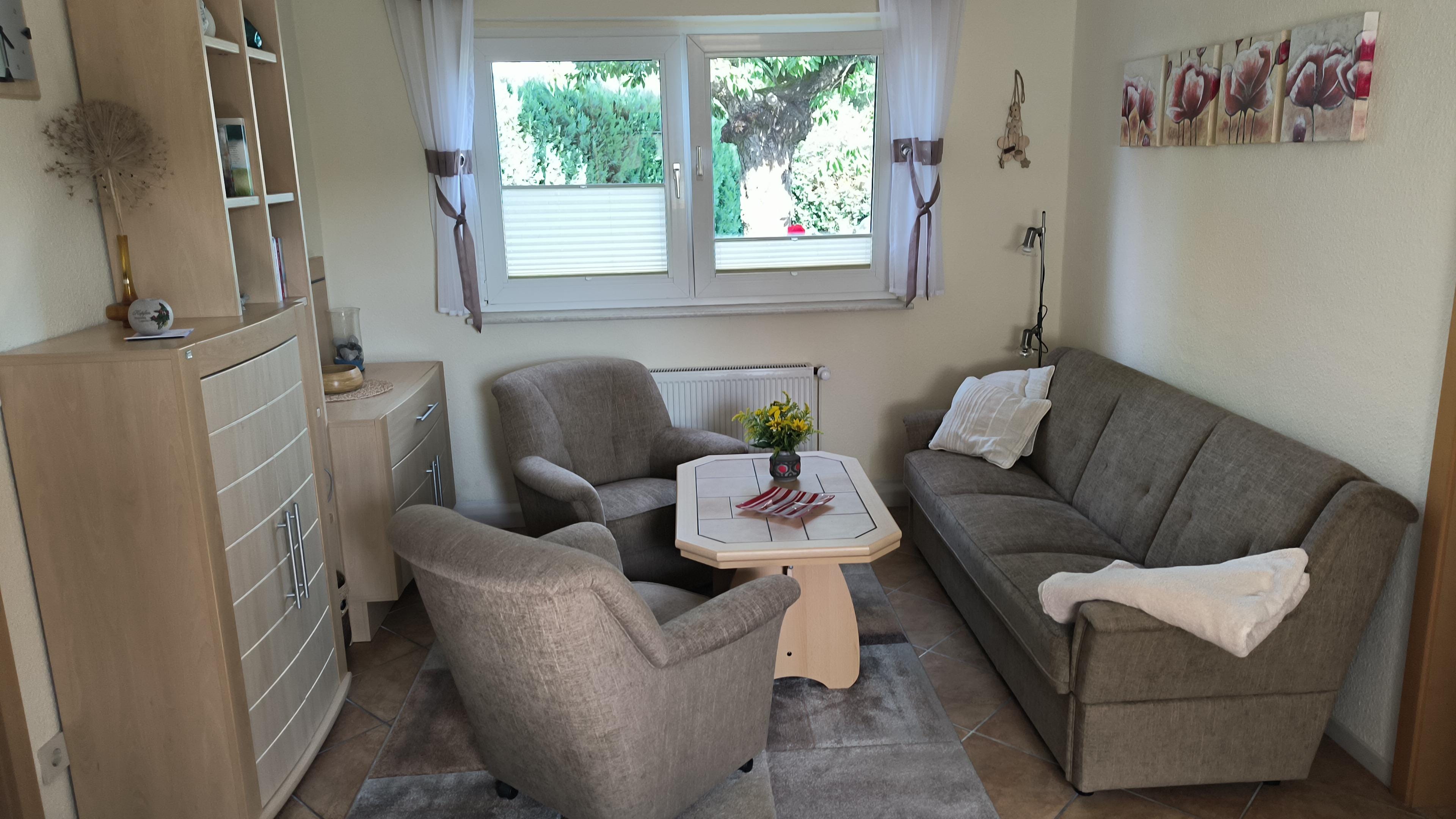 - Kitchen with dining table, refrigerator, stove with 2 ceramic hobs, microwave, toaster, coffee machine, coffee pad machine (Tassimo) kettle
