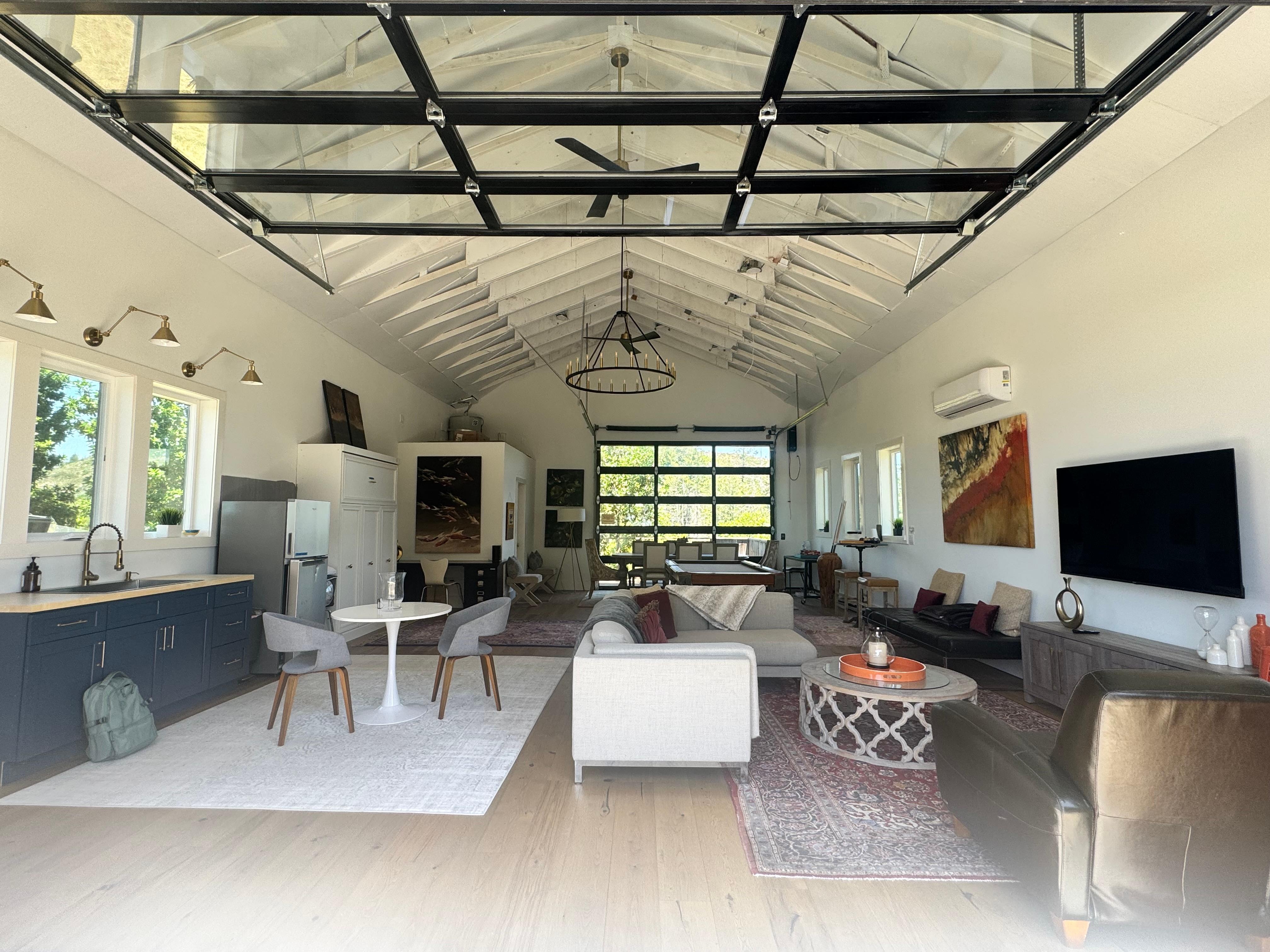 * An extra 1,000 square feet of bonus space in a recently renovated barn, bringing the property total to 2,577 square feet - with pool table, wet bar, lounging area (with TV), and a formal dining room table for games. We have a bonus queen size murphy bed in the barn as well. AC/heat provided via a mini split (accessed by remote).