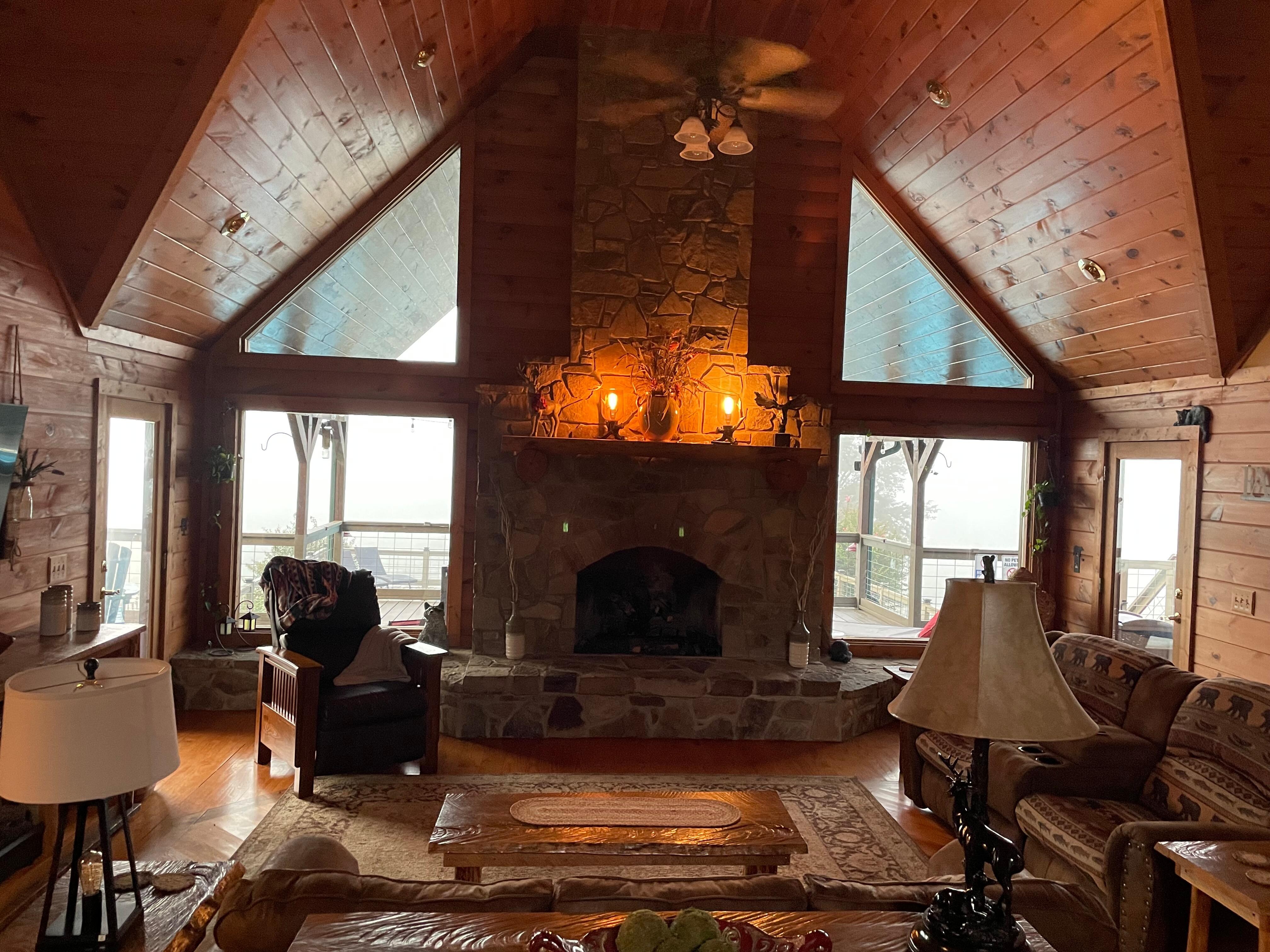 Free EV charger on site!!! This little piece of heaven is in even more beautiful than the pictures can show!! Sitting on two acres on top of a mountain side in the Cumberland Plateau, Heavens View Lodge has 4 bedrooms and sofa queen sleeper. The view’s are the main attraction about this Log home. Year around relax by the swimming pool, Hot tub that seats 6, walk down to the Fire-pit with seating for 10 people, wood provided, 2 corn hole games, Basketball Goal, swing set, children’s play room, back porch has wood burning outdoor fireplace, the covered deck for those cool Fall and Winter nights, four more chairs on side deck for taking in the view, large gas grill and smoker grill, six person table with umbrella, two outdoor couches, large lounger, side of the house you have two chairs to relax, two chairs on front porch to relax, WiFi for the lodge is 100m, cable is provided by You-Tube TV, lots board games for all ages, lots of books, the Master Bedroom has 16 foot ceilings, double doors leading to the back deck, the master closet is cedar, the master bathroom has a large soaking tub with a custom waterfall and candlelit for relaxation, his and hers sinks, large shower with two spray nozzles, the second bedroom on main floor has King size bed, 50 inch 4K smart TV, ceiling fan, double doors leading to back deck, cedar closet, the third bedroom on main floor has king size bed, 50 inch 4K smart TV, ceiling fan, cedar closet, fourth bedroom upstairs has King size bed, 43 inch 4K smart TV, desk, cedar walls from trees on the property when built, full bathroom, game room upstairs has a sleeper couch that makes into a queen bed, a power recliner, kids area with tepee and separate little doll house, pool table, pub table, putting golf game, the main level has a open floor plan, 25 foot ceilings in living room, OLED 65 inch 4K smart TV, electric fireplace under TV, rock gas fireplace, you have to see all the hand carved tables and beds thru out the home, they were all made from a local craftsmen, kitchen with all the top amenities, raised breakfast bar that seats 6 people, the custom dining room table, large laundry room with washer and dryer and large utility sink, pack’n play-on the go playard, lots of toys for all ages, very private with no houses around you