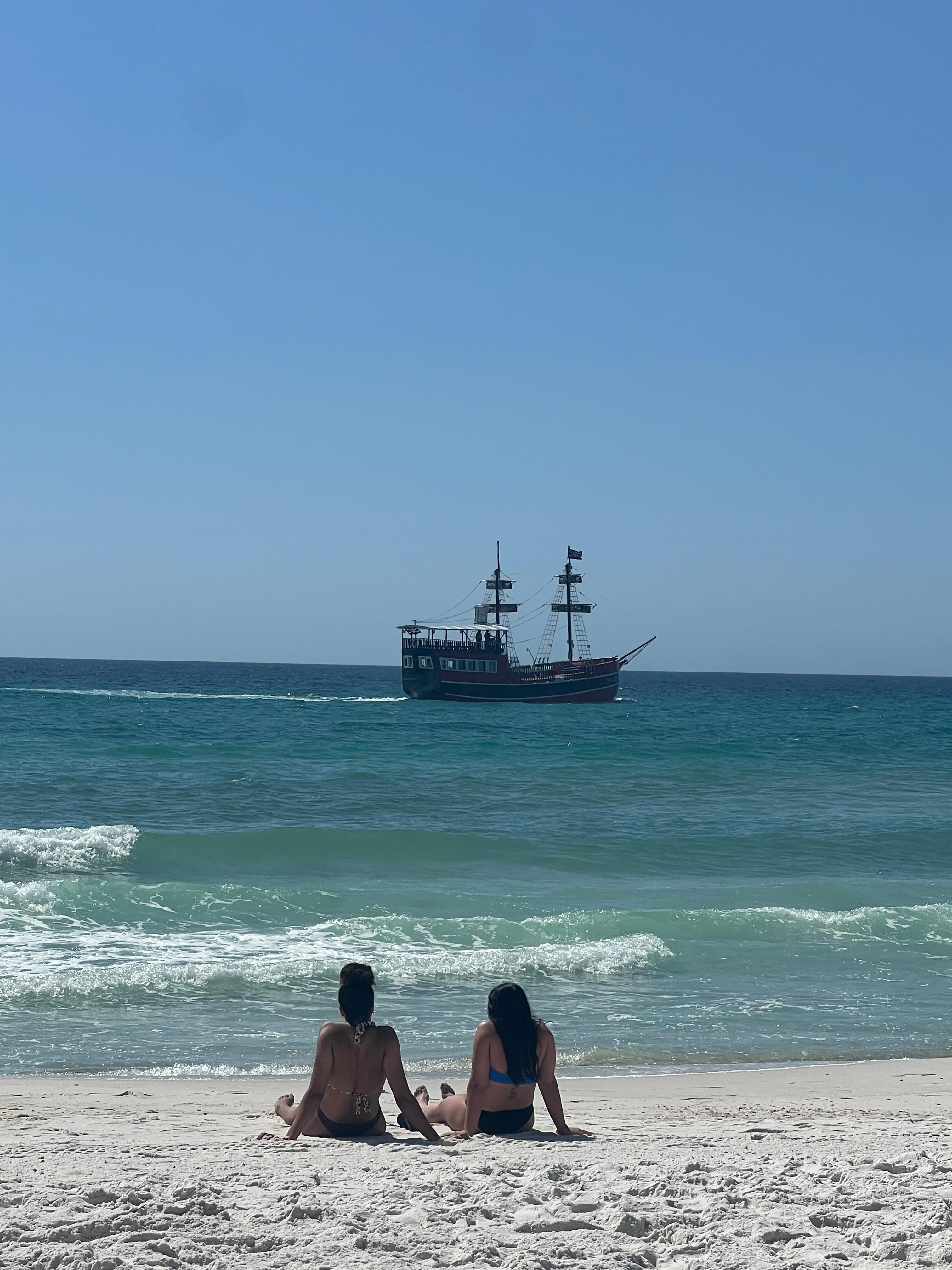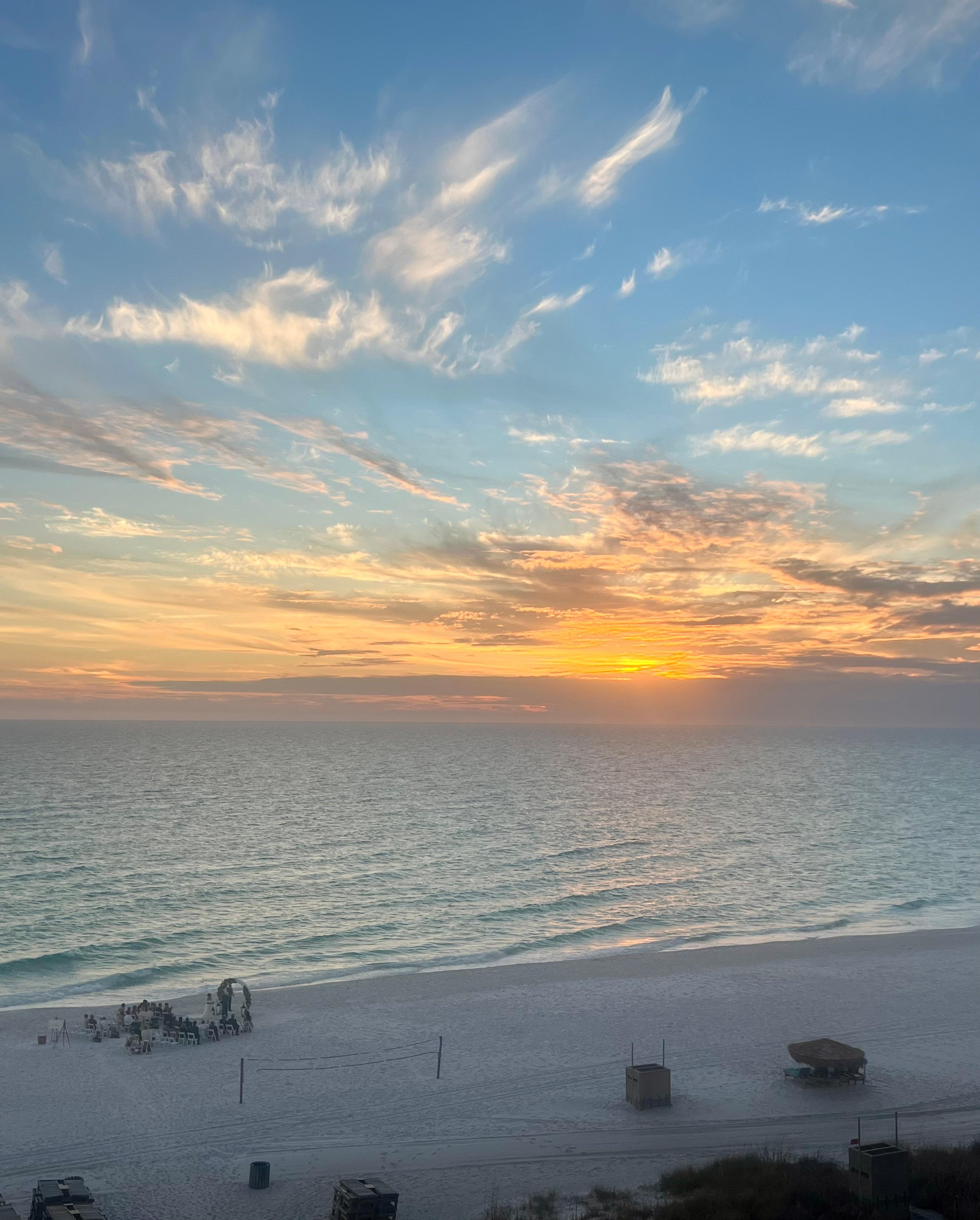 Spacious beachy oceanfront 2-bedroom condo with 2 full bathrooms, a fully-equipped kitchen, large dining room and living room. The master bedroom has a king bed and the 2nd bedroom has 2 queen beds. In the living room, the sofa makes into a queen sleeper. A private balcony, accessible from both the living room and master bedroom, has lovely deck furniture so you can enjoy the view of the Gulf of Mexico all day, and watch the sunset in the evening. New in 2023 - a set of beach chairs with umbrella is included for use by our guests!