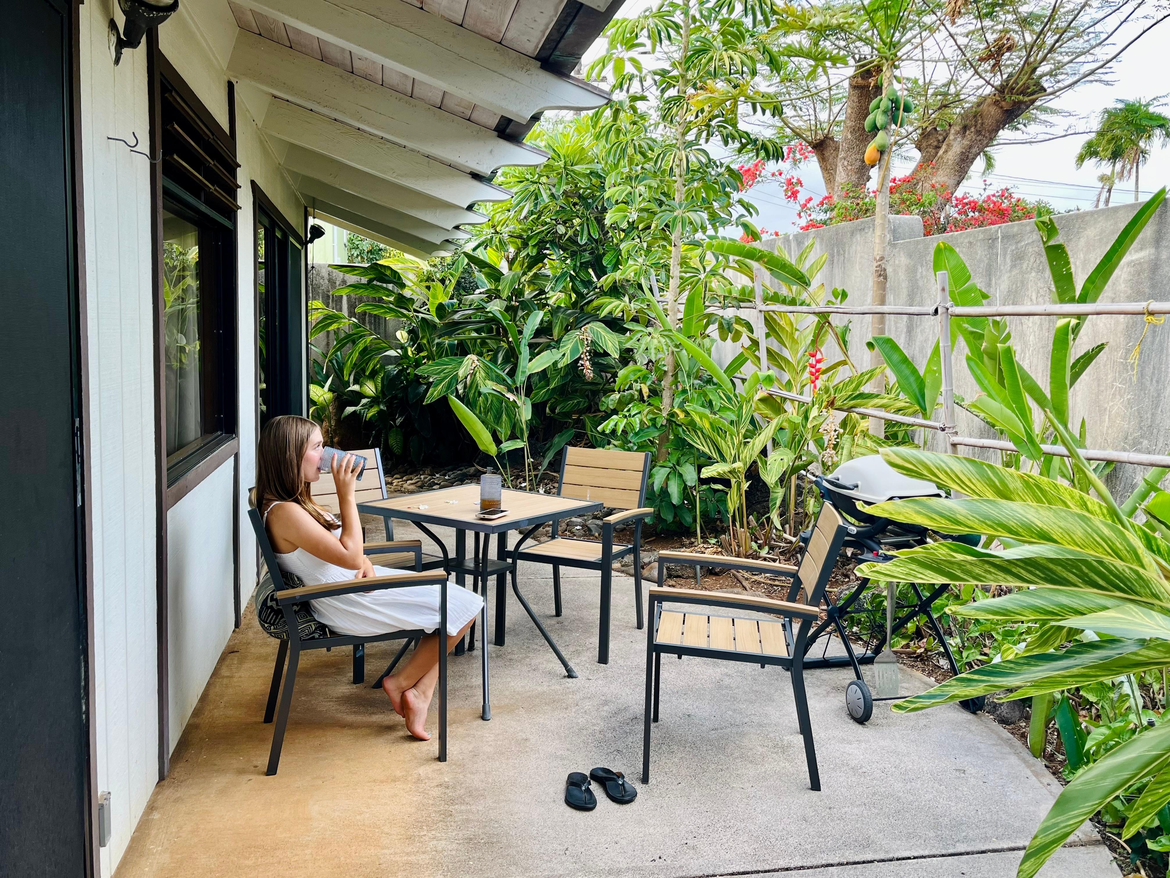 Separated from the Main House by a front yard with Plumeria and Rainbow Eucalyptus Trees, Hibiscus Bush and your designated parking pad. The cottage is fully furnished including a Cal King bedroom, living room with a queen size sofa bed, private tropical garden patio with outdoor seating and Weber gas grill, complete kitchen, dining area, Japanese style “furo” shower/bath (note: these bath are spacious, but have difficult entry/exit and have hard tile corners inside and out and may not be suitable for all people), smart TV, cable, Wi-Fi, three celling fans, and central air conditioning. On the back of the house is located a laundry room with washer and dryer, beach chairs, umbrella, boogie boards and beach towels.
