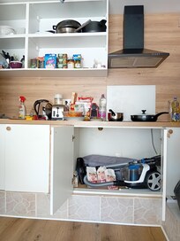 1)Conseil pour améliorer la qualité de service côté cuisine:Installer une étagère dans les placards du bas pour y déposer des casseroles et poêles pour ne pas les chercher à 205cm de hauteur inaccessible pour une personne de taille normale. Voir photos jointes. Donc je pense que les précédents locataires ont abîmés les chaises pour accéder aux poêles à plus de 2 m de hauteur.2) Matériels de cuisine à renouveler : casserole et poêle, j'ai dû acheter une casserole et une poêle neuve3) Préciser dans votre annonce que le logement n'est pas adapté pour PMR car mon épouse est handicapée physique4) Un petit marche pied serait apprécié pour entrer dans la salle d'eau (H26cm actuel), car j'ai dû mettre une palette pour permettre à mon épouse d'entrer dans la salle de bains.5) Déposer une notice sur la table pour les nouveaux arrivants pour rappeler les consignes de départ, du fonctionnement de la TV, du réglage des radiateurs.... le voisin du 1er étage a passé une heure pour nous installer Free pour obtenir simplement les chaines TNT classiques.6) prévoir le changement du matelas7) prévoir la réparation de 2 chaises8) odeur nauséabonde provenant des toilettes, bonde douche?