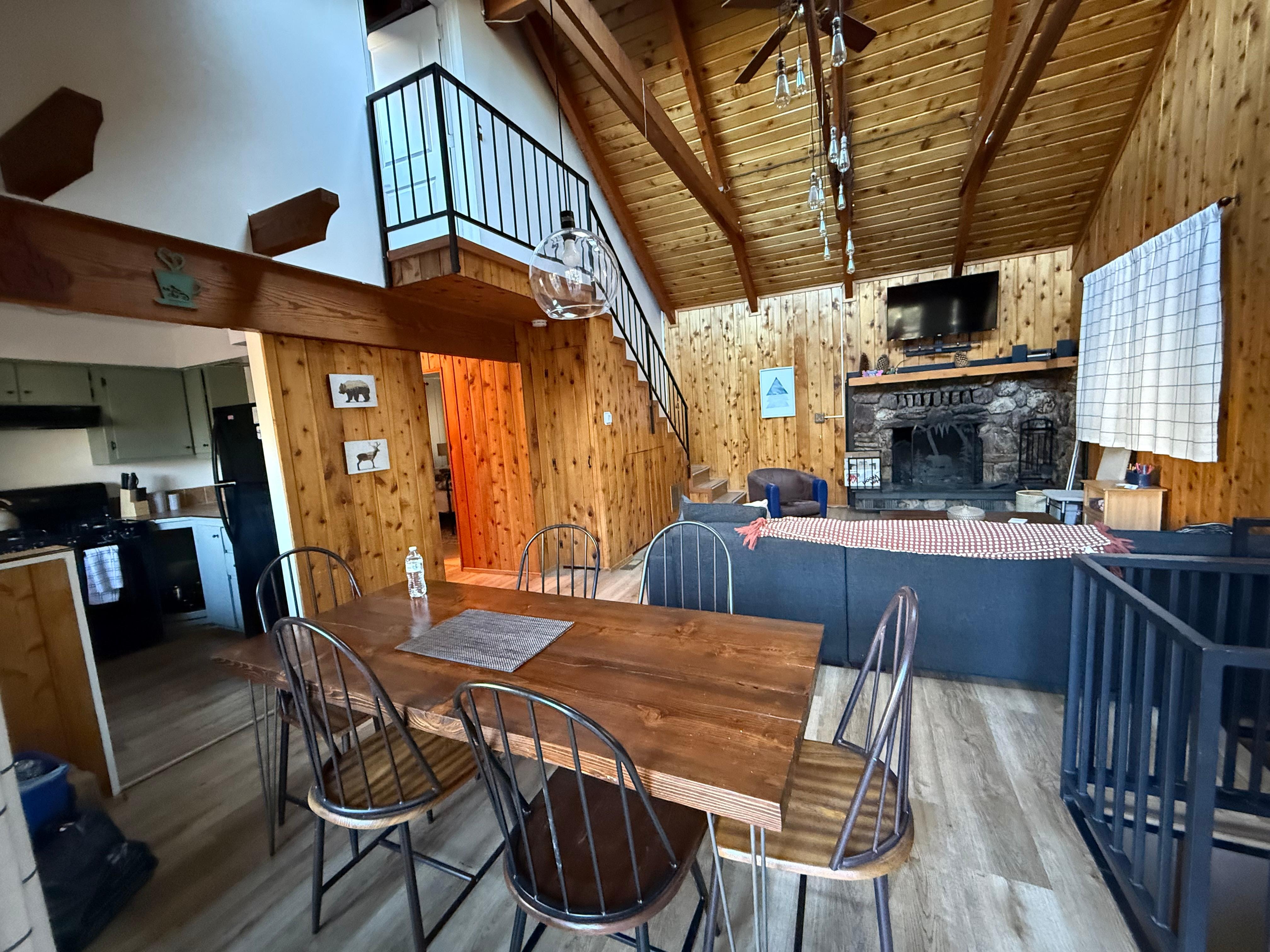 Idy Hideaway is a beautiful forest green retreat that seamlessly blends into its natural surroundings. Tucked away amidst the pine trees, this charming 3-level cabin can comfortably accommodate up to 8 guests. The main floor offers an open layout, showcasing a living and dining area complete with a grand fireplace and a wood-burning stove. Skylights set into the vaulted ceilings and a large sliding glass door allow plenty of natural light to filter in, providing forest views from every angle.