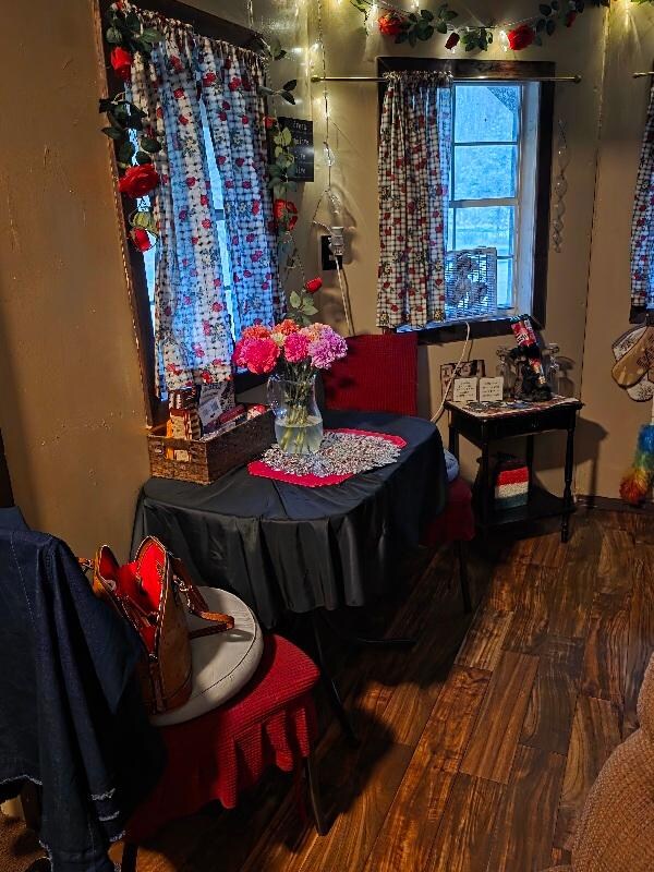 A quiet cabin set up to be comfy , homey with a lil bit of old time charm with a porch to sit on n enjoy the birds , you can expect a bottle of sparkling juice hersheys kisses and a few rose petals here n there , candy in the dishes and tons of pillows . There is a hotplate. microwave , toaster and a coffeepot in the kitchen. Teas , hot cocoa even the coffee , creamer n sugar and a few bottles of water in the fridge if you need it and its not there let us know ...Now during the warmer months there is an outside shower , one towel provided ❤ We do have a camper on the property that is sometimes rented if this is an issue just let us know ❤️❤️❤️