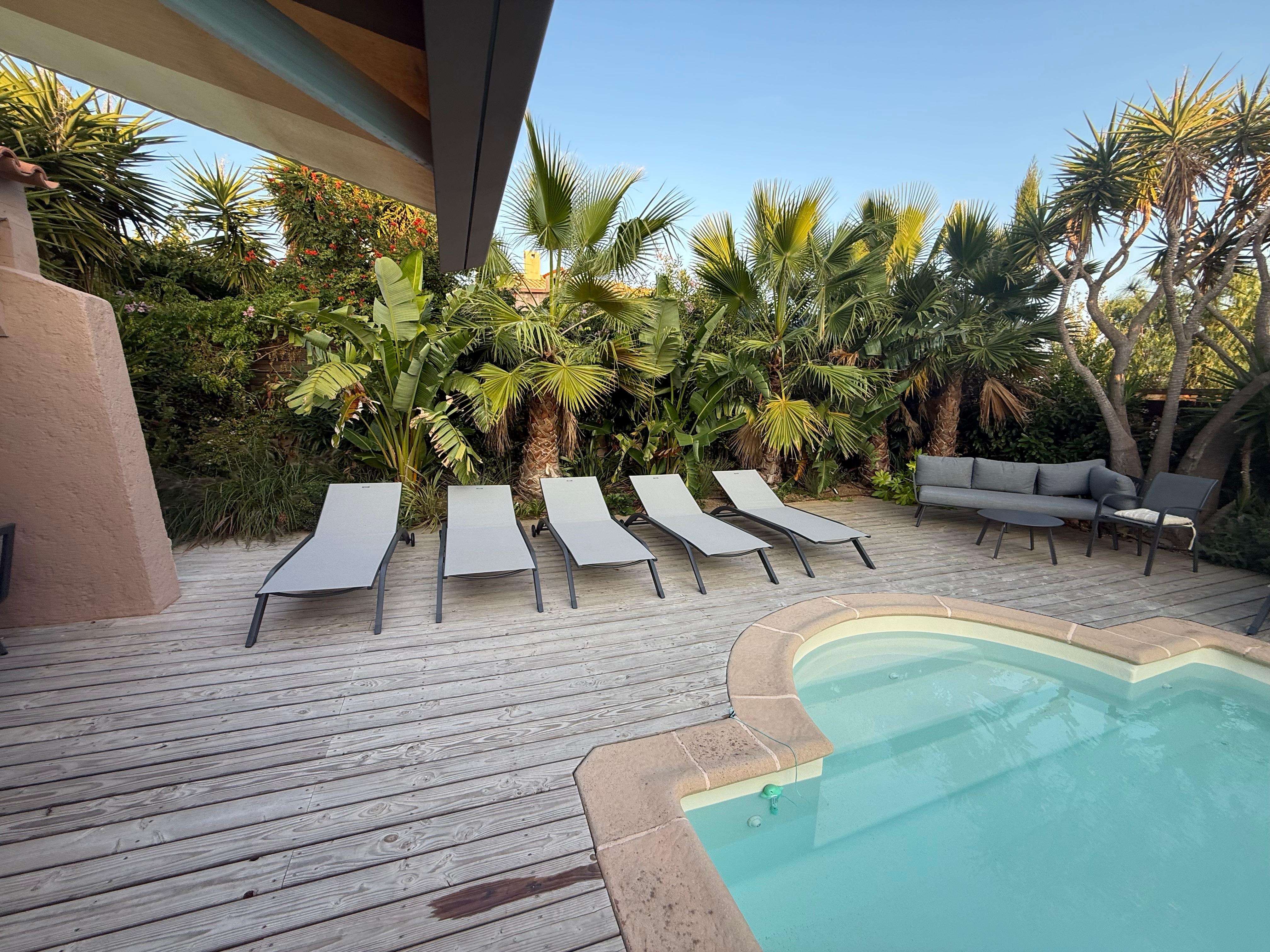 This charming, fully refurbished villa welcomes you, your family or friends for a relaxing holiday in a lush green setting close to the sea. Situated in the private and secure Anthéor estate, the environment is calm and privileged. With a floor area of around 200m², this beautiful house offers you: a beautiful living room with a cosy atmosphere, including a dining area (large table for 10 people), a sofa area and a relaxation area with a TV corner; an open-plan kitchen fully equipped with quality appliances including fridge, oven, microwave, Nespresso coffee machine, toaster, kettle, etc. (plus a utility room). On the same level, there is a shower room with WC, a first bedroom with a 160x200 double bed, a second bedroom with a 160x200 double bed, and a second shower room with WC.