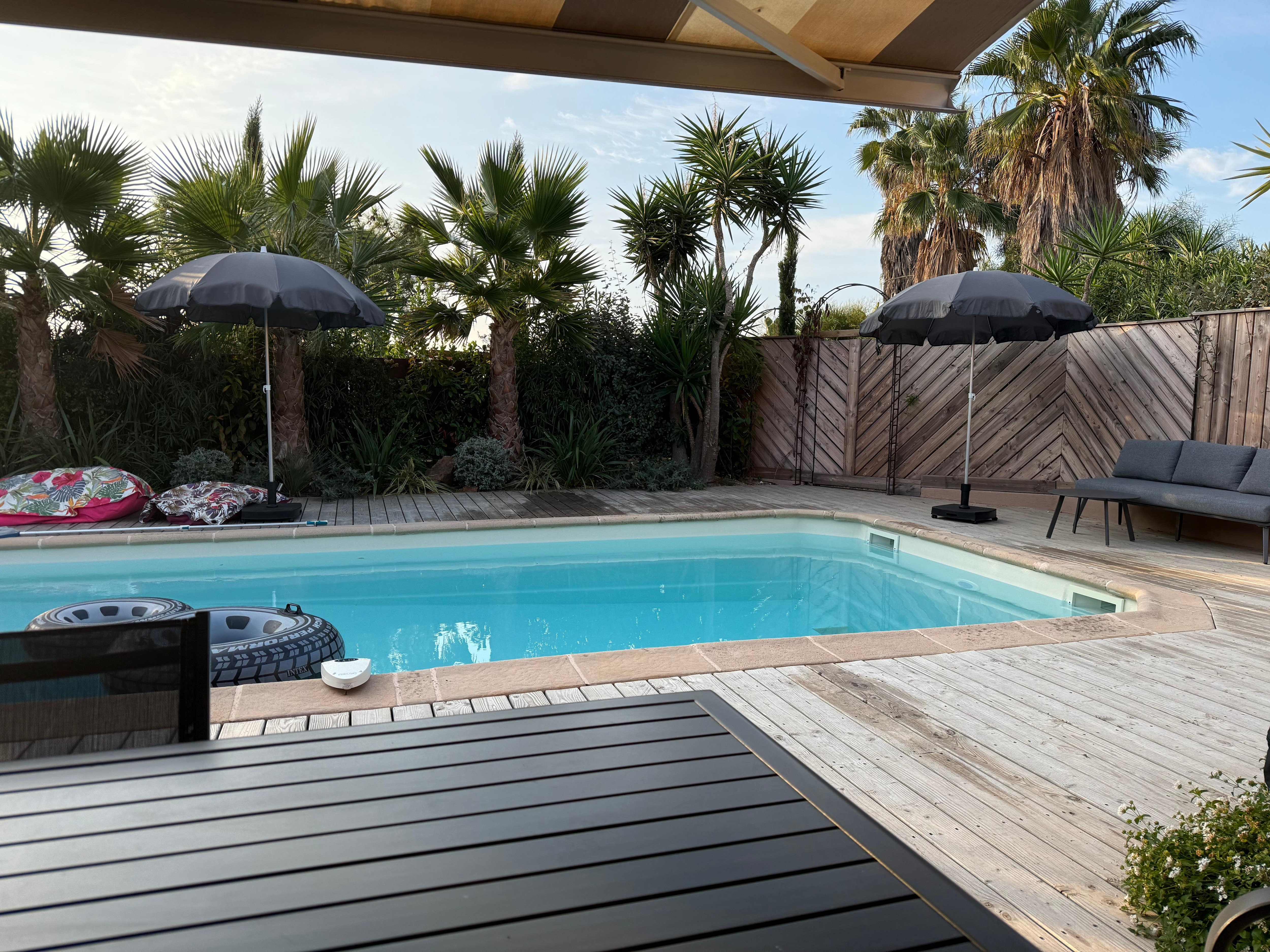 Outside, the living room and kitchen open onto a lovely terrace, part of which is covered by the roof and extended by a large sun blind. Sheltered from the sun, you'll have a large table and chairs, with a gas plancha for all your outdoor meals. Surrounded by a magnificent landscaped garden, a vast wooden terrace frames the beautiful swimming pool (approx. 11m x 5m), where you can enjoy refreshing activities as well as relaxing: sofas, sun loungers, parasols, everything is there to invite you to laze around.