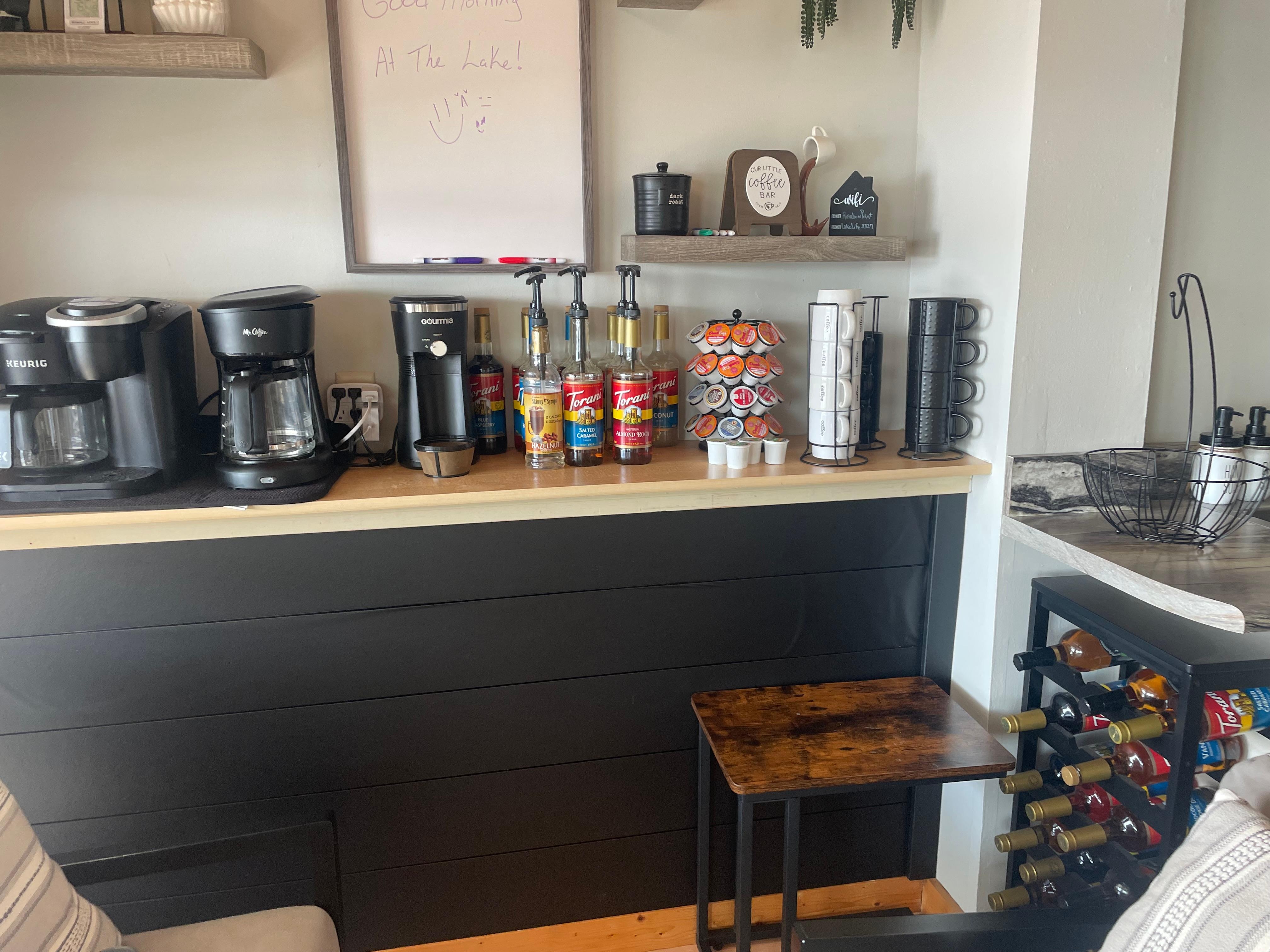 Coffee bar with both a Keurig (single-serve) and a full carafe—perfect for enjoying peaceful mornings with lake views.