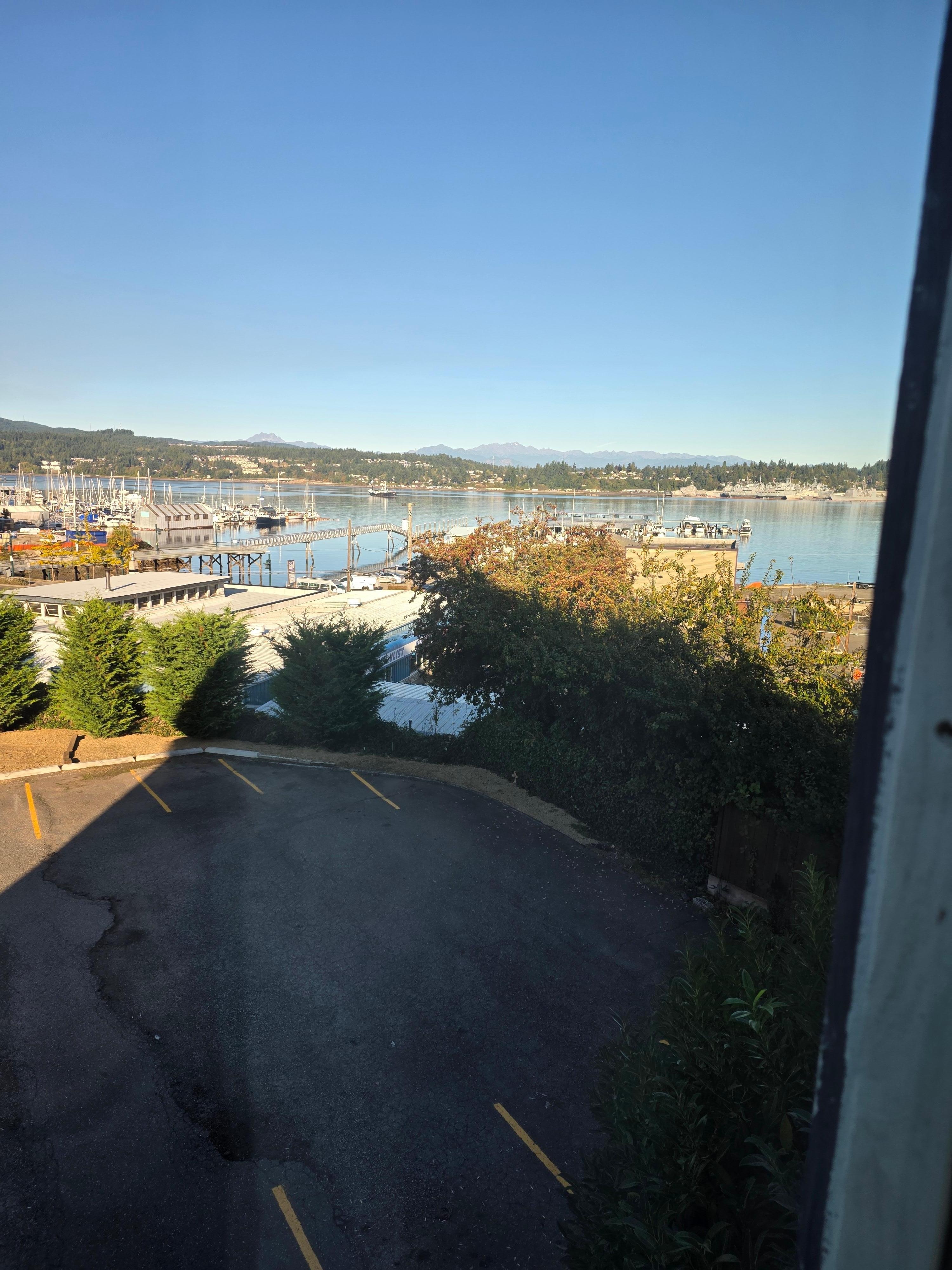 Located one block off the main street in downtown Port Orchard, cozy, large studio private apartment complete with a full kitchen, living room, comfy bedroom with its own entry. A view of the Sinclaire Inlete from the living room.