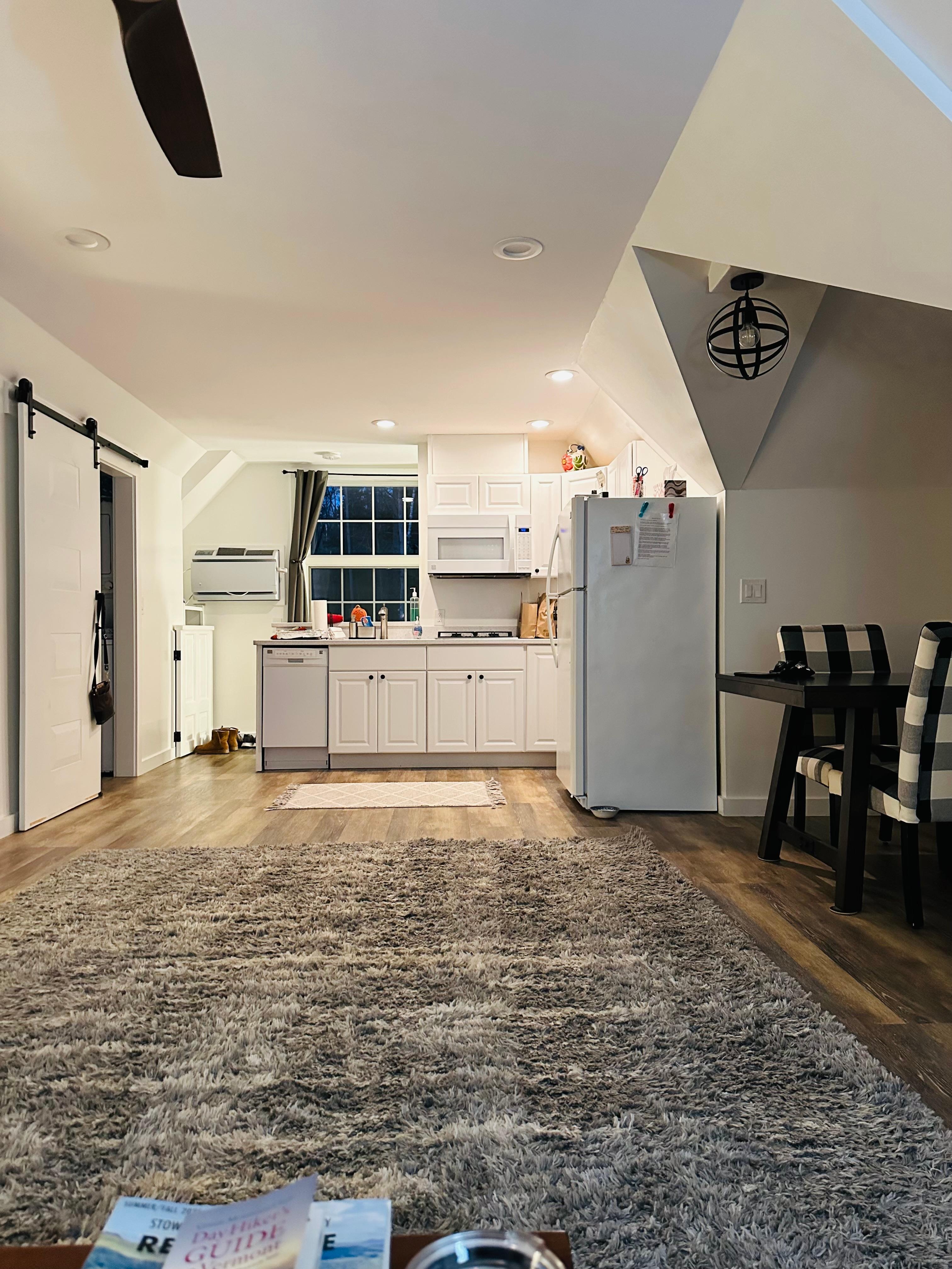 Enjoy Vermont living in this stylish and chic loft style studio just 1.5 miles from the charming village of Stowe. This newly appointed space has everything you need for a relaxing getaway. Comfortable living area, king size bed, dining table and kitchen with stove, microwave/convection oven, dishwasher and more. Relax in the jetted tub after a day on the slopes or trails, and it convientntly has a washer/dryer on site. Mt. Mansfield is under 10 miles away and hiking trails including Pinnacle and Kirchner Woods are just around the corner. Located on the second floor of a newly constructed "barn" on a country road surrounded by woods and overlooks a lovely pond.
