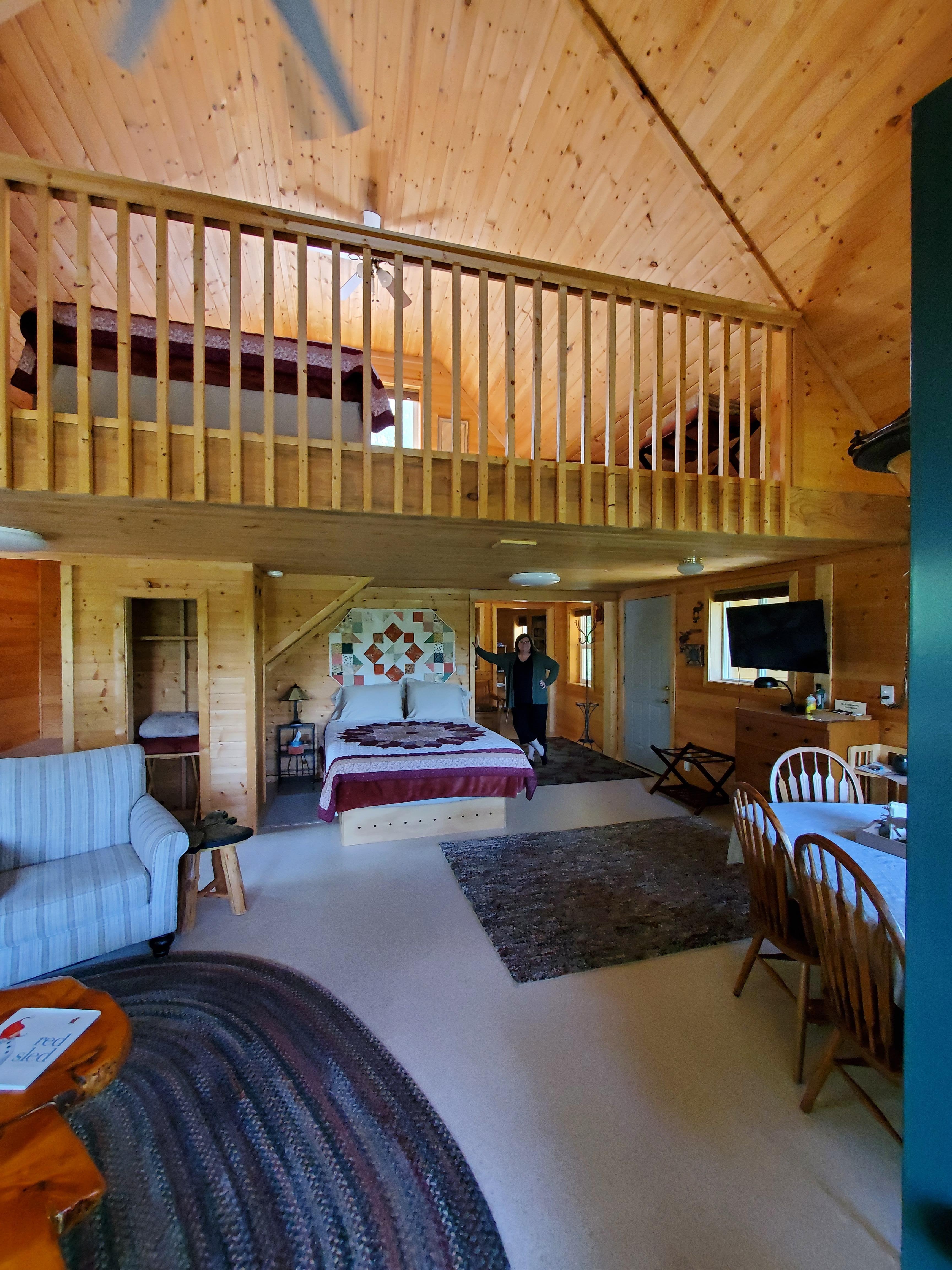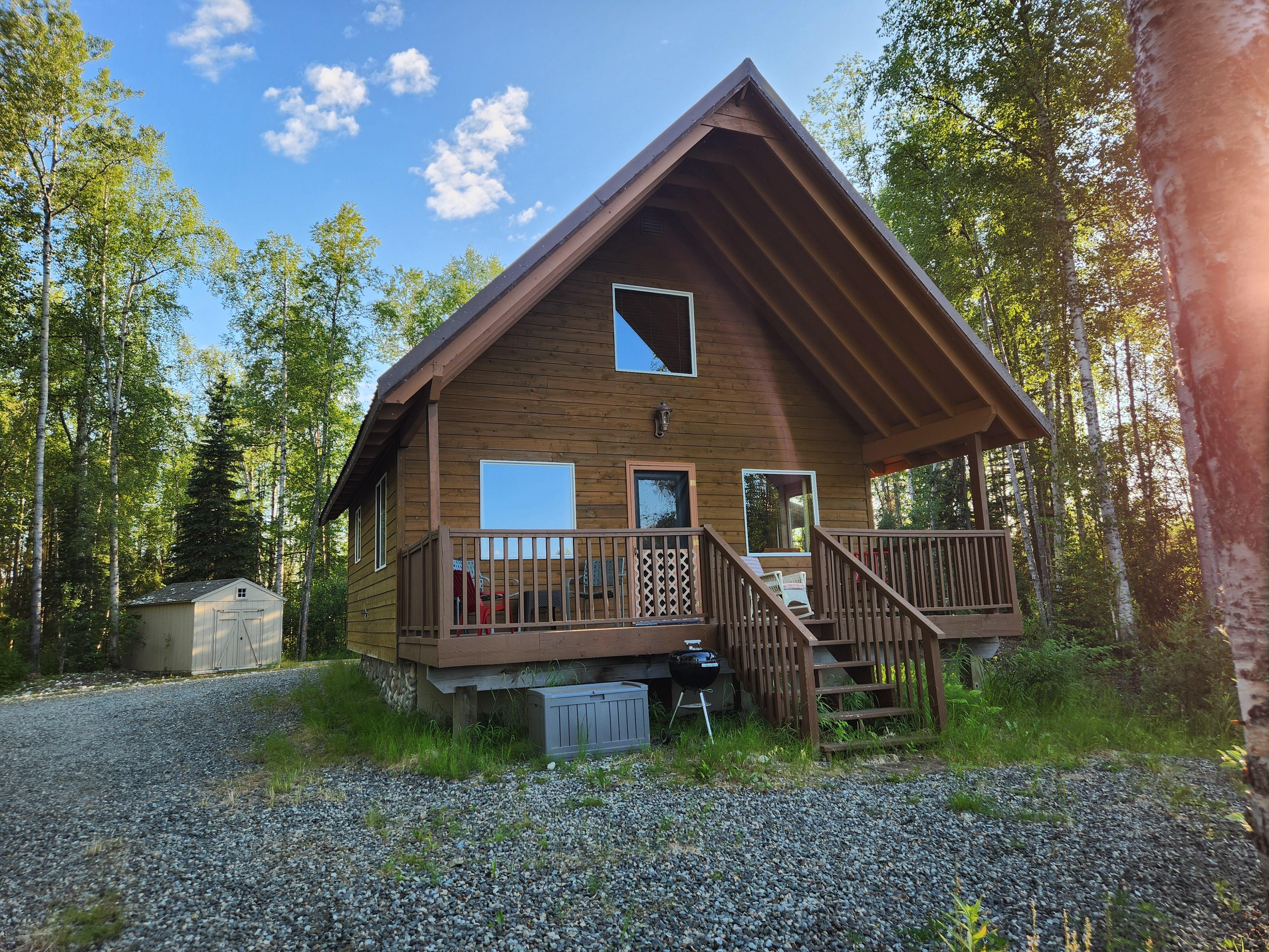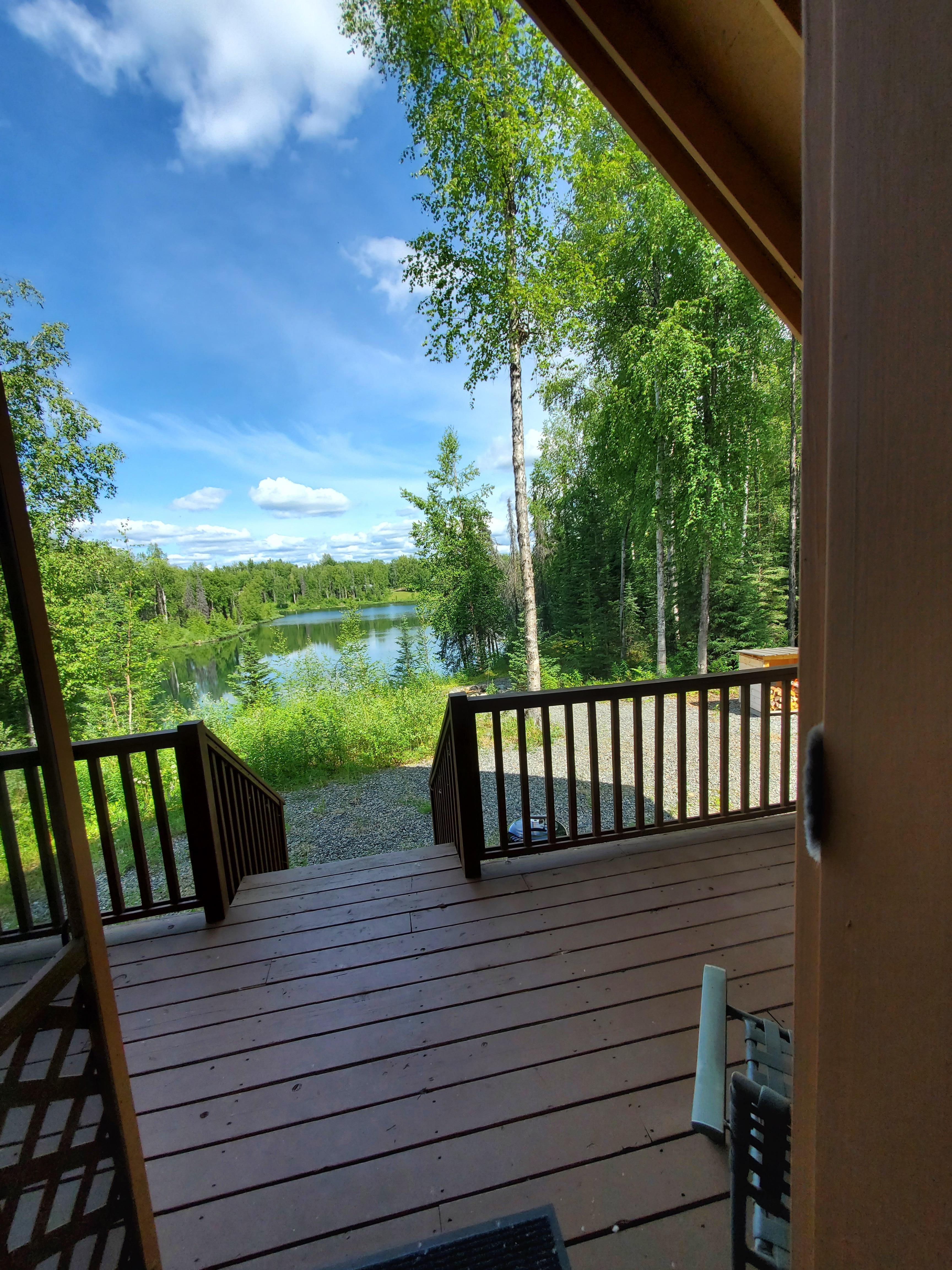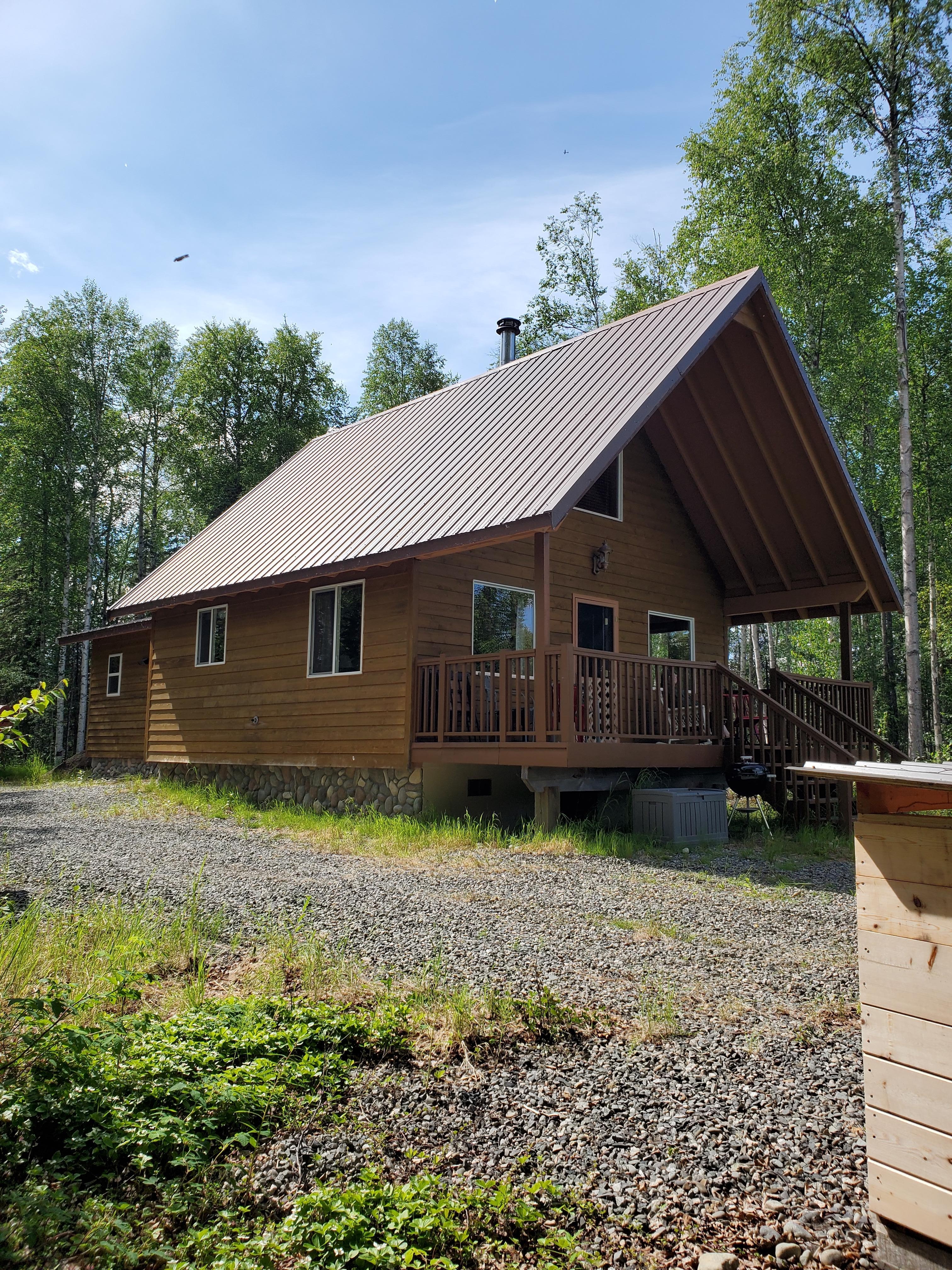 A great home base for taking advantage of all Talkeetna has to offer, or as a quiet retreat from the world in your own private environment. The “Red Sled” is perfect for sharing with others or for a family, with a new queen bed on the main floor along with the bathroom, and a second queen plus a twin in the loft bedroom which is open to main floor below. Lake views abound everywhere in your cabin, or step out onto the spacious covered front porch to take in the sounds of nature while enjoying the lake. Summer or winter, listen to the loons or catch a midnight view of the aurora borealis, the Red Sled offers a private lakefront retreat in the woods year-round.