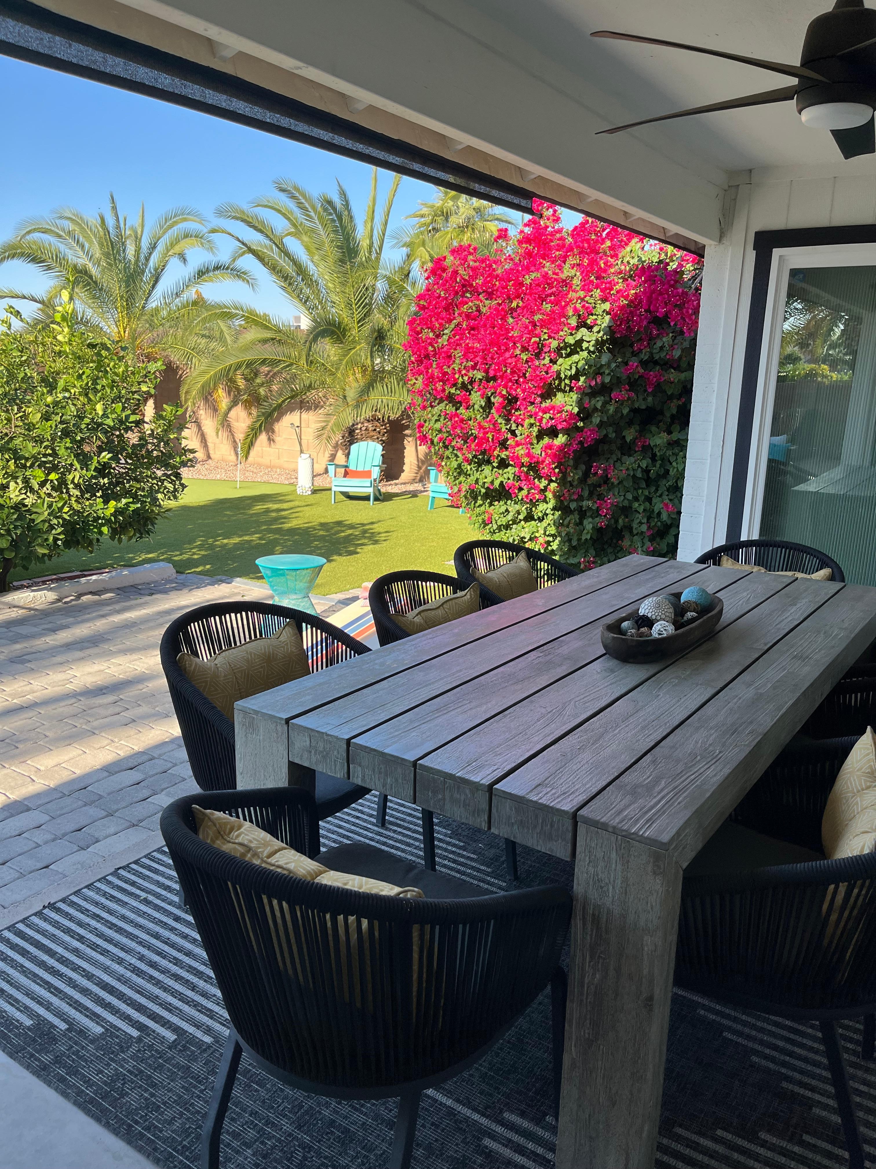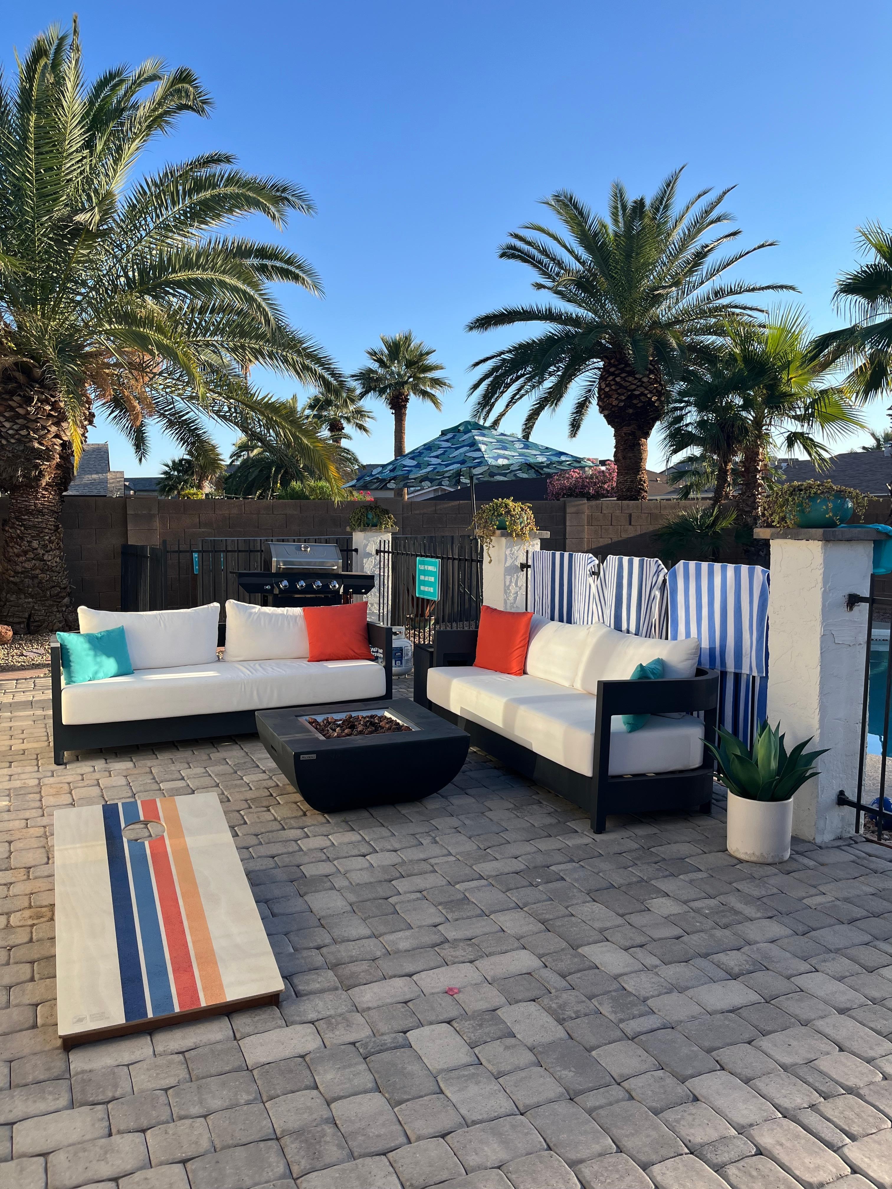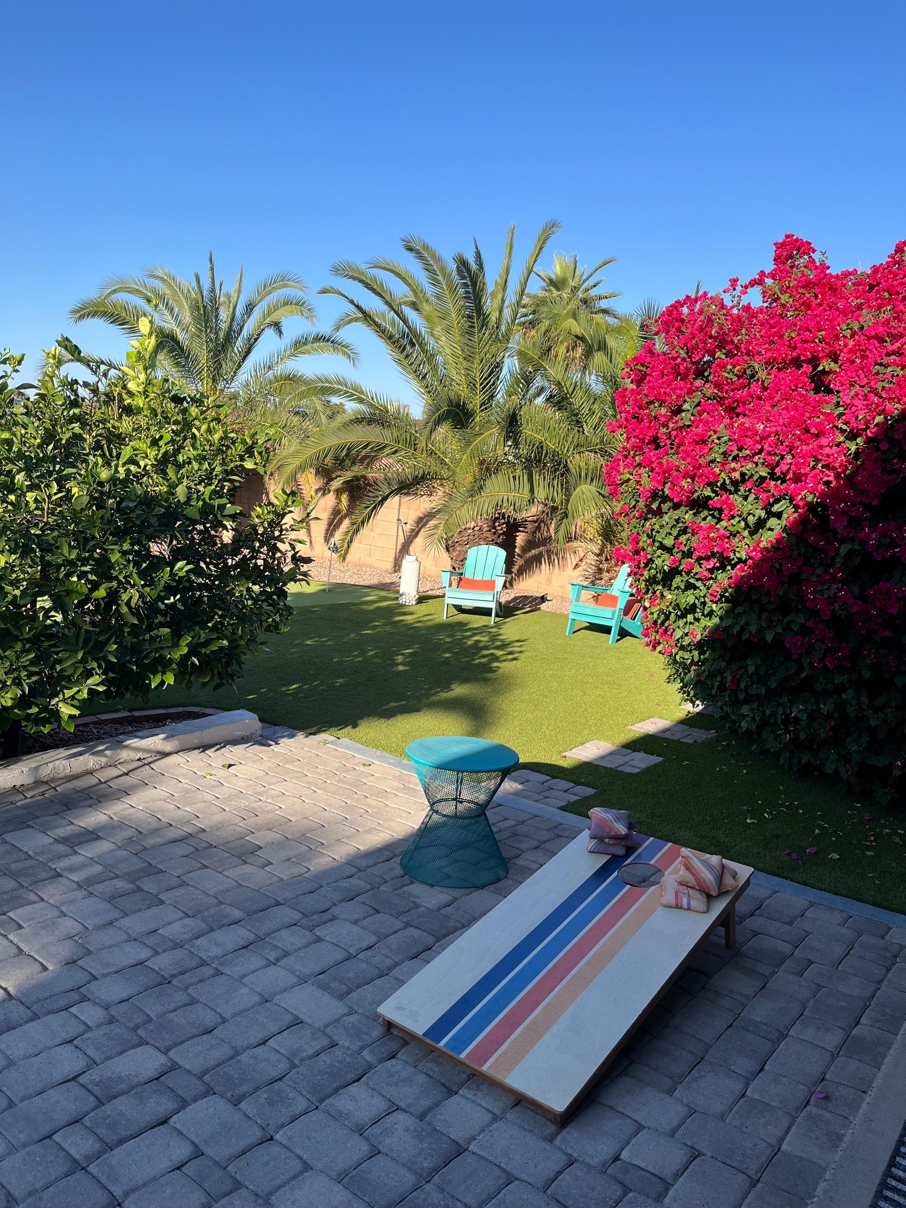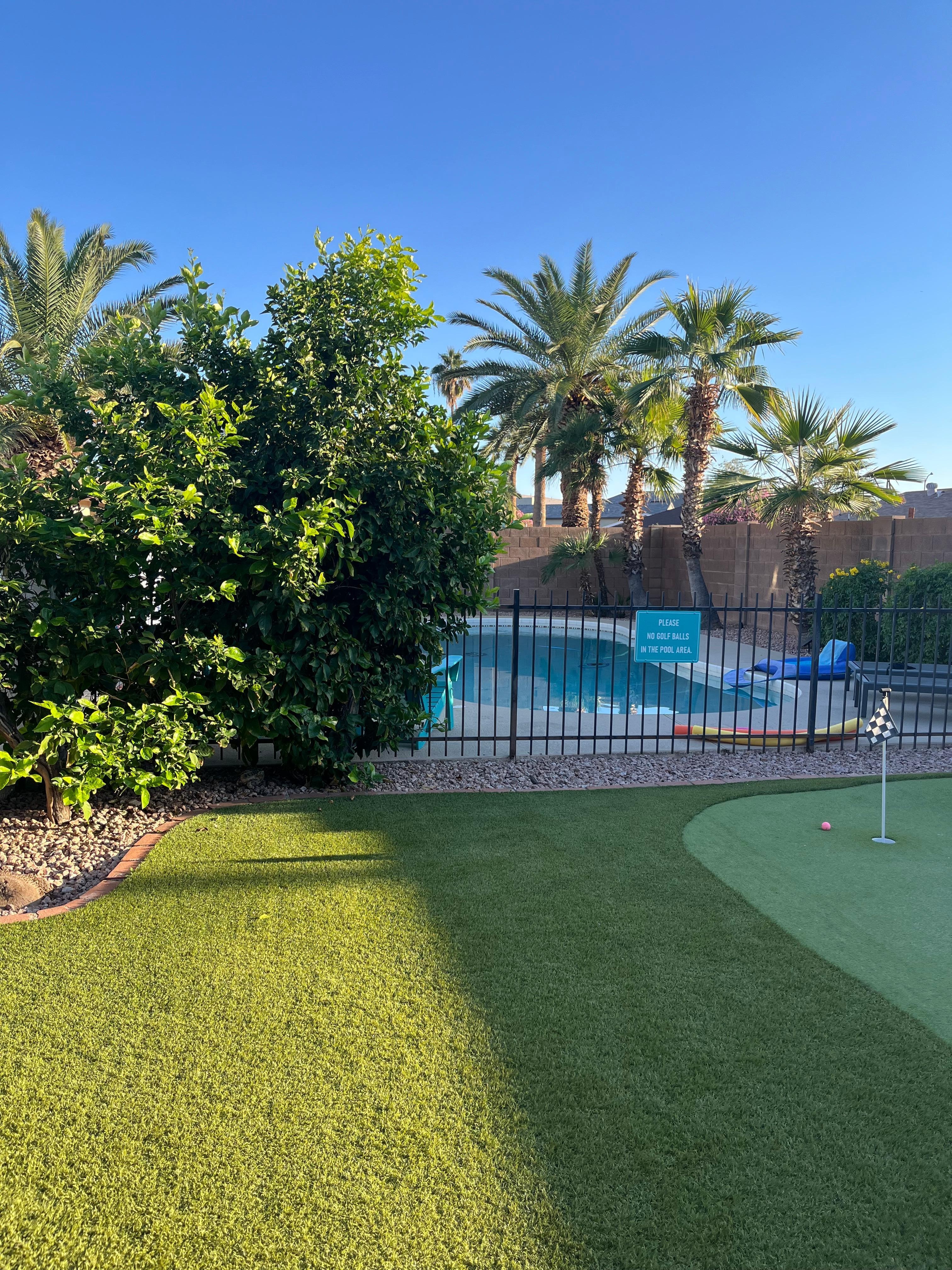 A vacation oasis awaits at this charming home! The enclosed yard surrounded by lush landscape offers the perfect spot to unwind. Lounge beside your private pool, which can be heated for an additional fee, and bask in the Arizona sun. While the chef in your group sizzles recipes on the gas grill, play a game of cornhole or practice your swing on the putting green. Dine alfresco under the shade of the covered table, then make s'mores for dessert around the gas firepit.