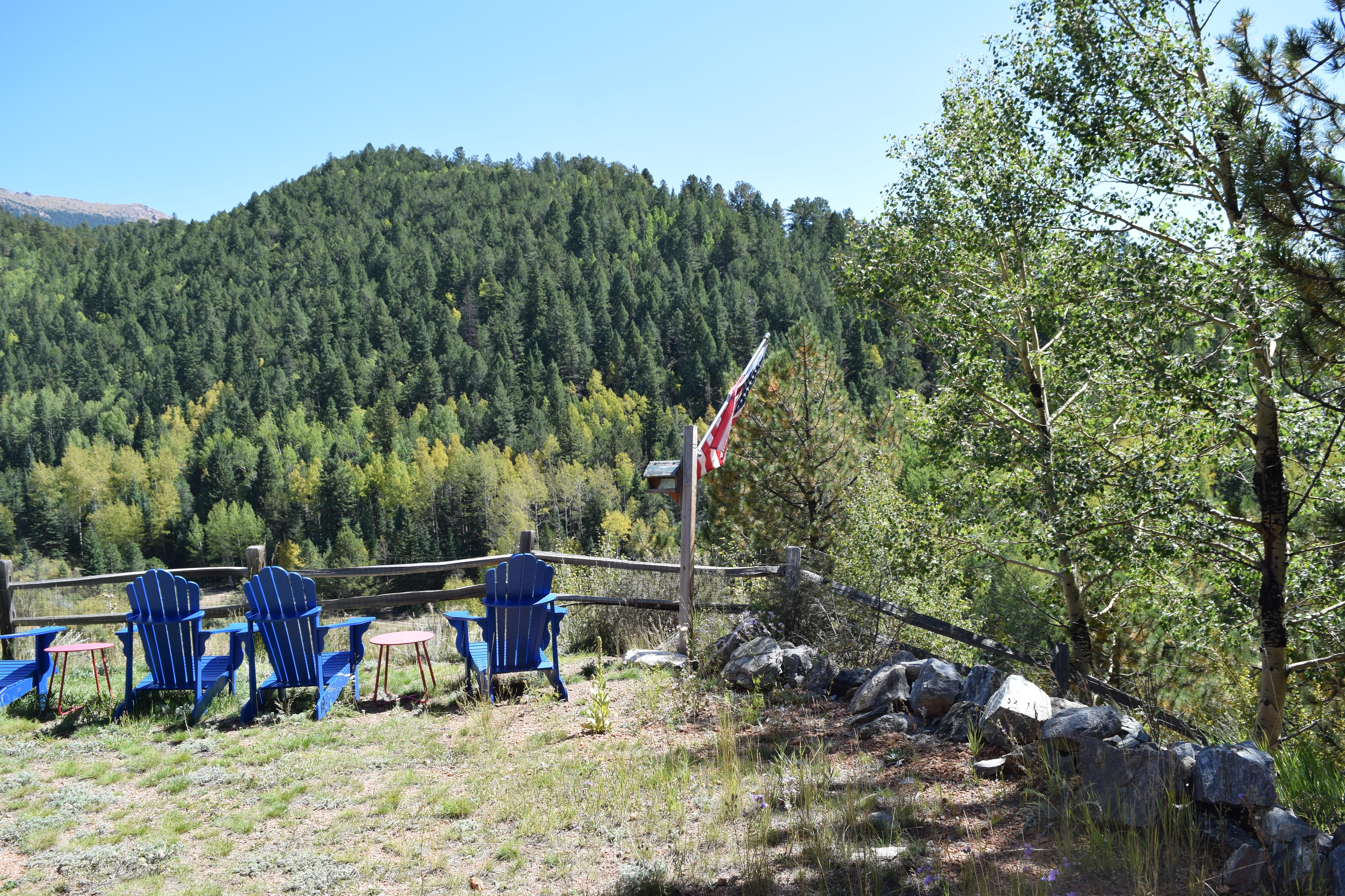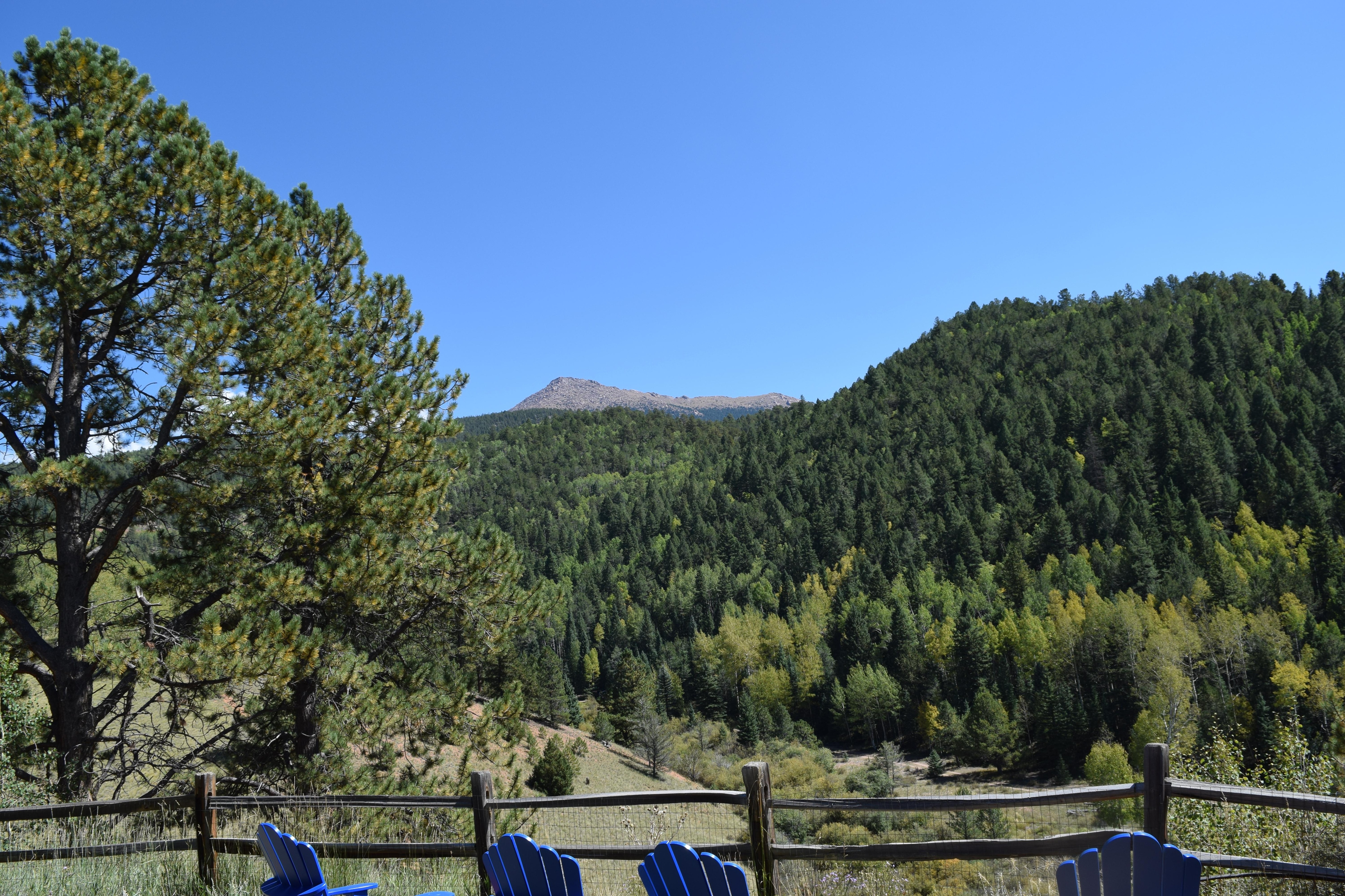 With CLOSEUP views of Pikes Peak’s Sentinel Point, “Rocky Mountain Heights” is perfect for vacations and getaways for couples, friends, or small families. It also is a fabulous spot for “working from home,” with new Starlink high speed internet. The cabin is on 3.2 acres atop a hill in the western foothills of Pikes Peak. View Pikes Peak’s Sentinel Point from the sunroom, or the Adirondack lawn chairs. Hundreds of acres of undeveloped, forested hills provide privacy and amazing views. As you view down the stunning valleys, listen to the narrow mountain stream that flows into the beaver ponds on our neighbor’s private property. Watch for the yearly visits of mama moose with their newborns. Wildlife abounds, with moose and elk nearby, with mule deer grazing in our yard, and forest animals and birds cheering your spirits. From 9,500 ft, unplug, relax, and watch beautiful sunrises, brilliant stars, quaking Aspen, and silent snowfalls. Security/Game cameras are installed in the front and back of the property. The cabin is one level, with no stairs and easy parking, and a low-fenced front and backyard for the kiddos. A glass-bead firepit dining set is in the covered area near the propane bbq grill.
