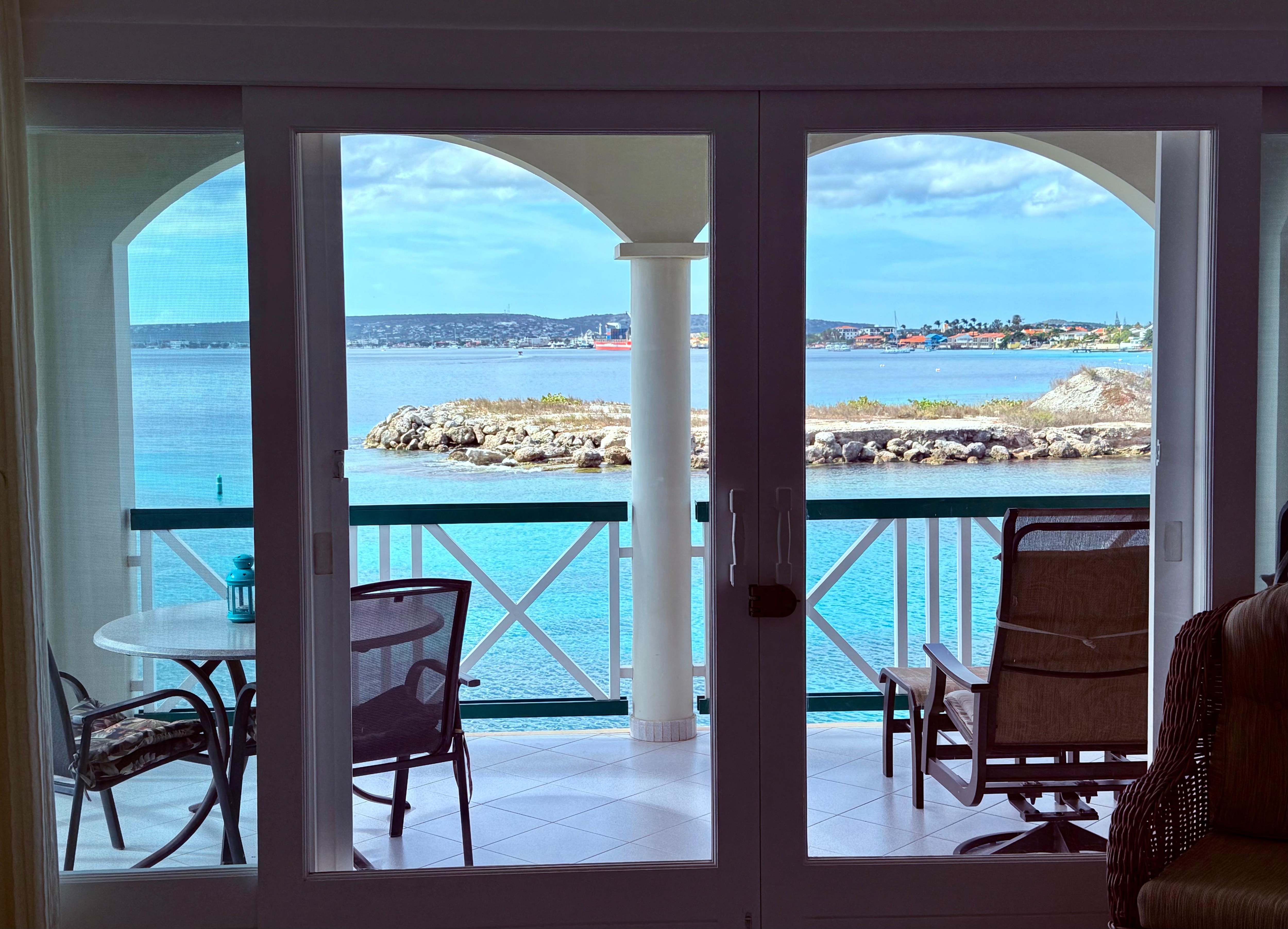 Welcome to OceanScape Bonaire, your beautiful Bonaire oceanfront condo! You won't believe your eyes when you experience your fabulous view. Your condo is located in the secured access GATED community, Port Bonaire Residencia, located just across the street from the airport. The bright, sunny one bedroom condo affords superb privacy, located all the way at the end of the beautiful Dutch-styled building with a panoramic view across the ocean to Kralendijk, Klein Bonaire and the northern mountains of Washington Slaagbai Park. But just turn your head and you have the added bonus of a view across Donkey Beach and those gorgeous Bonaire sunsets to the West. That's right, since you are on the corner, you have a 270 degree view that cannot be surpassed. There is nothing quite like relaxing on the balcony after a long day of diving or snorkeling, glass of wine in hand, to watch the sunset into the ocean. Although waking up, pouring a cup of coffee and meandering out on the balcony to see dolphins arching across the water while a cruise ship passes by to port in Kralendijk is not too bad either!