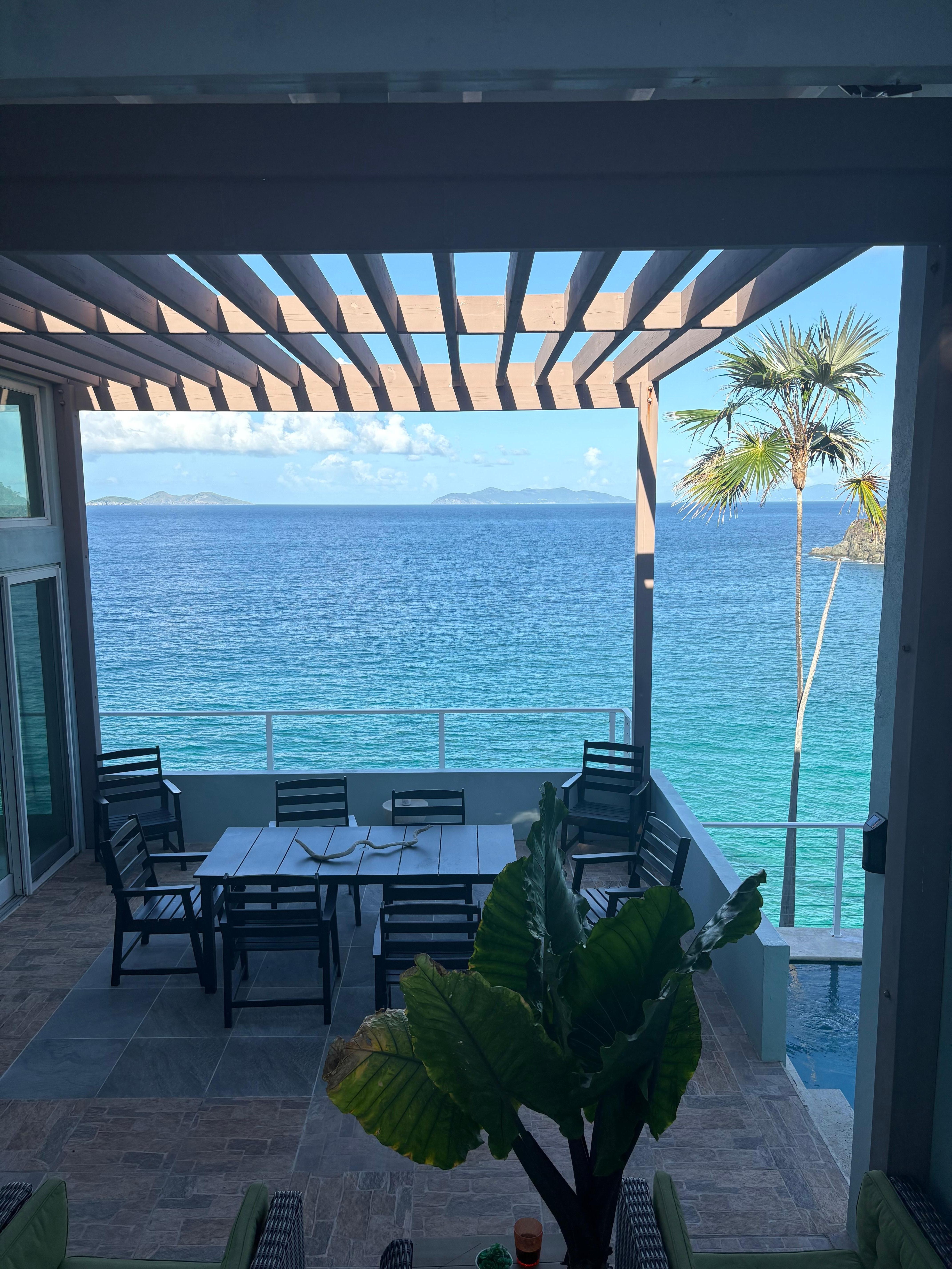 Gorgeous Caribbean paradise with 3 private bedrooms w/ ensuite bathrooms all luxuriously appointed and fully remodeled. Sprawling living and kitchen layout perfect for larger groups to get together and enjoy stunning ocean views with direct line of site over to White Bay in the BVI, Tortola, Hans Lollik and Mandahl Beach/Salt Pond. The villa is equipped with multiple patio areas that allow the trade-winds to blow through the property for comfortable outdoor living. Huge Pergola covering the main outdoor living space with outdoor dining table/chairs. Look directly out at the turquoise Caribbean water with multi-million dollar views through the palm trees and down at crashing waves and sailboats passing by. Grab our binoculars and view whales migrating during the winter months. Step into the pool equipped with color changing LED light and relax all day with a drink and a good book. The pool gets excellent morning sun keeping it warm throughout the day. Built in ledge allowing for sunbathing or reading/relaxing. Step up to the upper deck and enjoy the lounge chairs and let the stress melt away. House is fully stocked with everything you'll need for your stay including beach chairs, snorkel gear, beach bags, beach towels, regular high quality towels, linens, extra pillows, soaps/shampoo's and bathroom essentials. Kitchen is fully equipped w/ everything you'd expect including small appliances ( toaster, griddle, coffee maker, keurig w/ k cups, blender) pots/pans/bowls, cups, glasses, coffee mugs, cutlery, baking pans/sheets and a gourmet commercial gas range/oven. High Speed Internet/WIFI provided & SMART-TV's in each room with SLING cable service & equipped with Netflix, Amazon Prime, Hulu and more. House is equipped with Solar Panels and Tesla Battery Back Up system to maintain electrical service during any outages that could occur. High end 5 stage water purification onsite with Ultra Violet & reverse osmosis filtering. The Villa is gorgeously landscaped with flowering plants, palms, fruit trees, and tropical underbrush. Home is very private with no line of site views from any other homes for a truly secluded feel. Driveway is well lit with photo-eye lighted path and motion sensing LED lights at entrances. 7-10 minute drive to Magens Bay Beach which is one of the top 10 beaches in the world. 3 minute drive to Mandahl beach and Salt Pond which is like a natural pool the whole family will enjoy. Just a few minutes from shopping/dining and a great central location for touring the island. Be sure to rent a vehicle when you stay at any villa in St Thomas. If this property is booked or you have a larger group, we own and manage another gorgeous villa overlooking Magens Bay Beach w/ private pool. Check out our direct site at RNRVACAYS.COM. Come and be our guest at Good Vibes Only Caribbean Villa!