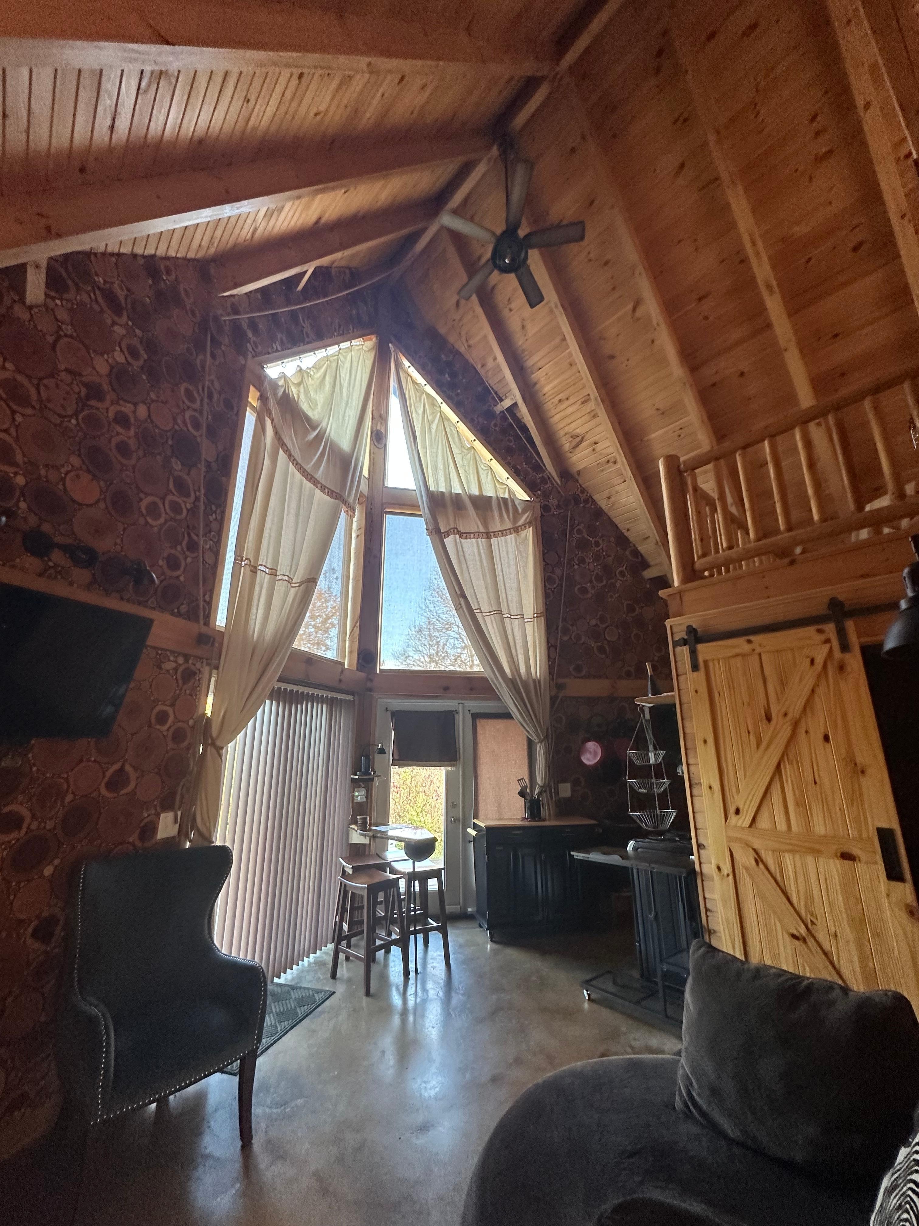 The cabin is complete with a fully equipped galley-style kitchen, stained concrete flooring throughout the first floor, sliding patio doors along with two sets of functional French doors with a third French door set as a backdrop for the suspended log bed. The reading area in the loft features Amish-built rockers from which you can watch the sunsets and a queen log bed.