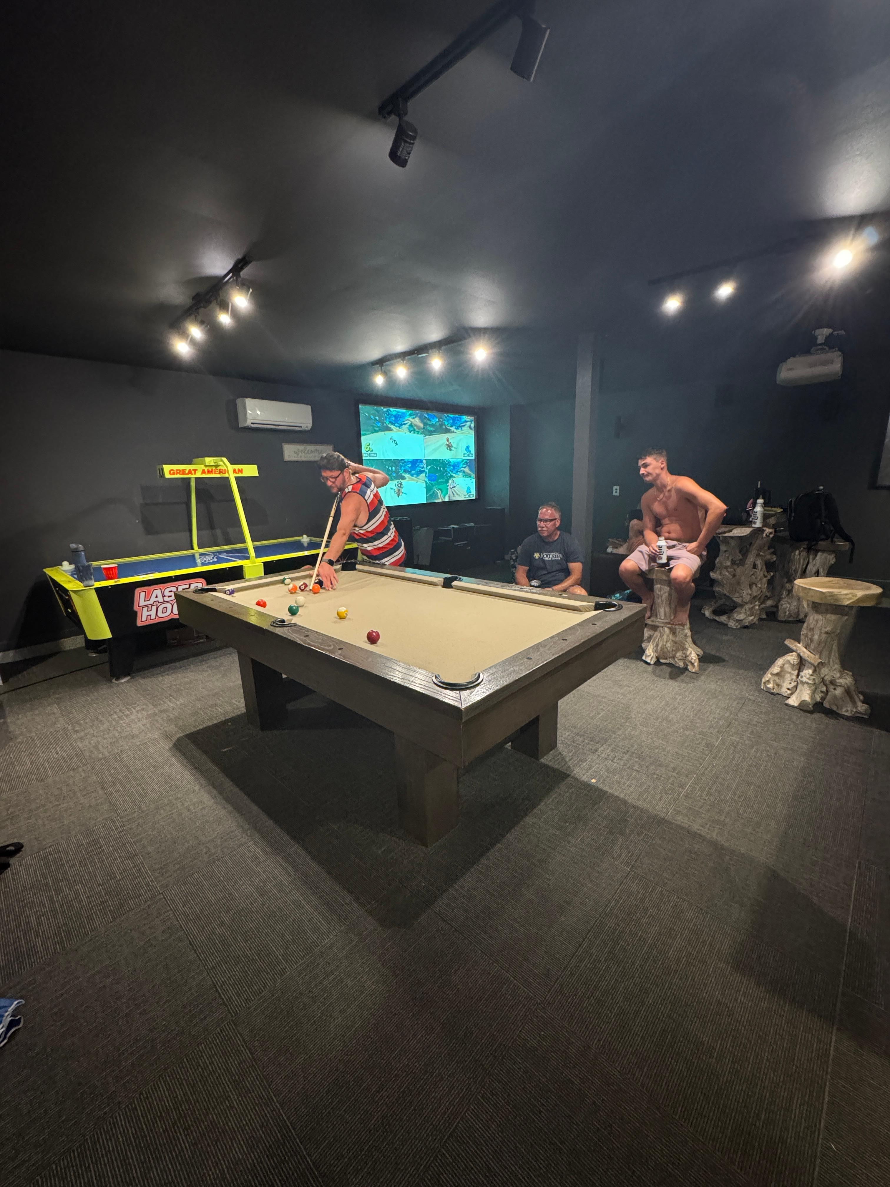 -The game room/movie theater is now a very nice game room with new flooring and the following amenities: pool table, ping pong table, air hockey, shuffleboard, and a movie theater.
