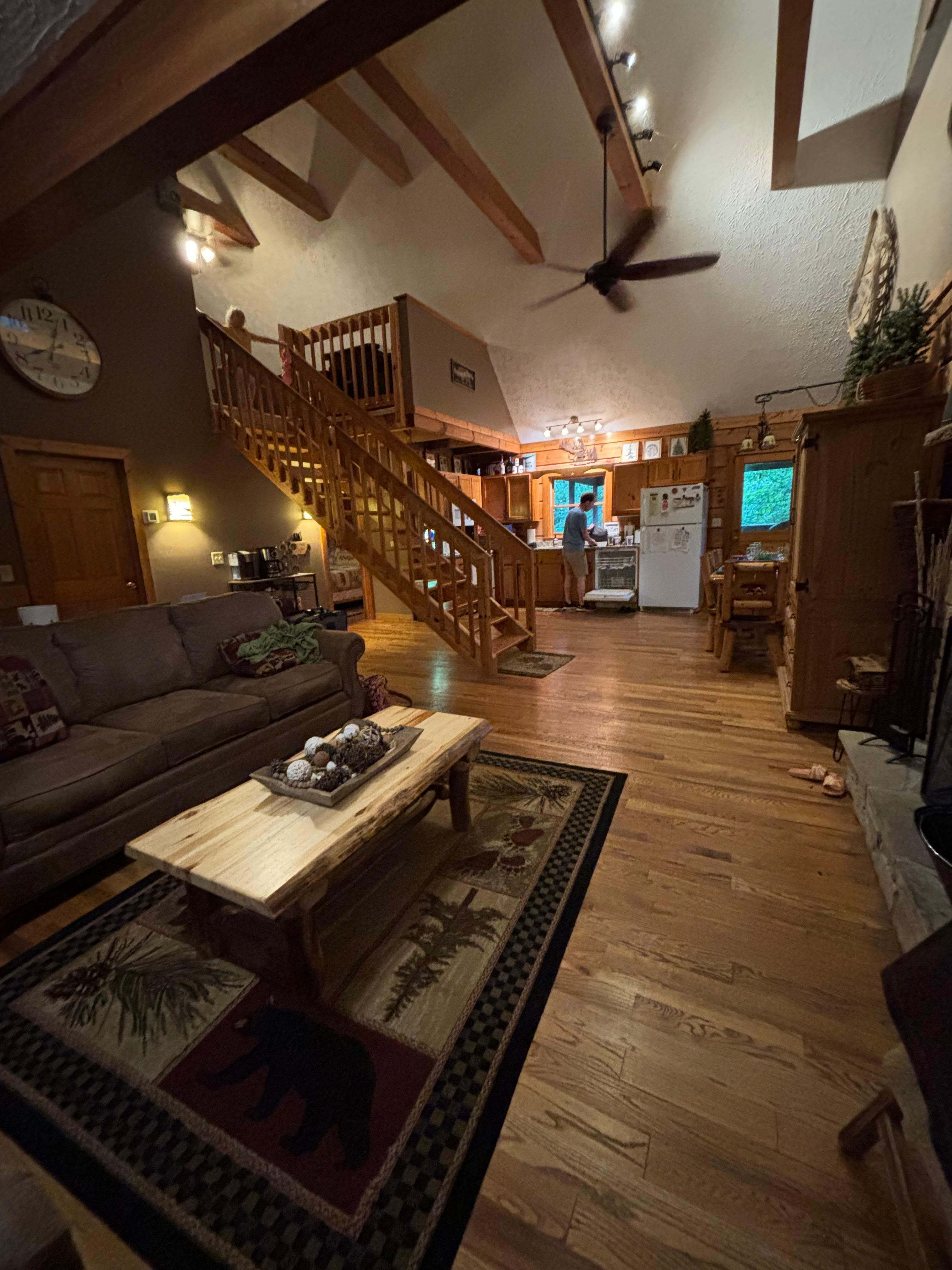 The living room is open concept with high ceilings with a stone stacked wood burning fireplace (operational Oct-March). We provide the initial starter firewood bundle only.