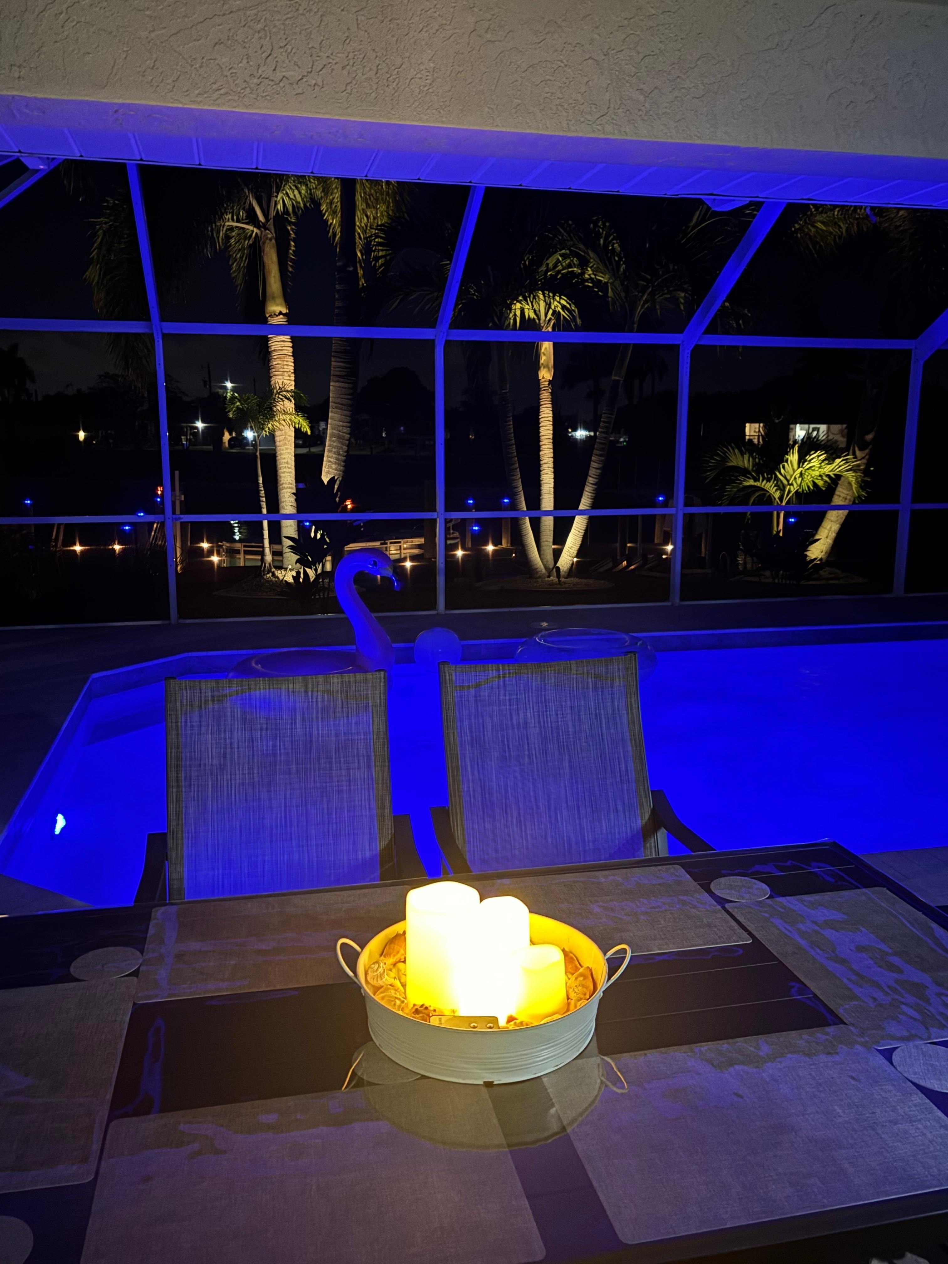 Our family truly enjoyed the time that we spent together at this home. The owners were conveniently located right next door and were basically available 24/7 to answer any questions or address any concerns. The sunrises were some of the most beautiful that i had ever seen. They seemed to shimmer across lake Saratoga for what seemed to be hours. Unfortunately it rained every evening that we were there and the nights were filled with the familiar sounds of southern Florida and a relatively cool breeze. Mosquitoes were not a factor on the patio as it and the pool are completely screened in. The dock, walkways, flowerbeds and large palm treeswere all illuminated in a very elegant lighting scheme. I personally felt like I was worth a million bucks while I sat around the very nice glass filled natural gas fire pit with my husband. My whole family seemed to really relax and do exactly what is intended on vacation. My boys were able to fish right off of the dock or they could use any of 3 supplied kayaks. My daughter stayed in the pool if she wasn't asleep or with us at the beach which is only about a 30-45 minute drive, depending on traffic. Also my kids loved the fact that there is a water park with a pool, slides and a lazy river located basically across the street. I would definitely recommend this place to anyone that is staying anywhere in or around Fort Myers/Cape Coral area.
