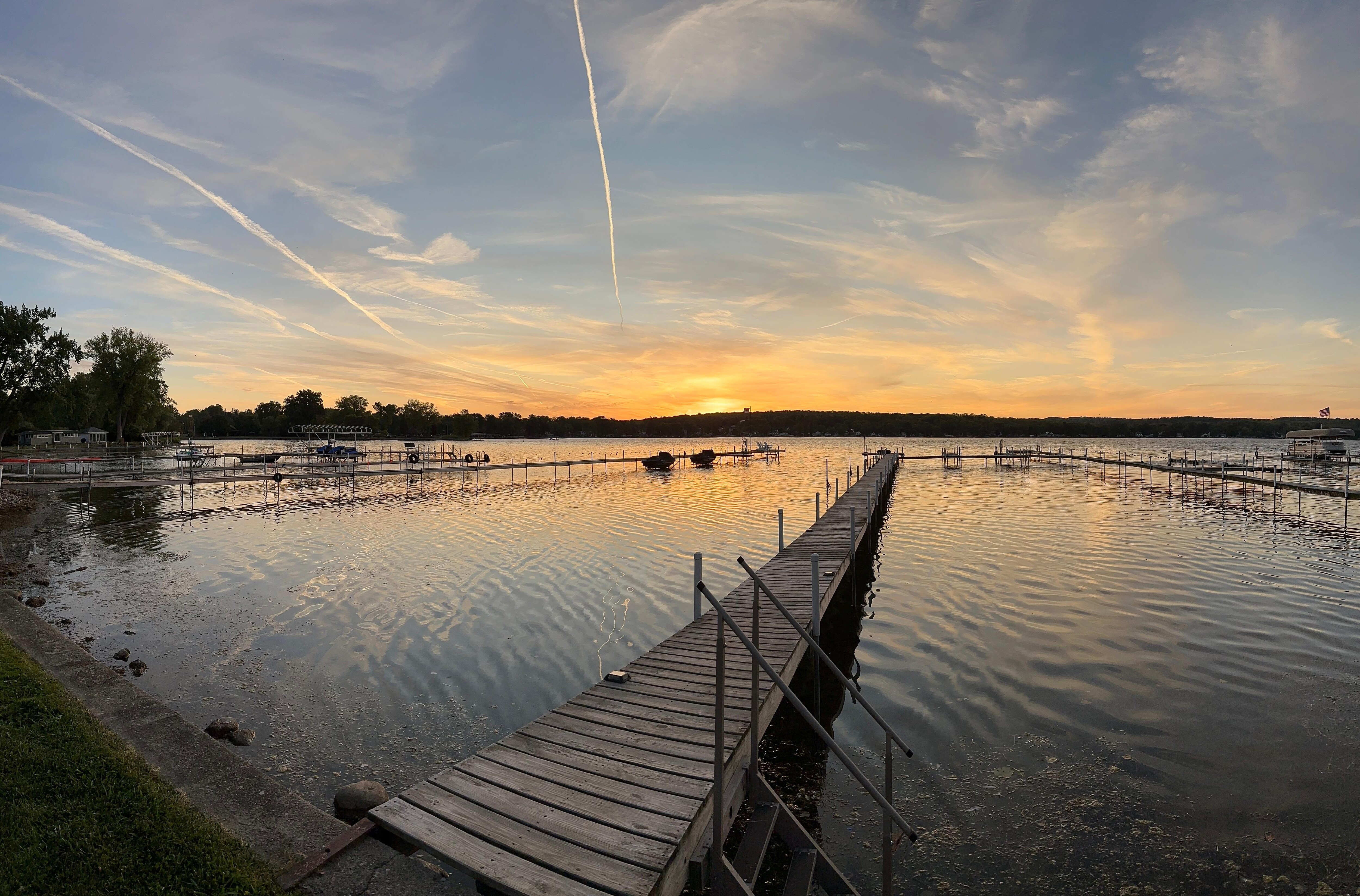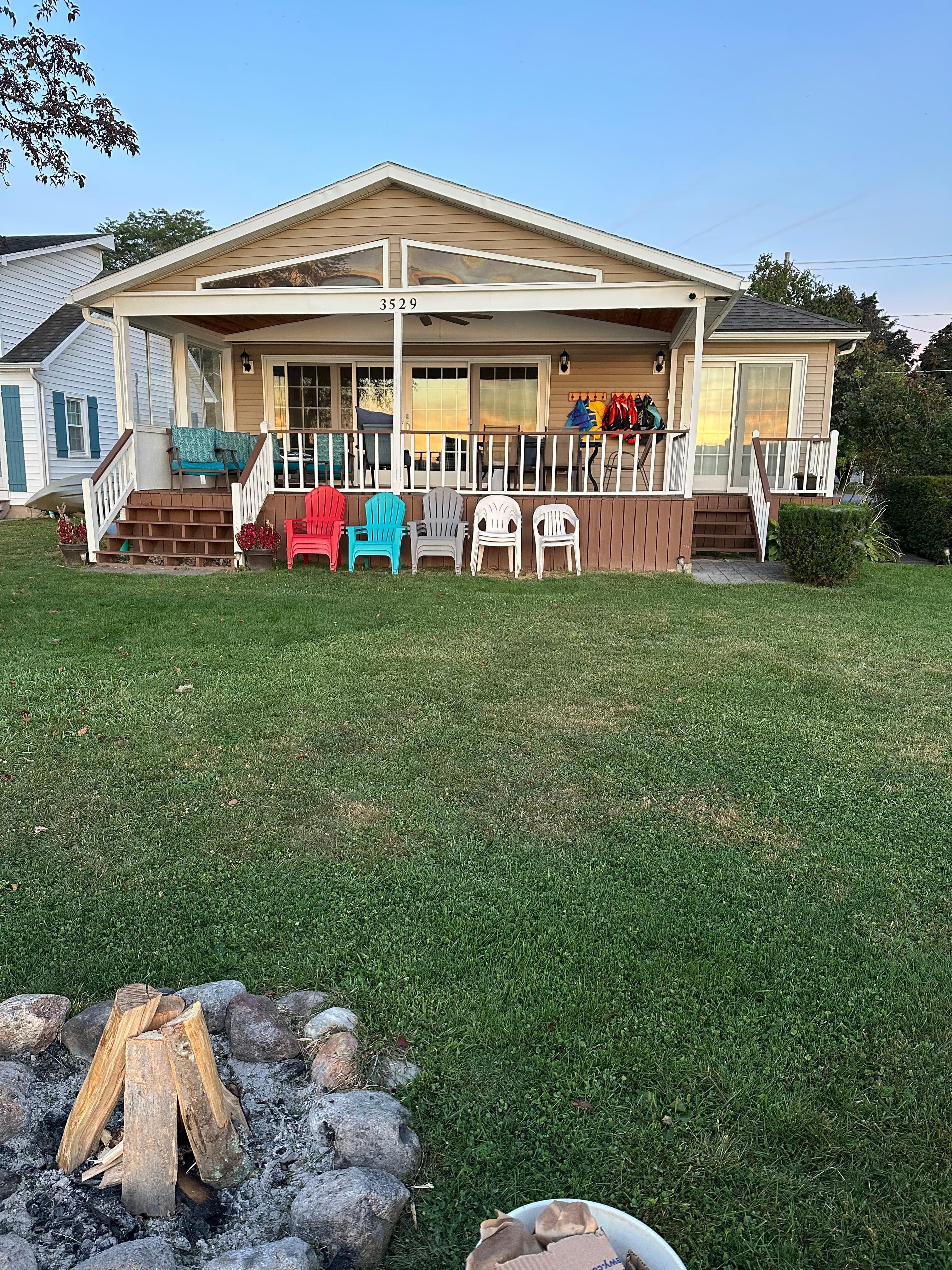 Newly remodeled 2,150 square feet cottage getaway, located on quiet Pebble Beach Road at the Northwest end of the Lake, close to everything in Lakeville. Cottage features central air/heat, 5 bedrooms and 10 beds with 3 bathrooms, beds sleep 13, couch can sleep 1 for a total of 14 overnight guests and is very well equipped. Enjoy great sunrise and sunset views of the lake from a large, covered porch deck with large fan and plenty of chairs for visitors and guests, large grass yard, and shallow water cove with a long lighted dock for swimming and fishing (fishing at the North End is excellent for Bass and panfish). Laundry room w/Samsung appliances and large fully equipped and modern kitchen with new Whirlpool appliances, including a separate wine mini fridge. Main living room with amazing views for relaxing or socializing. Flat yard with no steep hills or stairs. Driveway parks 5-6 cars. The property also has an extra refrigerator/freezer in the garage, two fishing kayaks, a stand-up paddle board, and a J1772 x 7.7kW EV charger (Tesla adapter provided). Plenty of games for kids provided, including board games, bocci and corn hole. Inquire about our 28-foot Avalon pontoon boat (capacity of 13) which may be available for rent (separate agreement and reservation required, typically unavailable after mid-September). We may make exceptions for a pet on a case-by-case basis (+$250). No large parties, quiet hours start at 10pm, no exceptions! Docks are removed early-to-mid-October and installed early-to-mid-May. No parking inside garage. Property has a Ring doorbell and chime, and four cameras (in garage, in basement, in driveway, and in backyard facing lake). No parking in road or street permitted! Additional parking at the NYS DEC Fishing Access located at 3485 Pebble Beach Road. Second alternate parking is 8 minute drive away, 5605 William J Bruckel Dr (Park and Ride Lot). Note New York State charges 8% sales tax and Livingston County charges 3% occupancy tax.