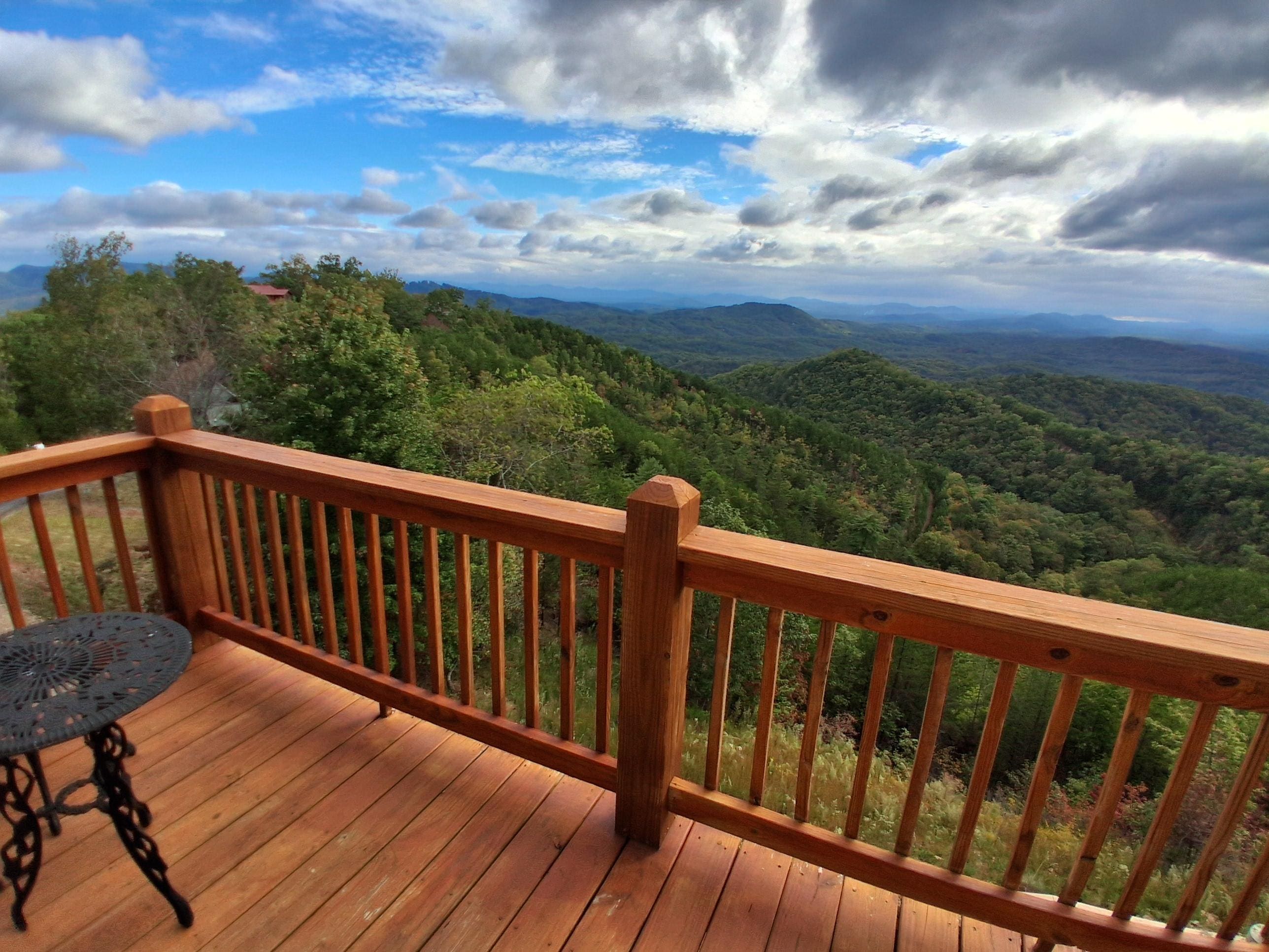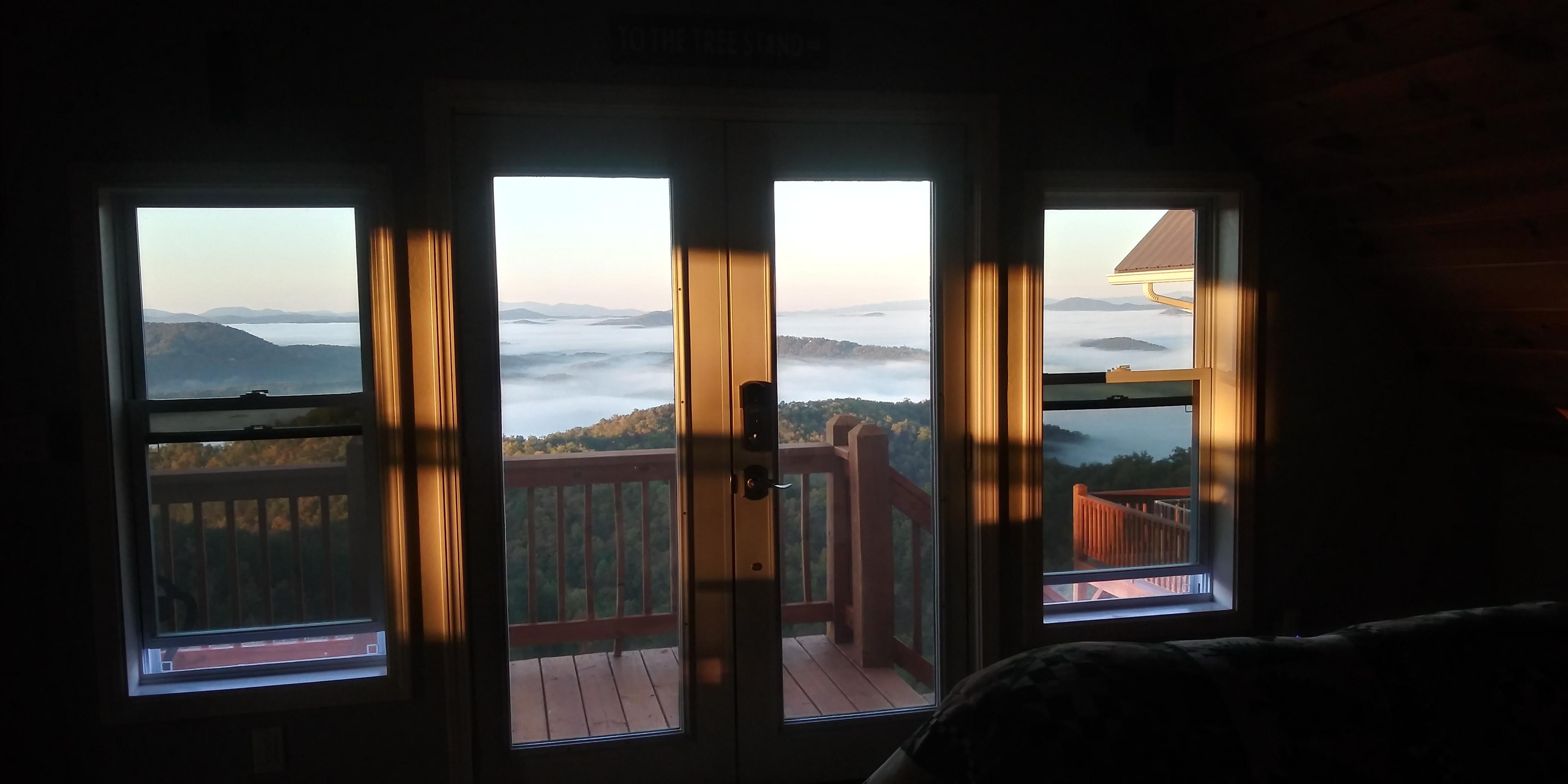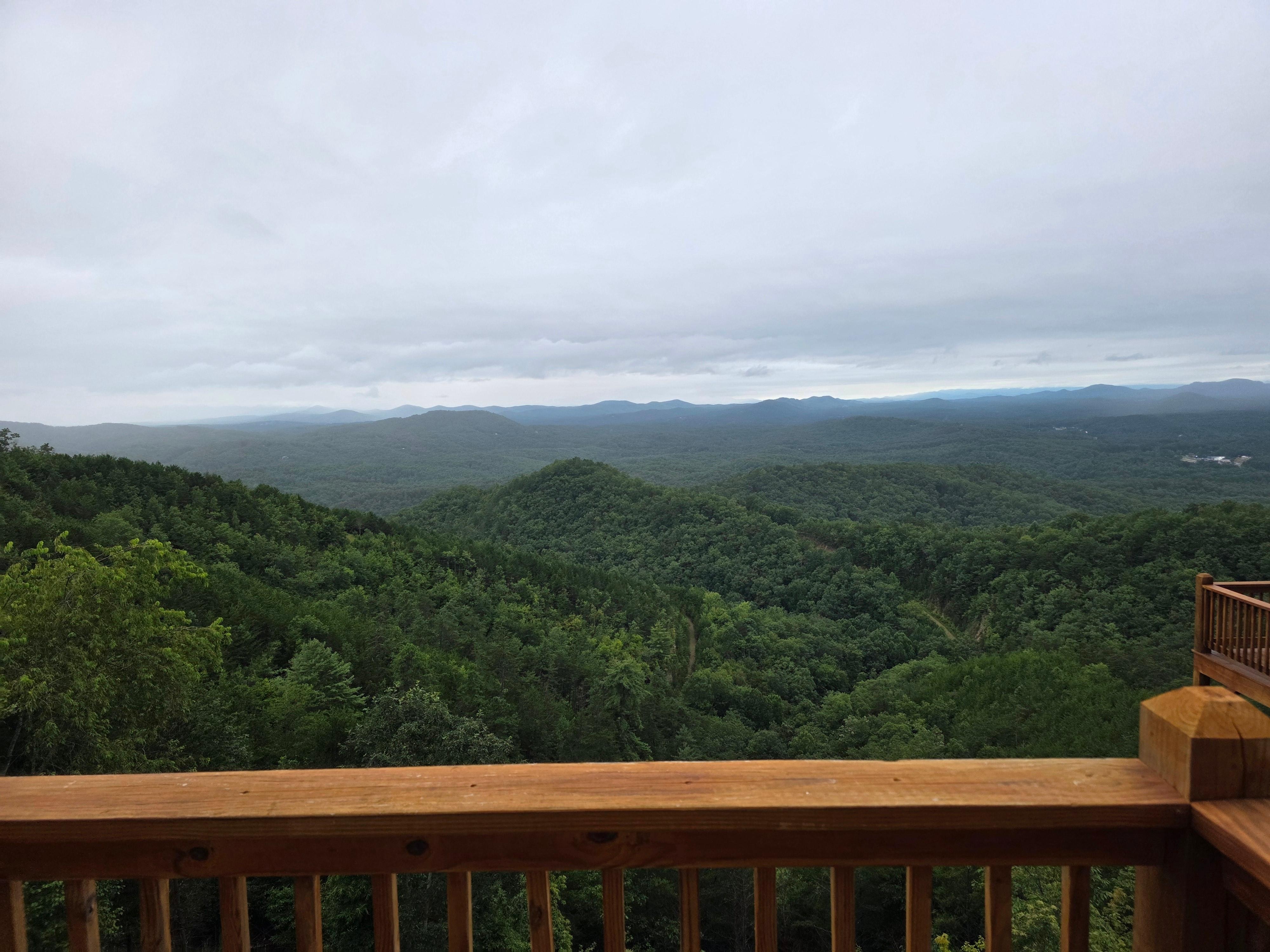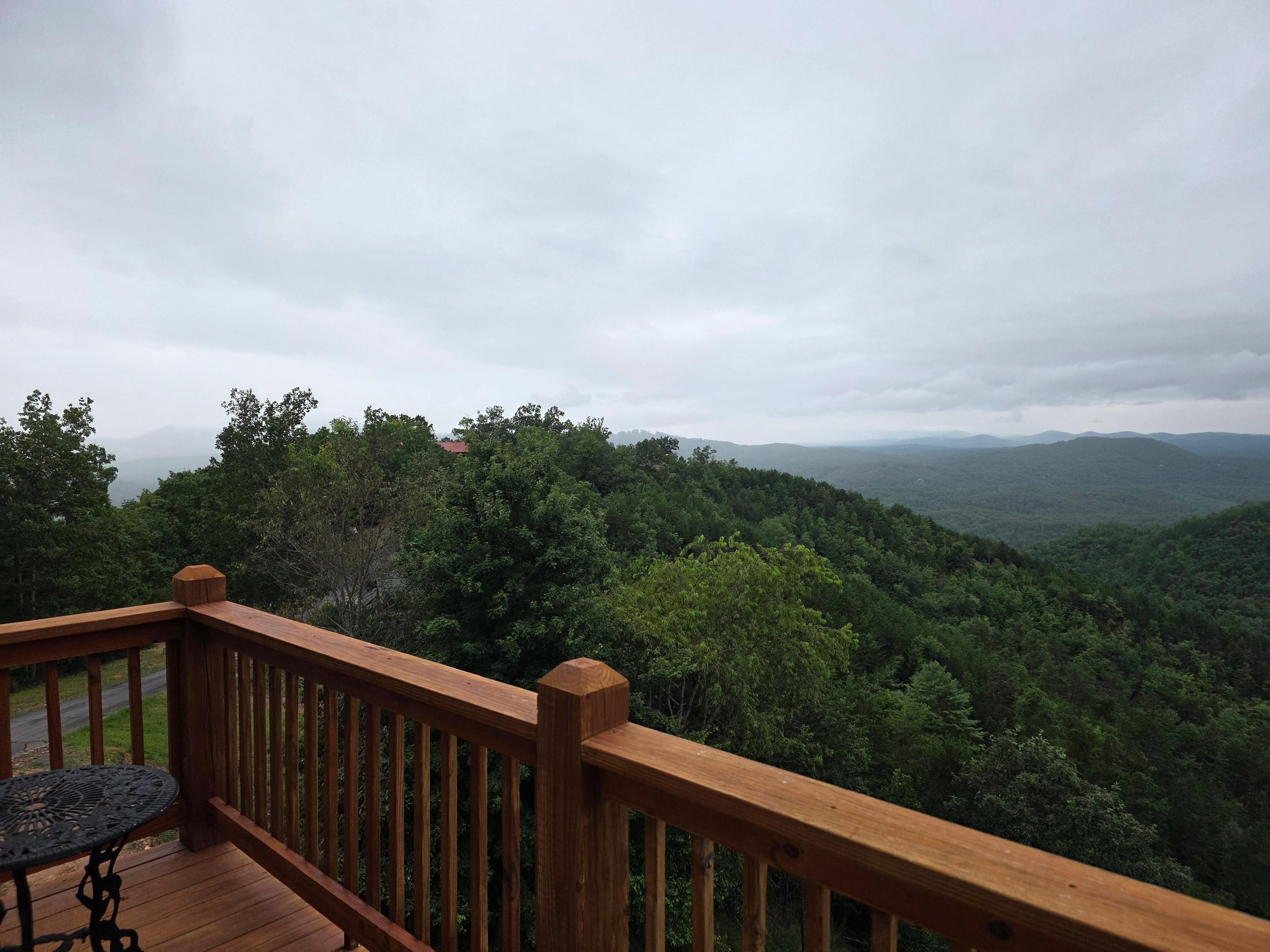 From the rear deck, it has a spectacular 165° view East to West. Seeing over 3 states (GA, NC, TN) is just the beginning. Sunrises and sunsets are totally amazing. Inside is a bit rustic yet has elegant touches. It's not heaven, but you can see it from here.